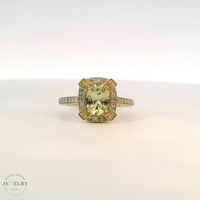 This beautiful 14k Yellow Gold Ring showcases a stunning Green Amethyst centerpiece. Bordered with petite diamonds, their sparkle extends partially onto the band, enhancing the ring's luster. The ring size is a universal seven, suitable for most fingers. Weighing 3.4 grams, it strikes a balance between durability and comfort. The combination of yellow gold and green amethyst imbues a sense of luxury and uniqueness, making this piece a striking accessory for any outfit or occasion. The small diamonds encapsulate microcosmic universes, adding to their charm and elegance.