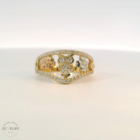 This 14k Yellow Gold Tri-Color Lucky Symbol Ring is a stylish expression of good fortune. Adorned with various symbols of luck, this piece offers a unique blend of elegance and positivity. The design is further embellished by cubic zirconia stones embedded around the ring, adding a glamorous sparkle. Offered in a size 7.5, the ring weighs 3.6 grams, making it substantial yet comfortable to wear. This piece not only enhances beauty but also invites luck into your life, making it a unique addition to your jewelry collection.