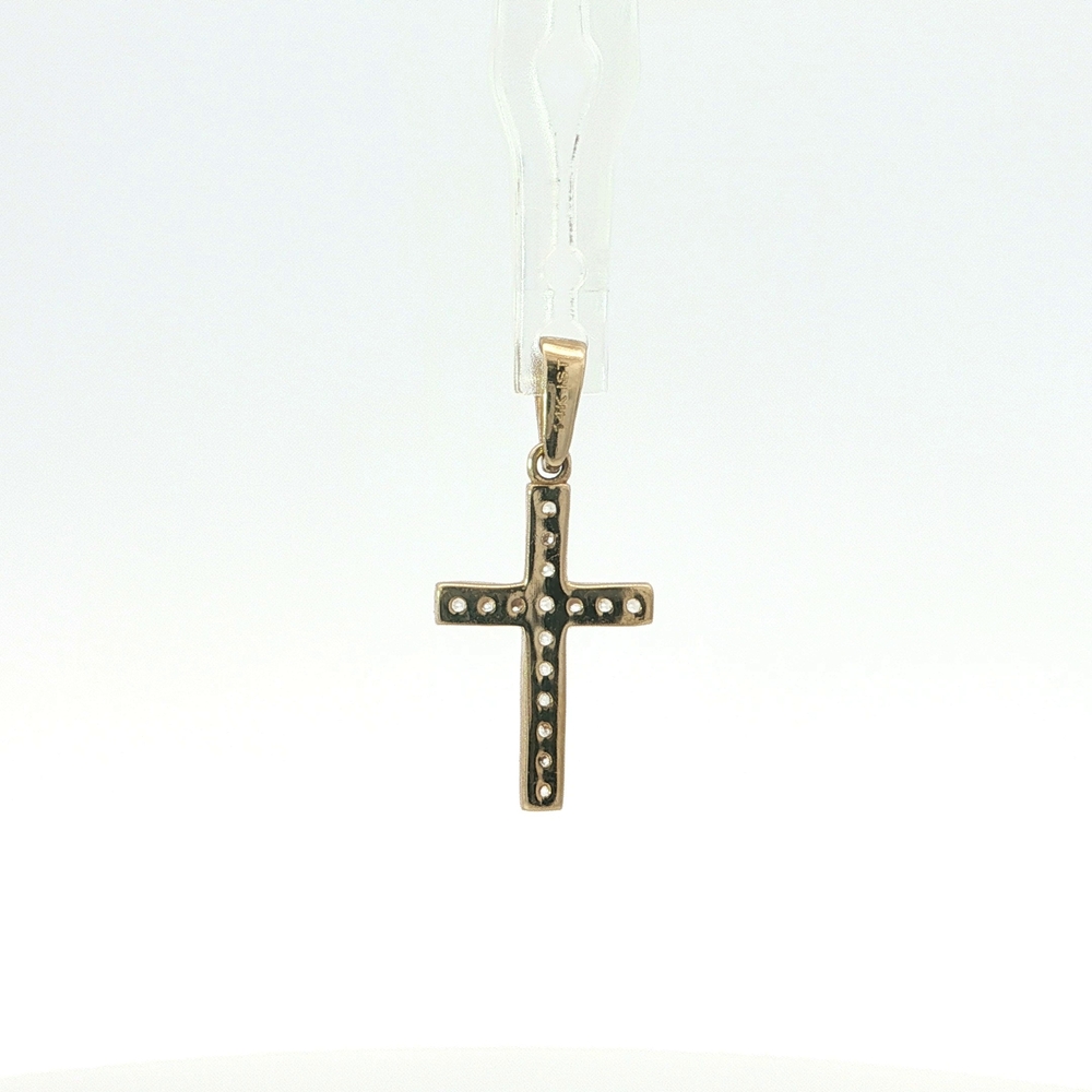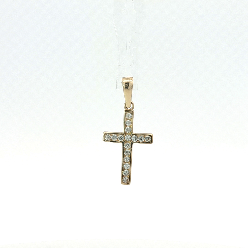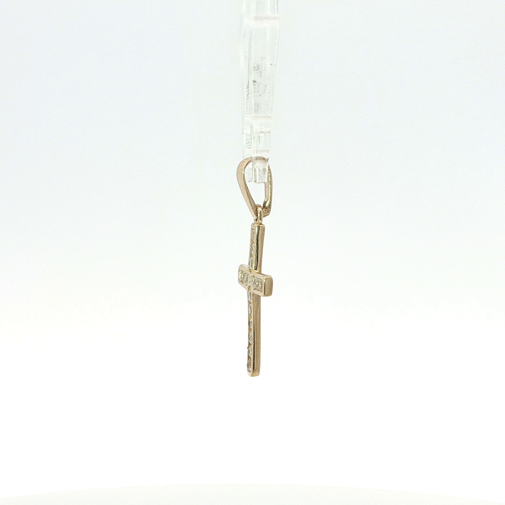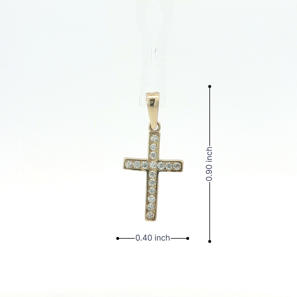 This 14k Channel Set Cross is an exquisite piece of jewelry that features cubic zirconia, adding a touch of sparkle to your accessory collection. Weighing just 0.6 grams, with dimensions of 0.90 inches by 0.40 inches, it is both elegant and comfortable to wear. This radiant cross showcases the channel setting technique, which beautifully secures the cubic zirconia and enhances their natural brilliance. Its timeless design, combined with high-quality gold and gemstones, makes it an ideal choice for all jewelry enthusiasts.