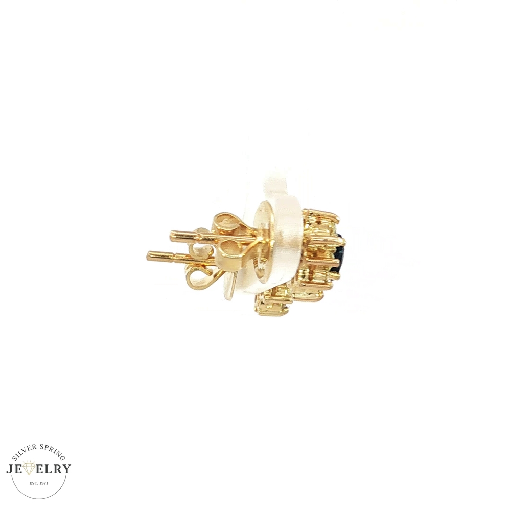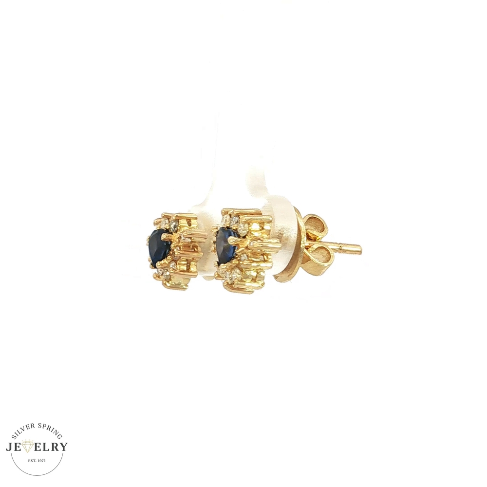 These elegant earrings feature a 14kt yellow gold setting, adorned with sixteen 0.01 ct round brilliant cut diamonds and four 0.02 ct baguette diamonds, all showcasing G-H color and SI2-I1 clarity. The design is further enhanced by two 0.35 ct heart-shaped sapphires, creating a stunning cluster effect. Weighing approximately 3.40 grams, these earrings beautifully blend classic sparkle with vibrant sapphire hues, making them perfect for adding a touch of sophistication to any ensemble.
