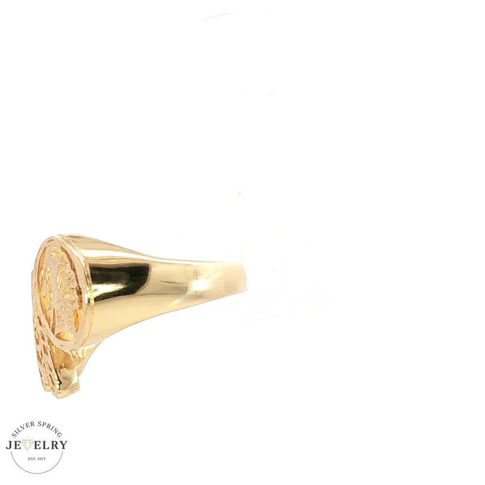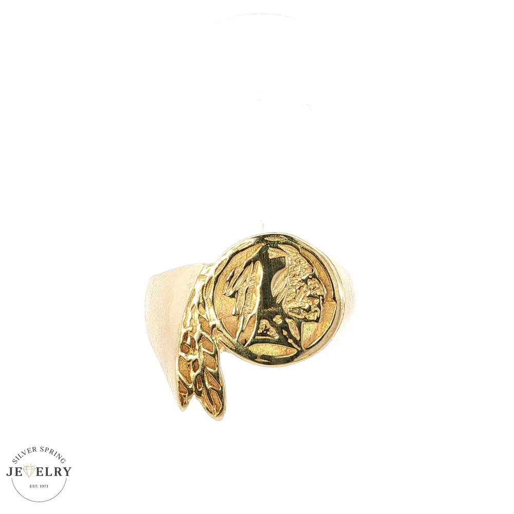 Presenting a 14k signet ring with Native American designs. Crafted with precision, this 8.5-gram ring showcases exquisite detailing. The ring, well suited for both special occasions and everyday wear, possesses a stunning aesthetic charm. With a size specification of 10.5, it promises a comfortable fit. This tasteful piece of jewelry combines tradition and elegance for a stylish statement. Its quality craftsmanship ensures durability, making it a perfect addition to any jewelry collection.