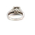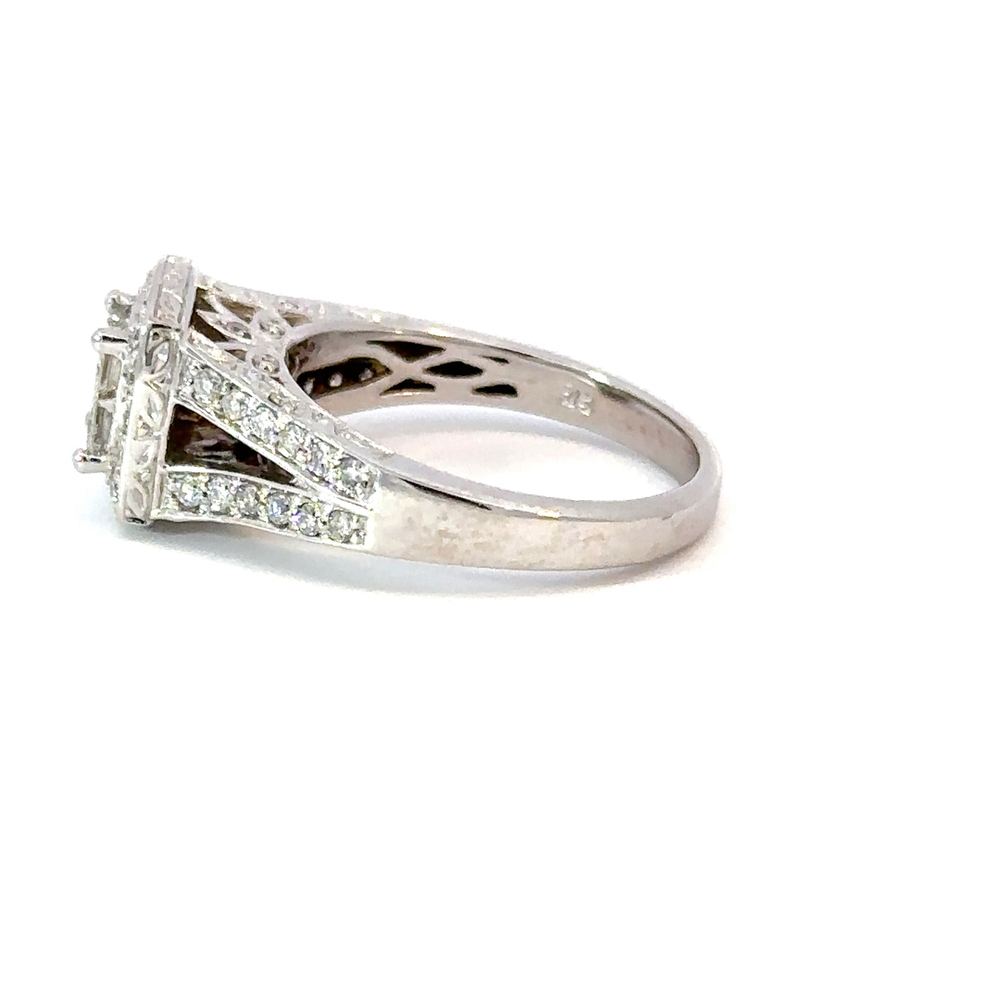 This elegant 14kt white gold engagement ring weighs 4.90 grams and is a size 7. It features a stunning split shank design and is adorned with 46 round G-H color, SI1 clarity diamonds, each weighing 0.02 carats, along with four invisible-set princess-cut diamonds, each weighing 0.10 carats. With a total diamond weight of 1.32 carats, this ring radiates exquisite charm, making it a perfect symbol of commitment and love. The near-colorless diamonds enhance their allure, ensuring they remain as timeless and enduring as your affection. Treat your beloved to this stunning piece and witness the sparkle in their eyes.
