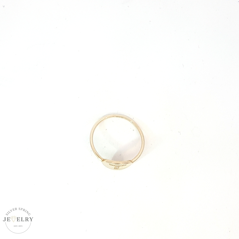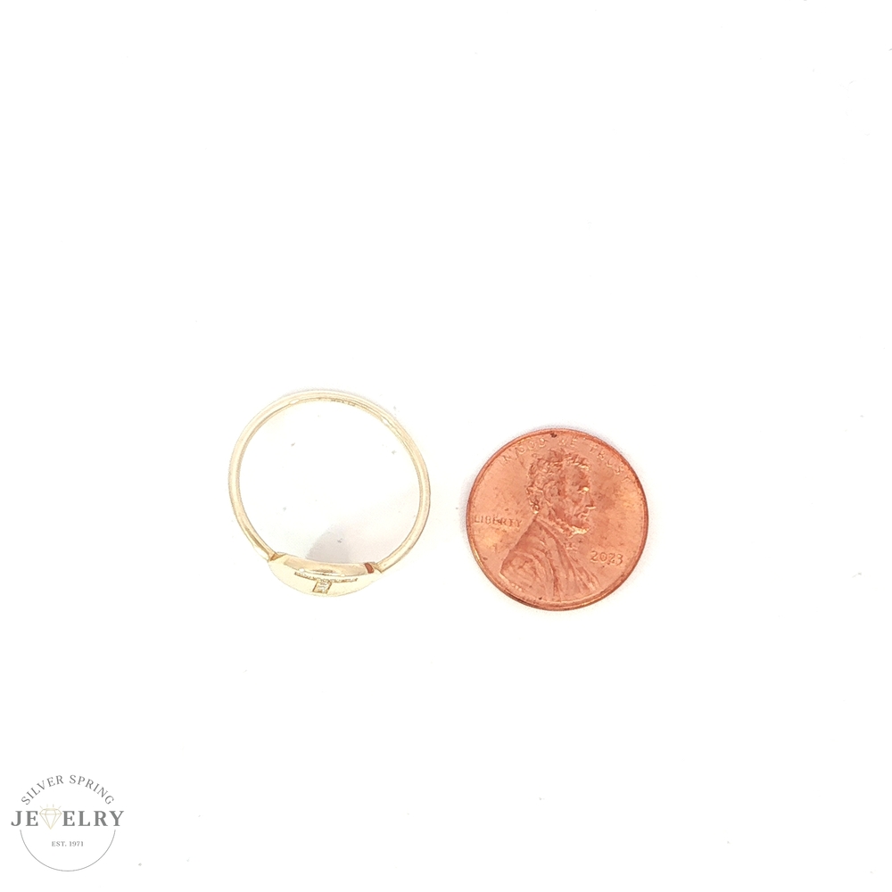 This 14k Yellow Gold Initial 'T' Ring shows your unique style. It's beautifully crafted with a 'T' design and embellished with sparkling cubic zirconia stones for added elegance. This piece weighs a comfortable 1.7 grams, which makes it lightweight for everyday wear. Sized at 9, it provides a snug fit for most regular-sized fingers. This exquisite ring makes a perfect personal statement or a unique gift for a loved one.