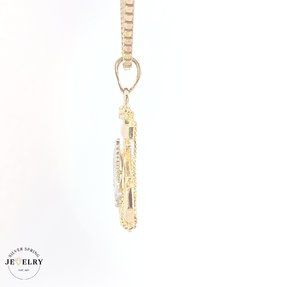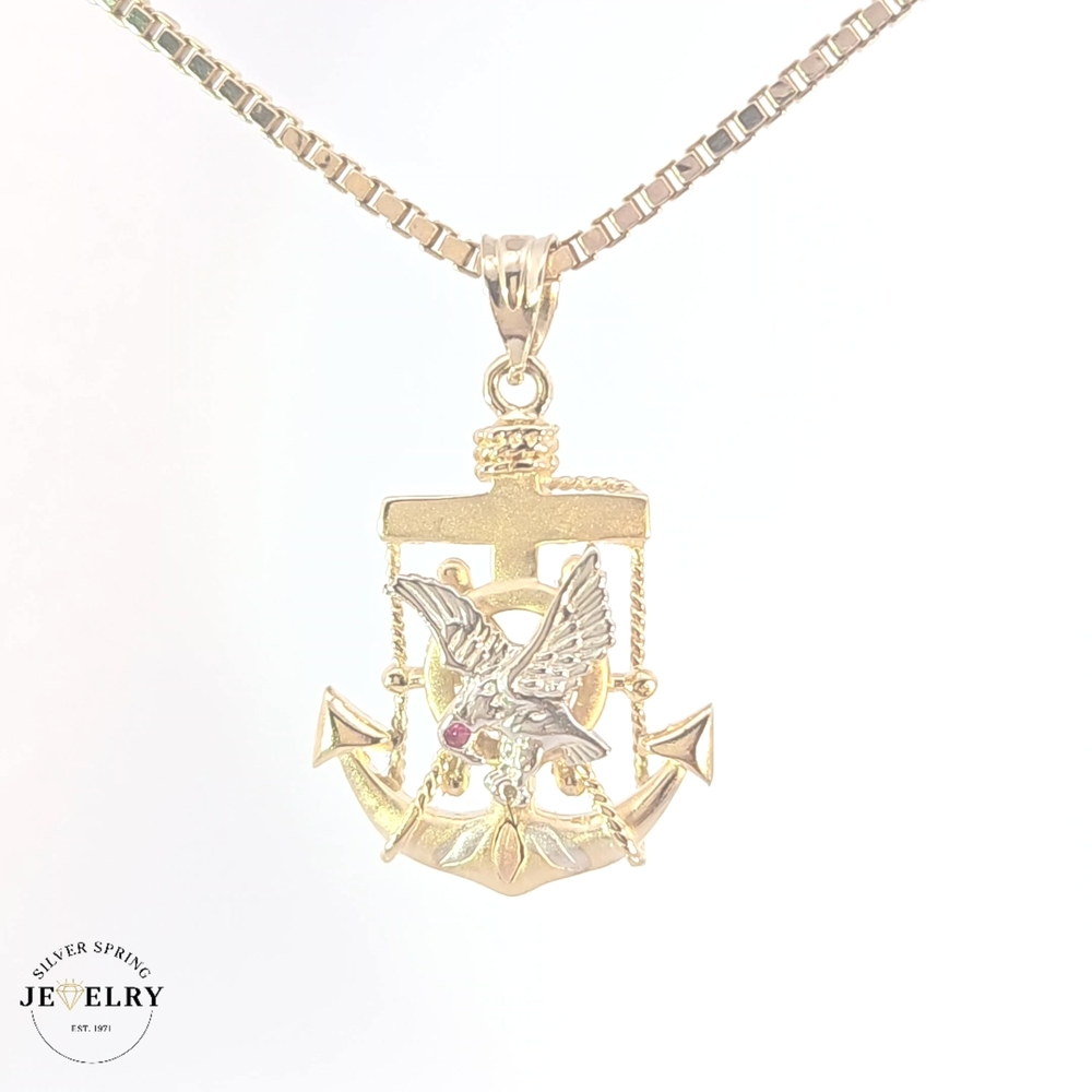 Experience sheer elegance and attention to detail with this Anchor & Eagle Pendant. Crafted from pure 14kt gold, it weighs a substantial 4.10 grams, ensuring its durability and longevity. The pendant has a well-defined width of 20mm and a length of 1, making it a perfect size for everyday wear. The unique two-tone design beautifully merges class and novelty, promising to be a valuable addition to your jewelry collection.