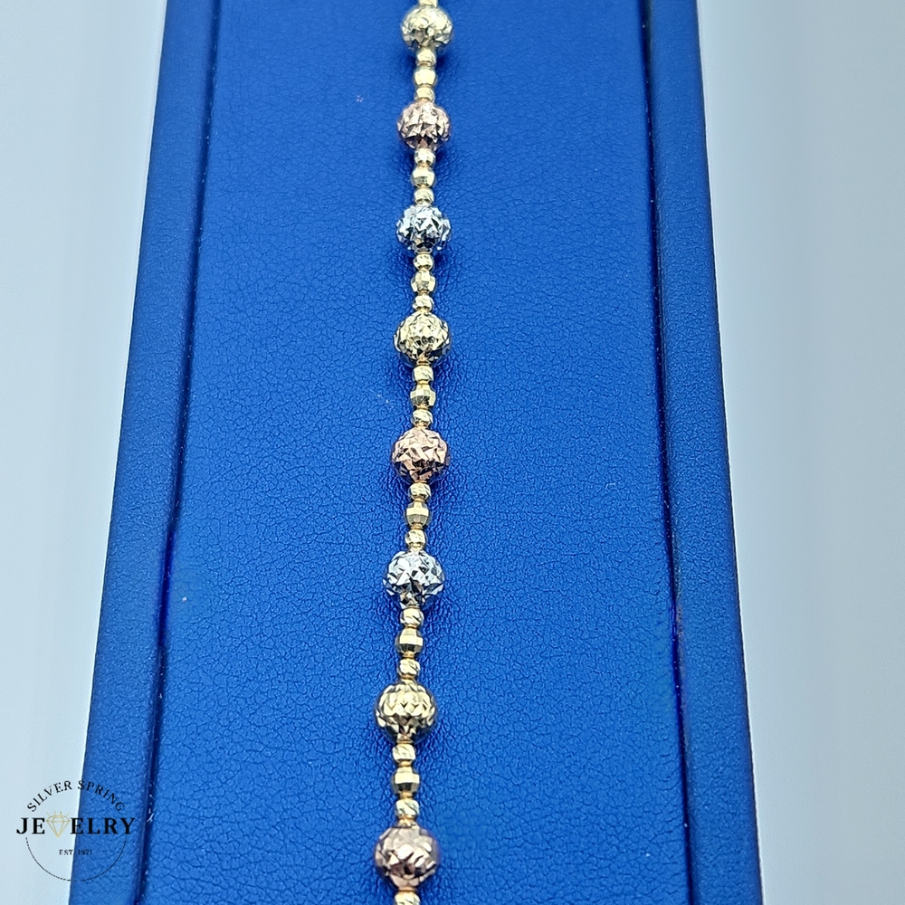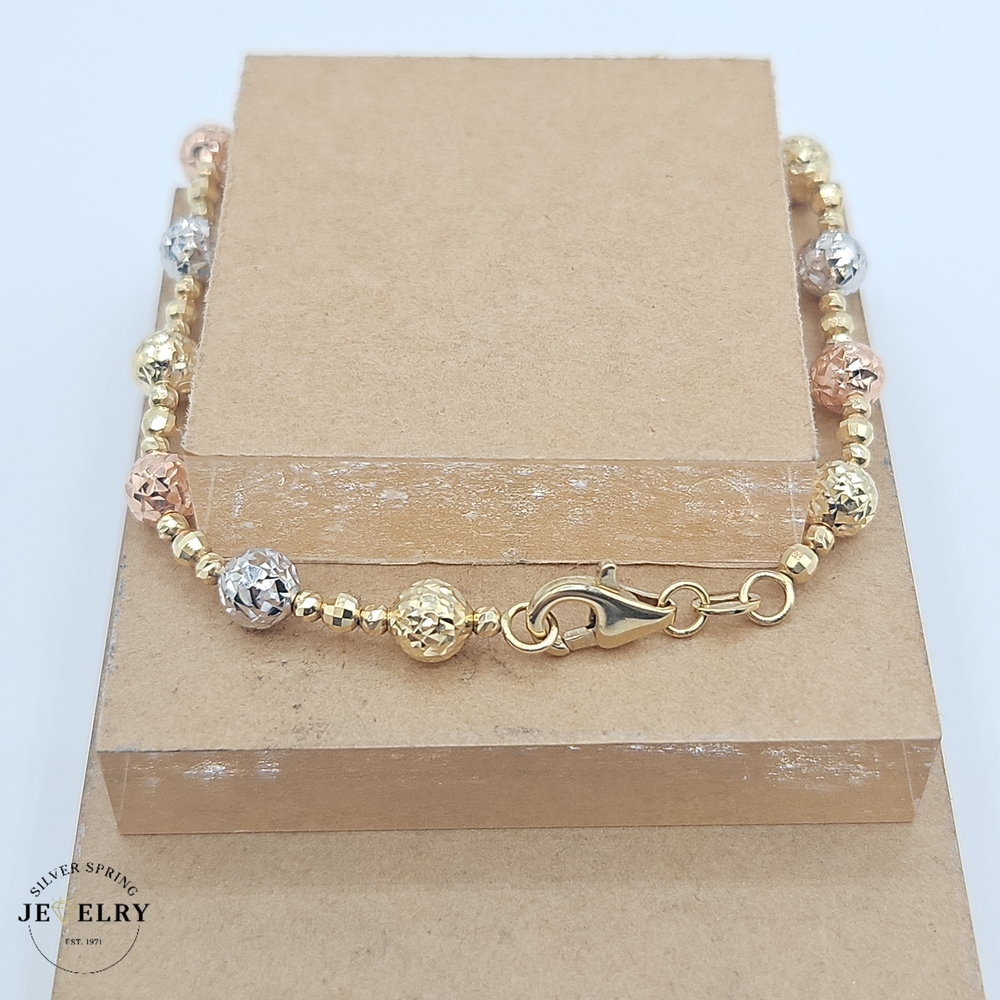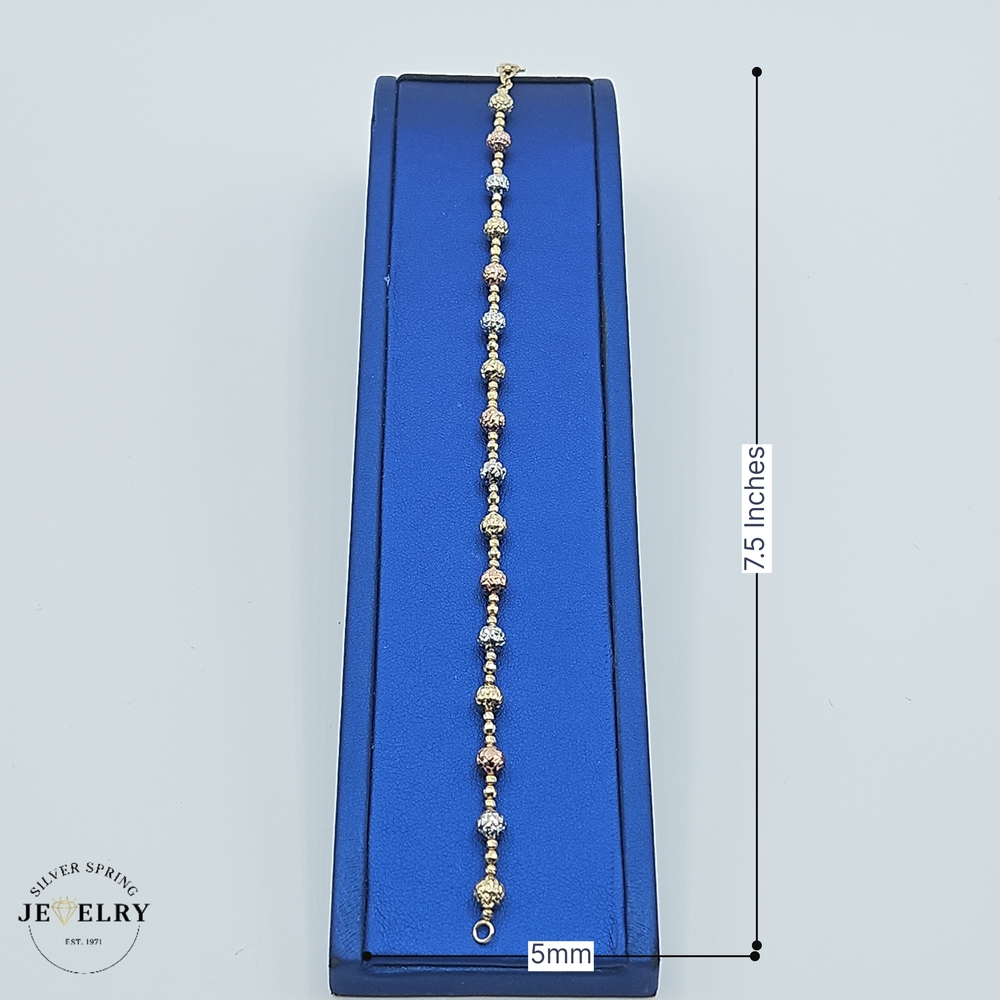 This exquisite tricolor beaded bracelet, weighing 4.0 grams, is expertly crafted from 14kt gold for a durable, opulent look. Measuring at a length of 7.5 inches long a 5mm wide, it provides a perfect fit for any occasion. Emphasizing its sparkle, the bracelet exhibits a flawless diamond cut. This fine piece of jewelry embodies elegance and sophistication, making it a timeless accessory staple.