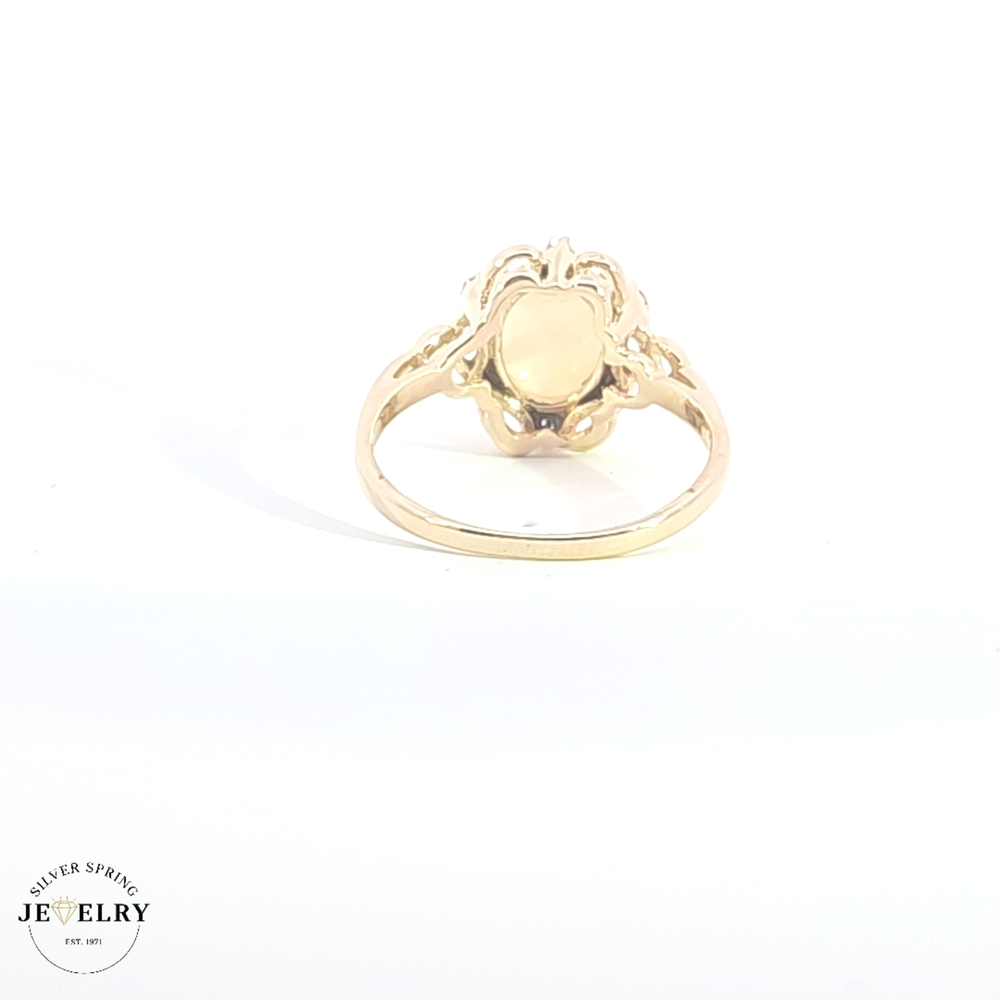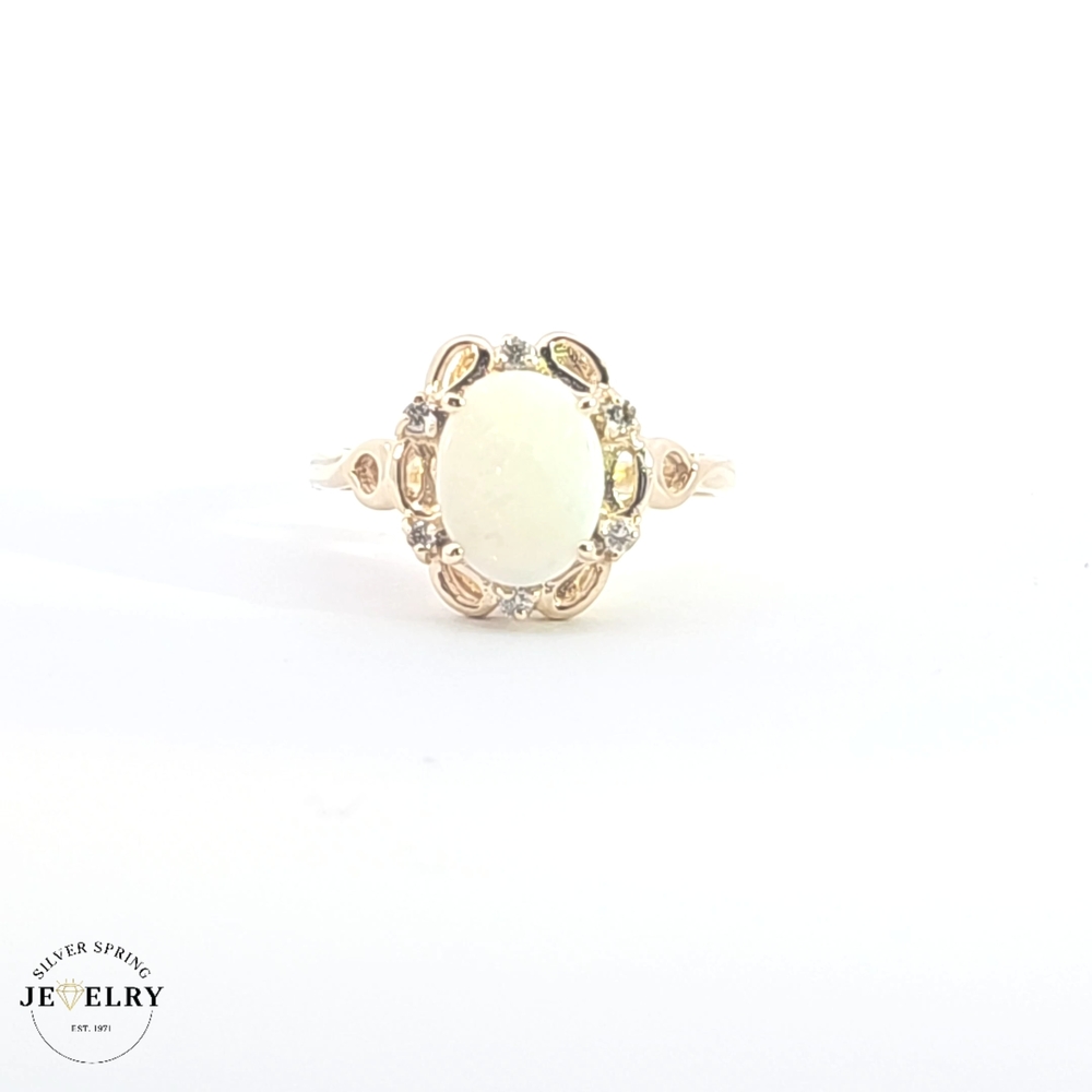 Experience a blend of class and elegance with this opal and diamond ring. Weighing 3.0 grams, it is beautifully crafted from 14kt gold for a luxurious look. The ring boasts a stunning opal center, encircled by sparkling diamonds for a radiant finish. It is available in size 7 1/4, thus making a perfect fit for most fingers. This fine jewelry piece promises durability and a timeless style that will add charm to any outfit.
