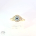 This 14kt Blue Evil Eye Ring, weighing 1.60 grams and size 8 1/4, is a sophisticated and stylish addition to any ensemble. Adorned with exceptional zirconia, it's a striking representation of protection and femininity. The evil eye motif, symbolizing protection against negativity and harm, gives this piece a significant, yet fashionable vibe. Add an elegant touch to your jewelry collection with this blue evil eye ring.