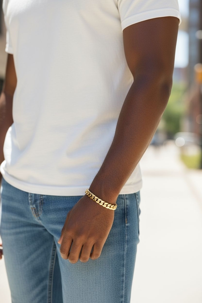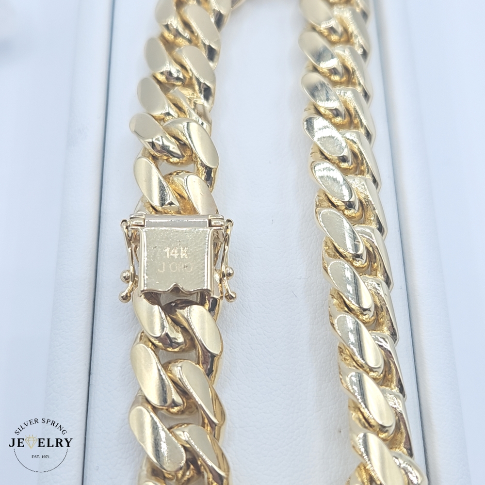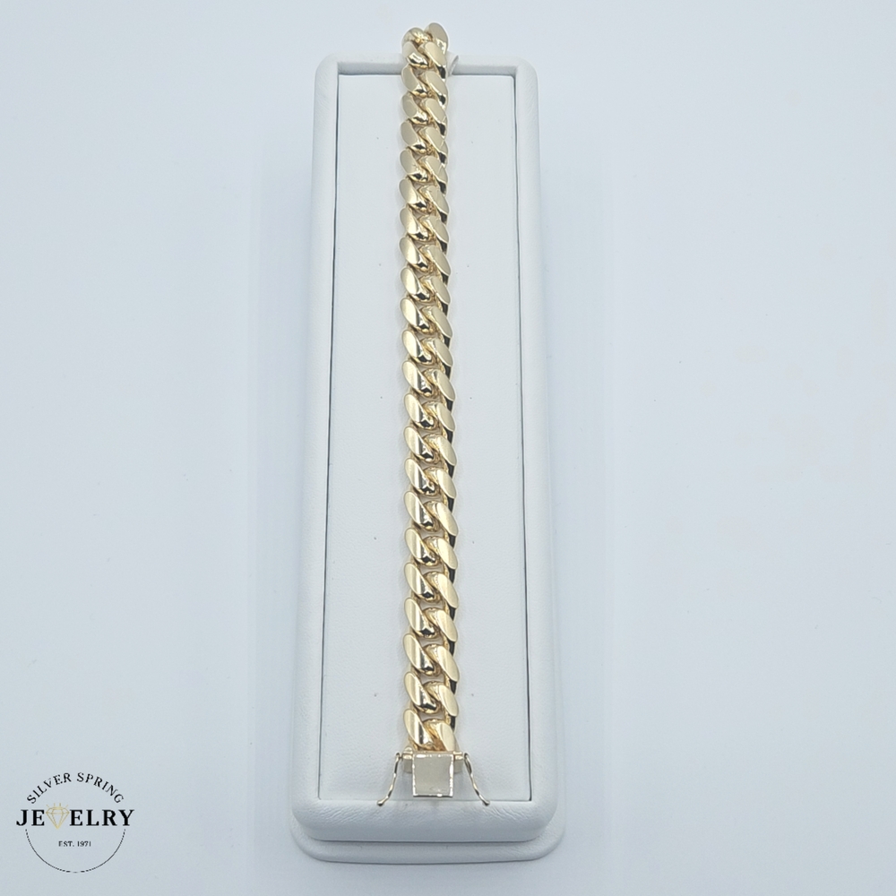 This exquisite Cuban bracelet, made from premium 14kt gold, is a stunning testament to refined elegance and style. Weighing in at a substantial 92.1 grams, this is a testament to quality jewelry. The stylish piece has a width of 11mm, ensuring a bold and eye-catching presence on your wrist. With a length of 9 inches, it comfortably fits most wrist sizes. The classic design makes it a perfect accessory for any occasion. Embrace luxury and make a statement with this dashing Cuban bracelet.