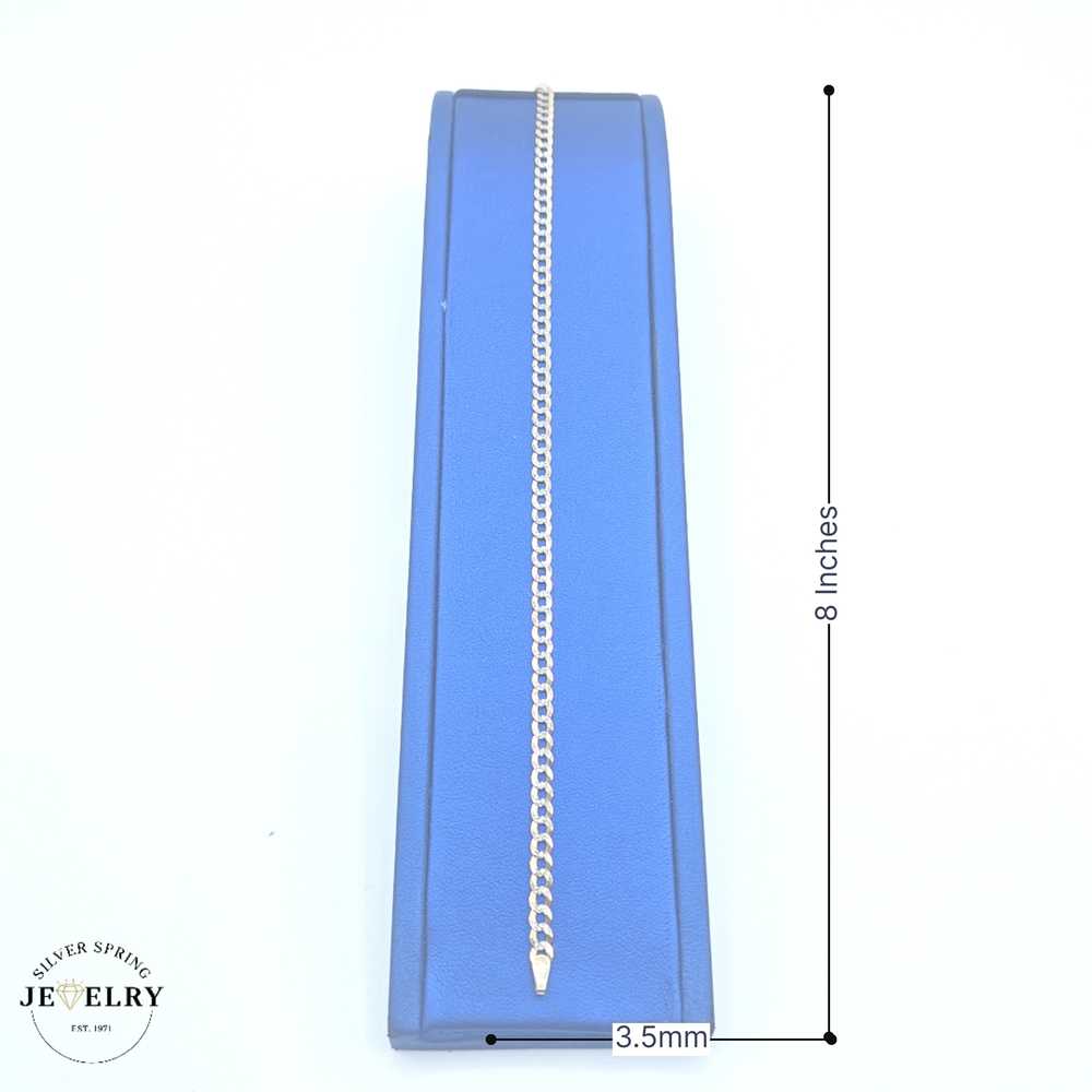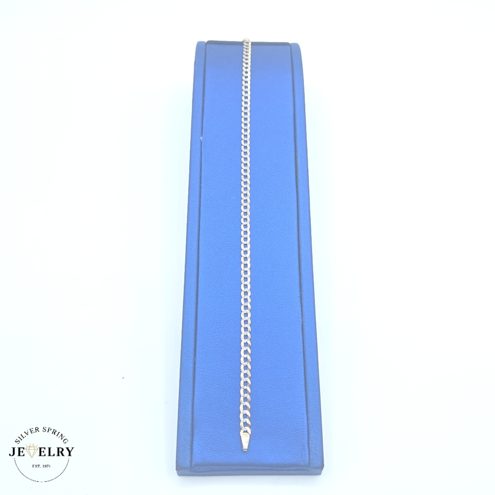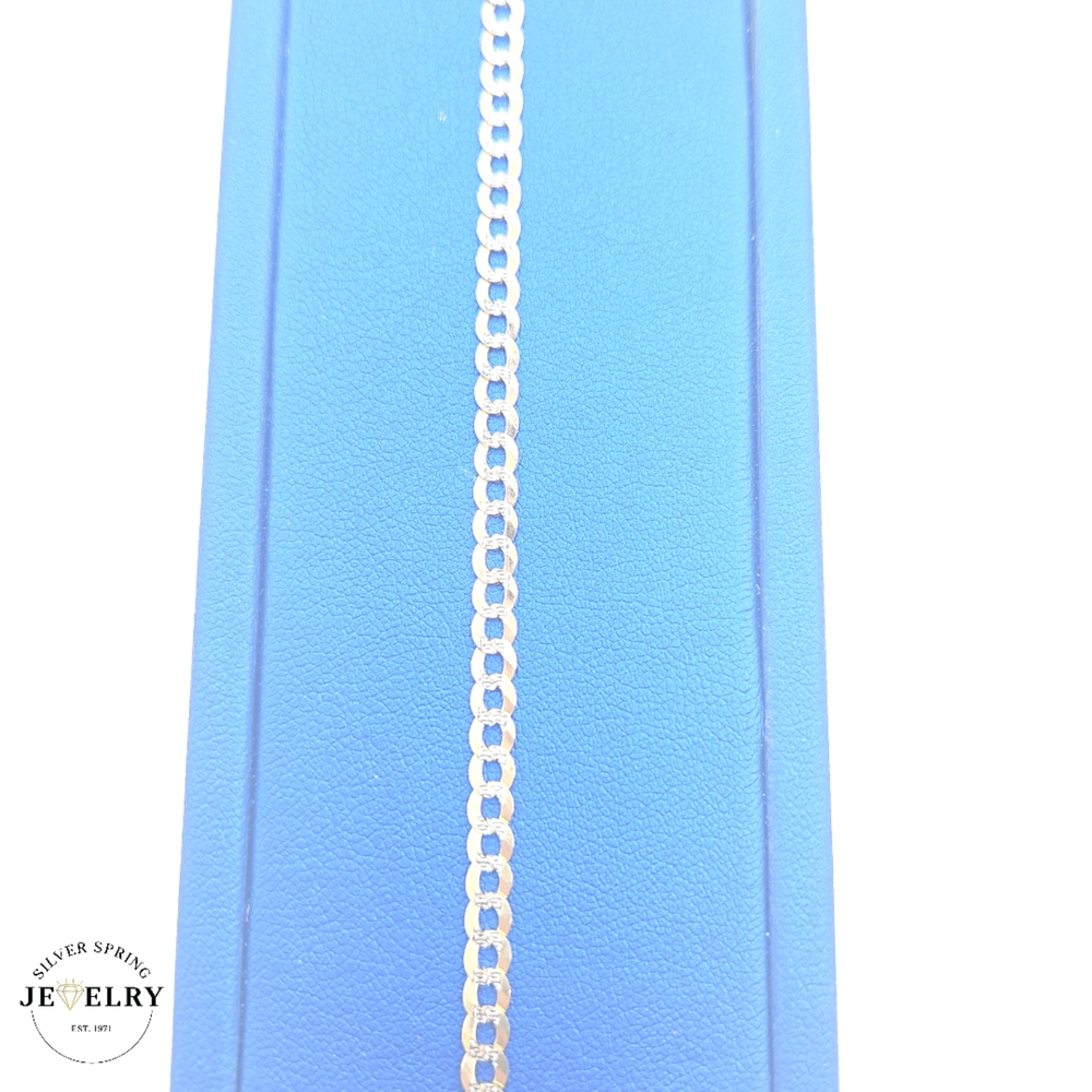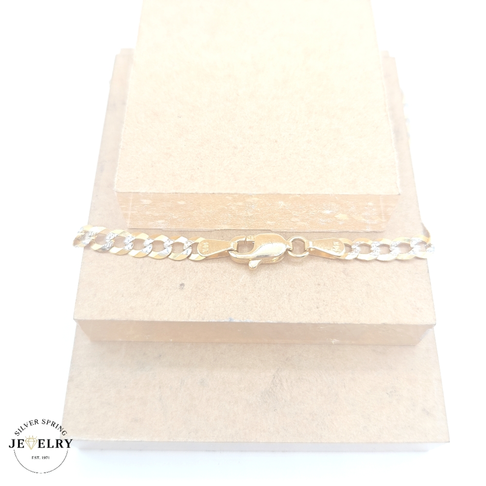Add a touch of luxury to your look with our 14kt two-tone curb link chain. Weighing 3.10 grams, this high-quality necklace is designed for durability and long-term wear. Boasting a width of 3.4mm and a length of 8 inches, it is versatile enough for both casual and formal outfits. The two-tone design adds a unique detail that effortlessly complements other jewelry. Experience the perfect balance of style and comfort with this lightweight, yet sturdy, curb link chain.