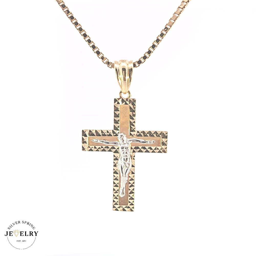 This Diamond Cut Crucifix, forged from stunning 14kt two-toned gold, presents a beautiful testament of faith. Weighing 3.2g, it displays exceptional craftsmanship and a radiant shine. The crucifix measures 1.25 in length and a 6mm width, making it a subtle yet impactful piece. This intricate, diamond-cut design is a unique blend of modern style and traditional spirituality. Perfect for everyday wear or as a heartfelt gift, it symbolically melds divine love and the beauty of fine jewelry.