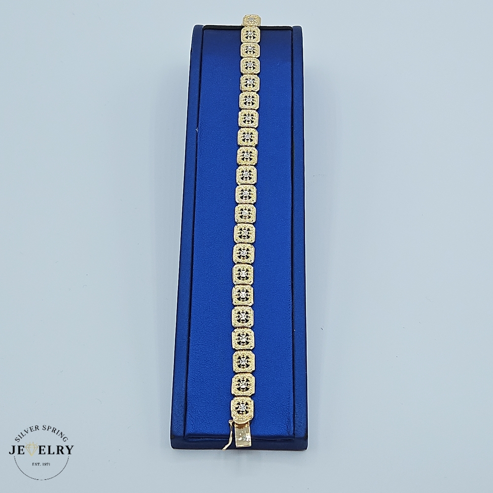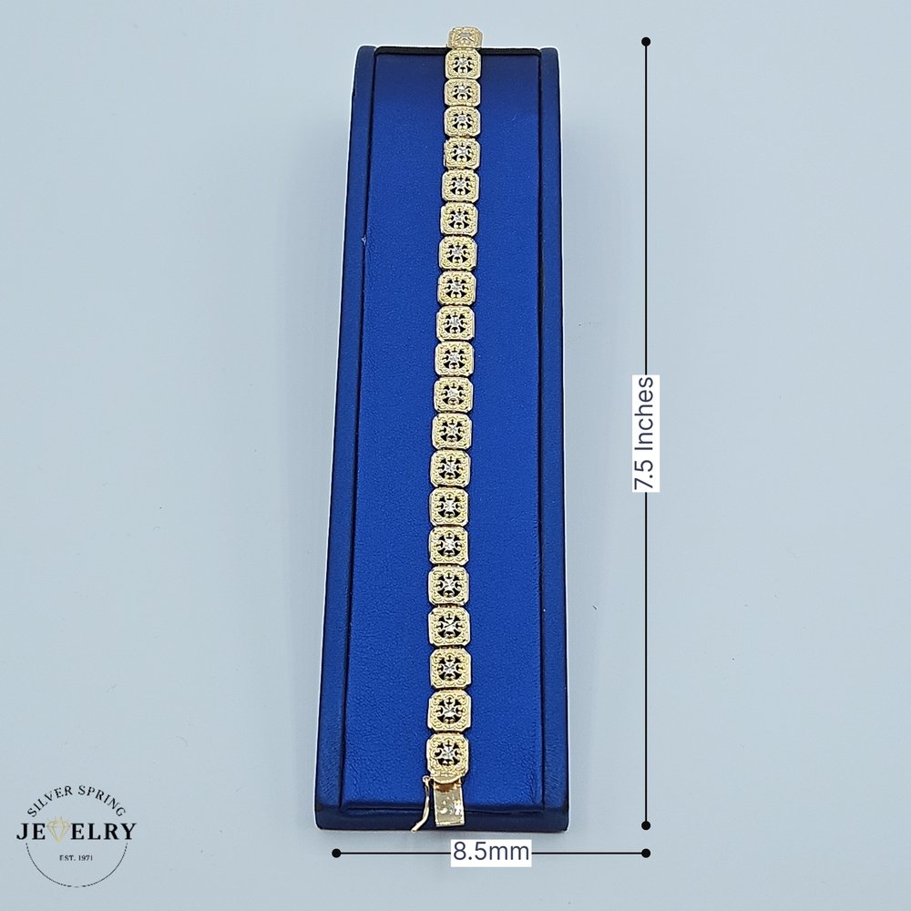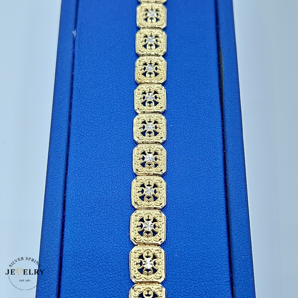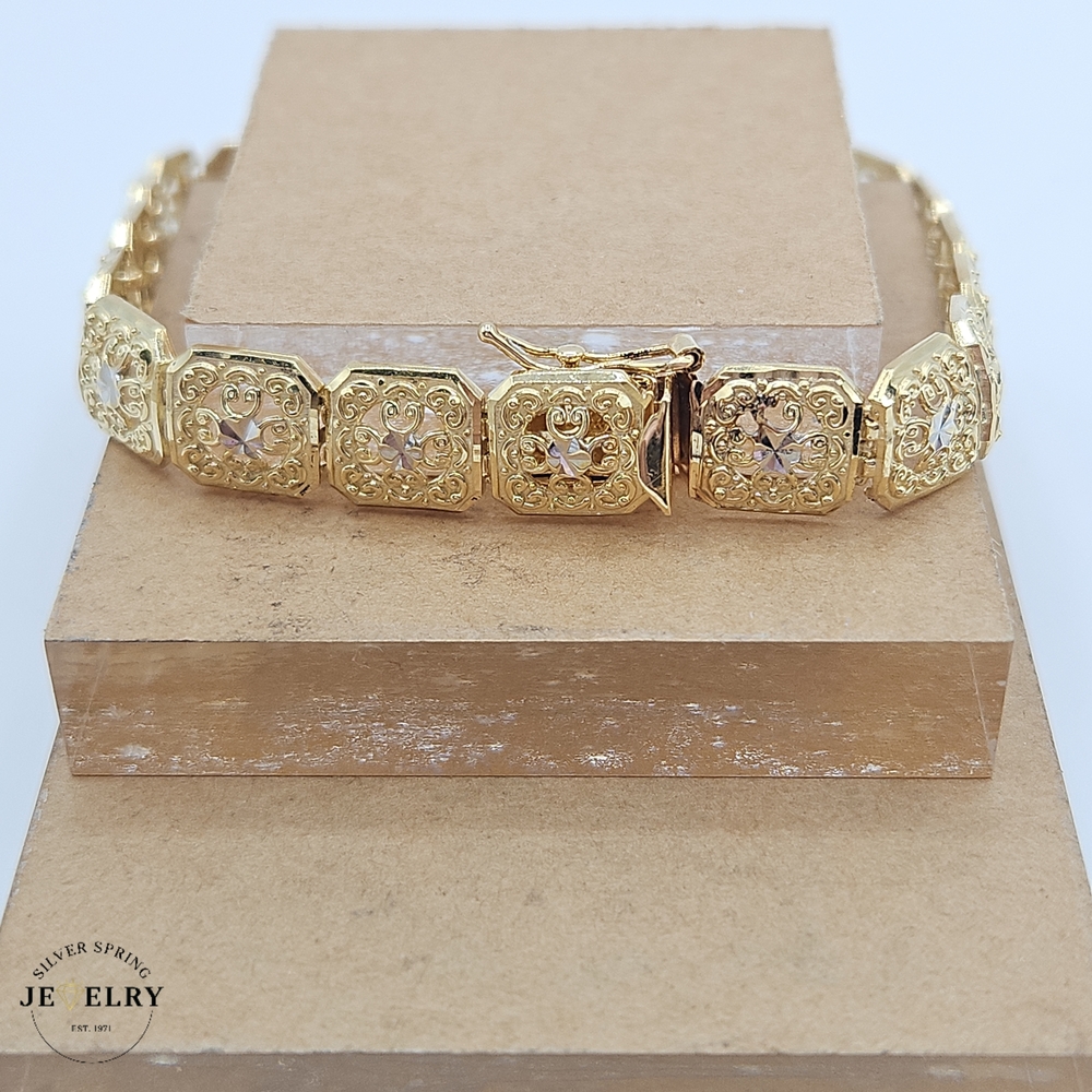 Featuring delicacy and intricacy, this stunning Filigree Bracelet, weighing 11.30 grams, is crafted from optimal-quality 14kt gold. Its masterful design and craftsmanship are remarkable, showcasing the desirable finesse of filigree artistry. Its width measures 8.5mm, ample to exude grandeur without being overpowering, and its length is 7.5 inches, ensuring a perfect fit around your wrist. The bracelet seamlessly combines elegance and robustness, making it the epitome of beauty and durability.