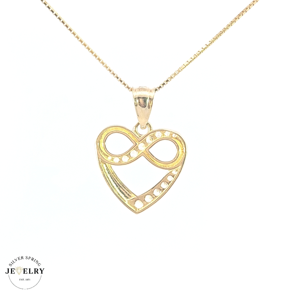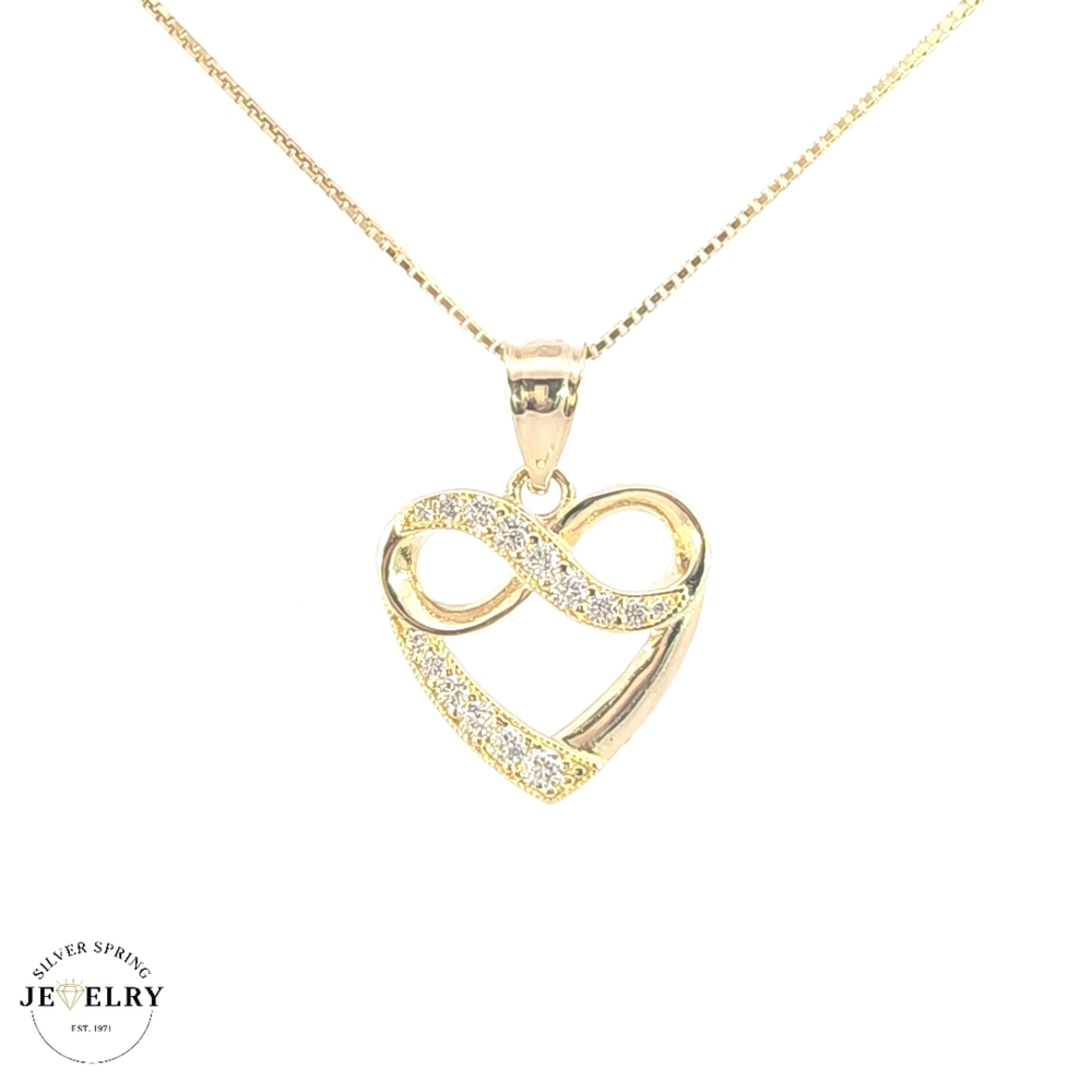 Crafted with 2.20 grams of 14KT gold, this Heart Infinity pendant sports a timeless design fused with modern elegance. It measures 18mm in width and 1 inch in length, making it an ideal centerpiece for any necklace. The pendant is embellished with dazzling zirconia, adding a touch of sophistication to your wardrobe. Express your everlasting love with this beautiful Heart Infinity pendant.