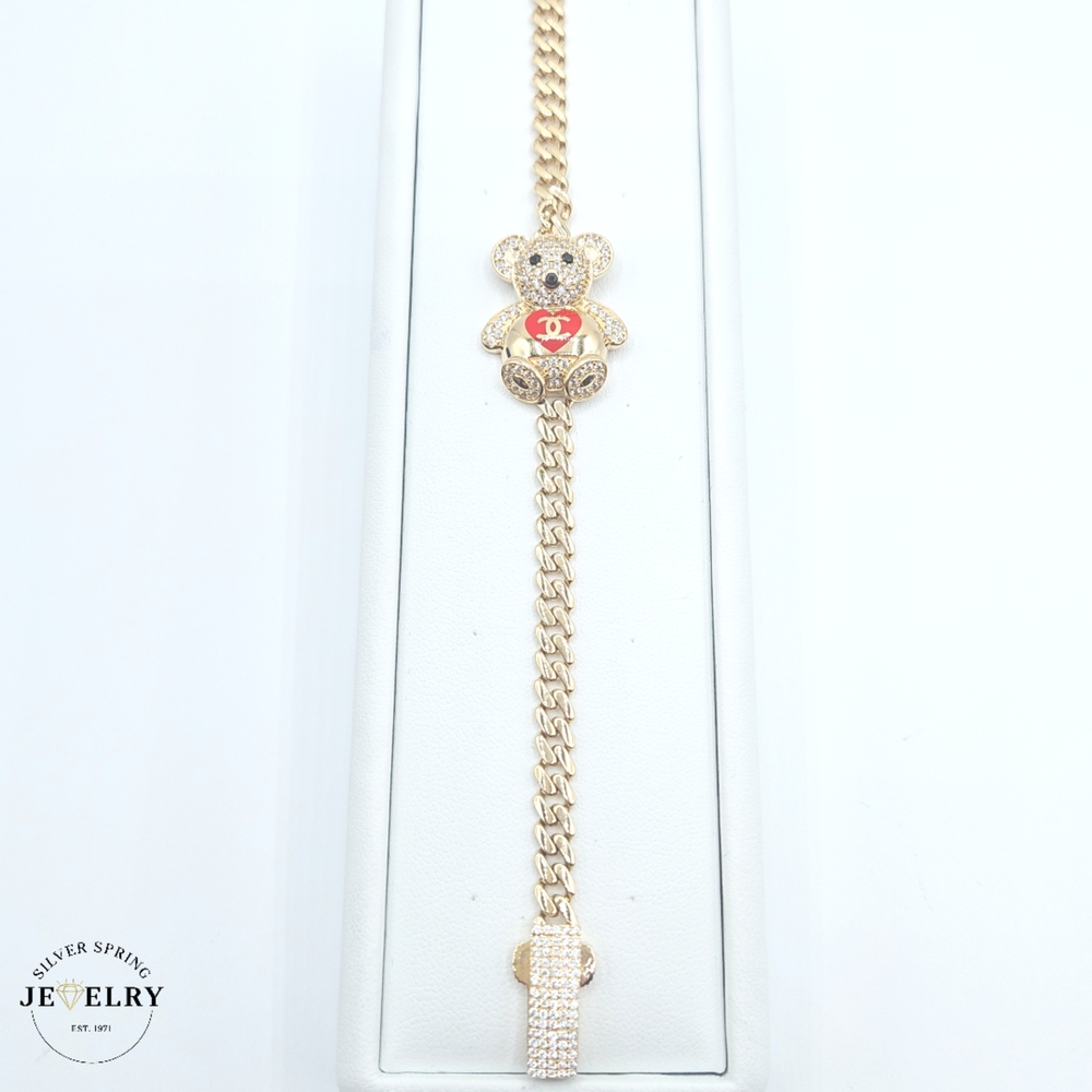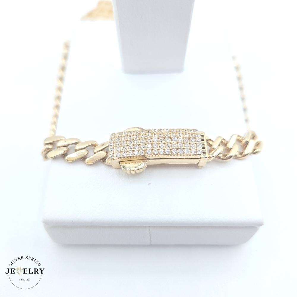 The Bear Hollow 14kt Cuban Link Bracelet offers luxury and style that stands the test of time. It weighs 12.6 grams and is designed with a width of 5mm and a length of 7 inches, making it ideal for most wrists. Made to the highest standards, it features sparkling zirconia stones that add a touch of glamour. Furthermore, the bracelet features a secure Monaco clasp. This piece exemplifies fine craftsmanship and high-quality material, promising lasting elegance.