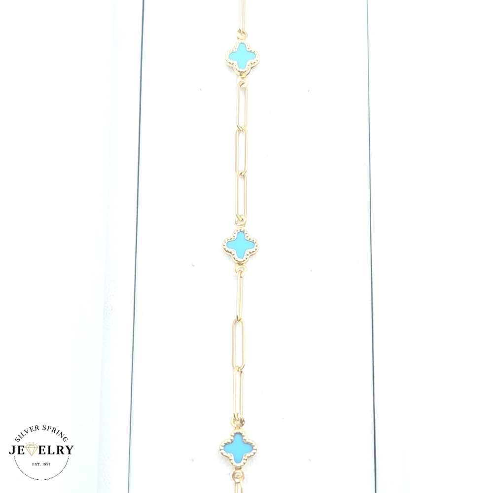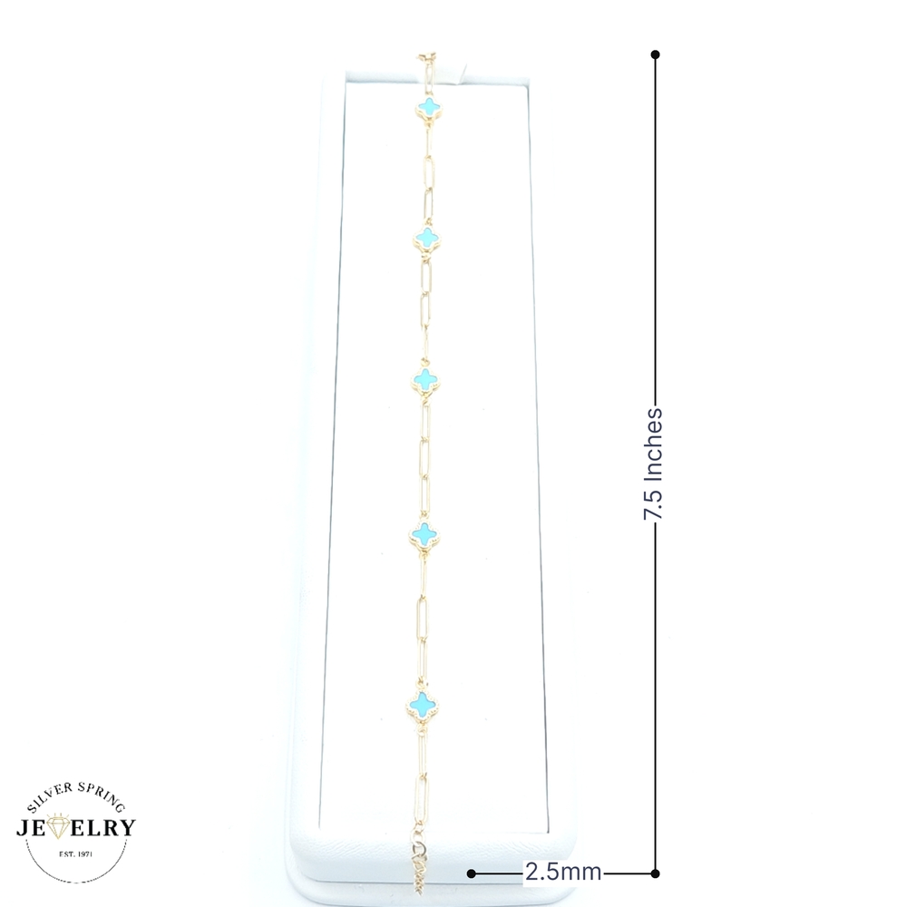 This exquisite Light Blue Clover Paper Clip Link Bracelet is crafted from premium 14kt gold and weighs a substantial 2.7 grams. With a width of 2.4mm, this piece boasts a delicate yet durable design with exquisite light blue clover embellishments. The bracelet measures 7.5 inches in total length, making it a versatile accessory fitting most wrists. This unique piece adds sophistication and charm to any outfit, making it a wonderful addition to any jewelry collection or an ideal gift for special occasions.