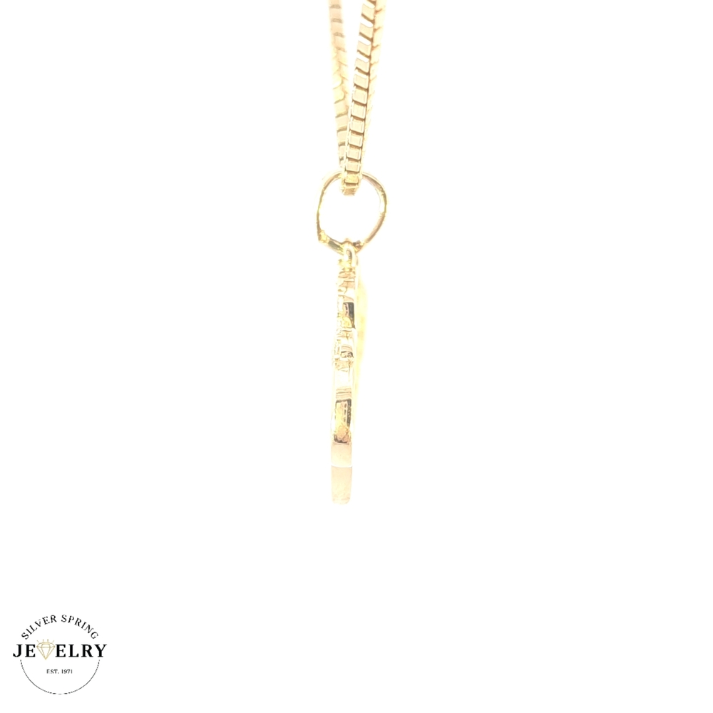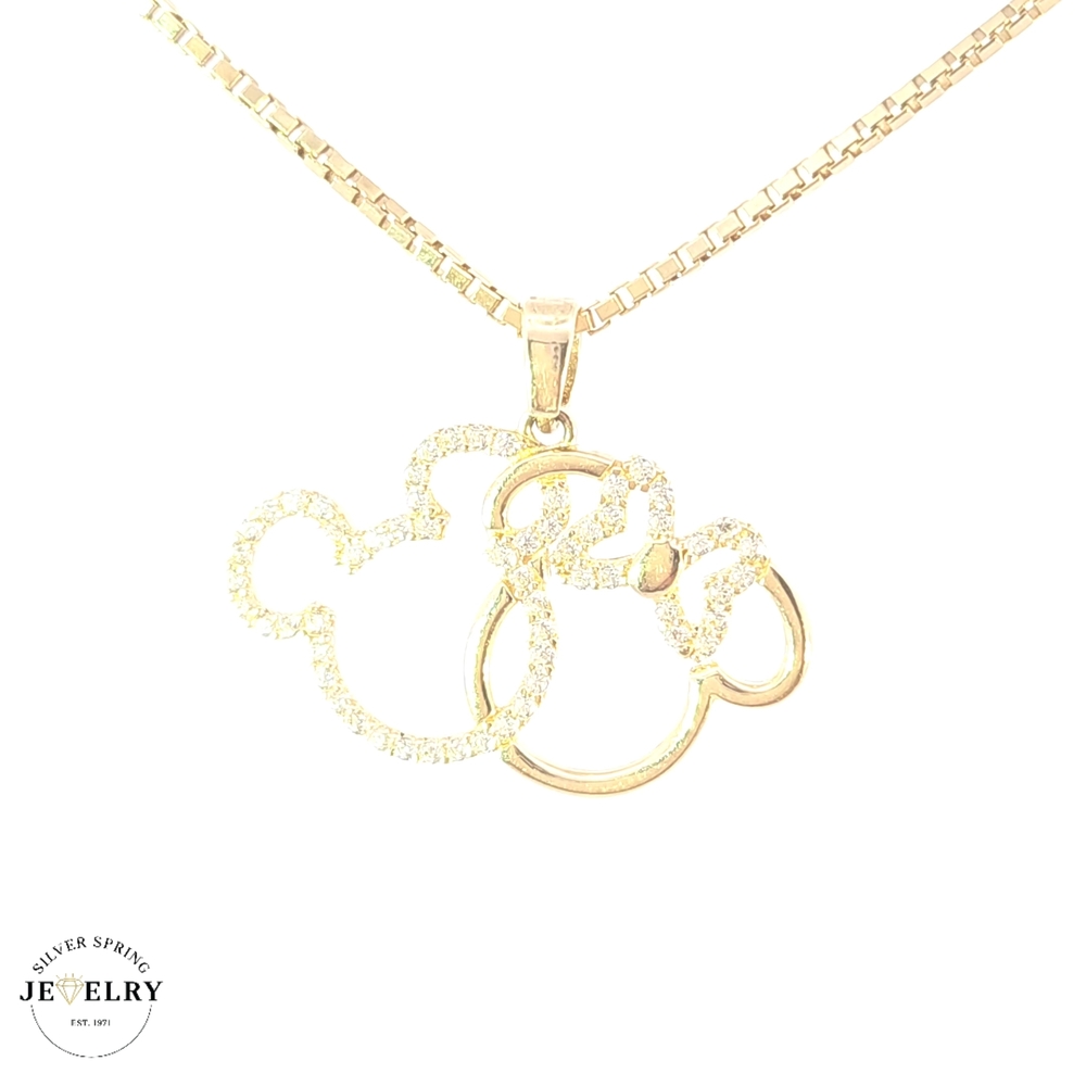 The Mickey and Minnie Mouse Silhouette, crafted from 14kt gold, is a truly charming piece of jewelry. It weighs a slender 1.6 grams, ensuring comfort while wearing. The charming themed pendant measures 26mm wide and 0.50 inches long, making it a versatile and delicate addition to any ensemble. Encrusted with zirconia, it adds a subtle sparkle to elevate the look. It's a wonderful gift for Disney lovers or a whimsical addition to your own collection.