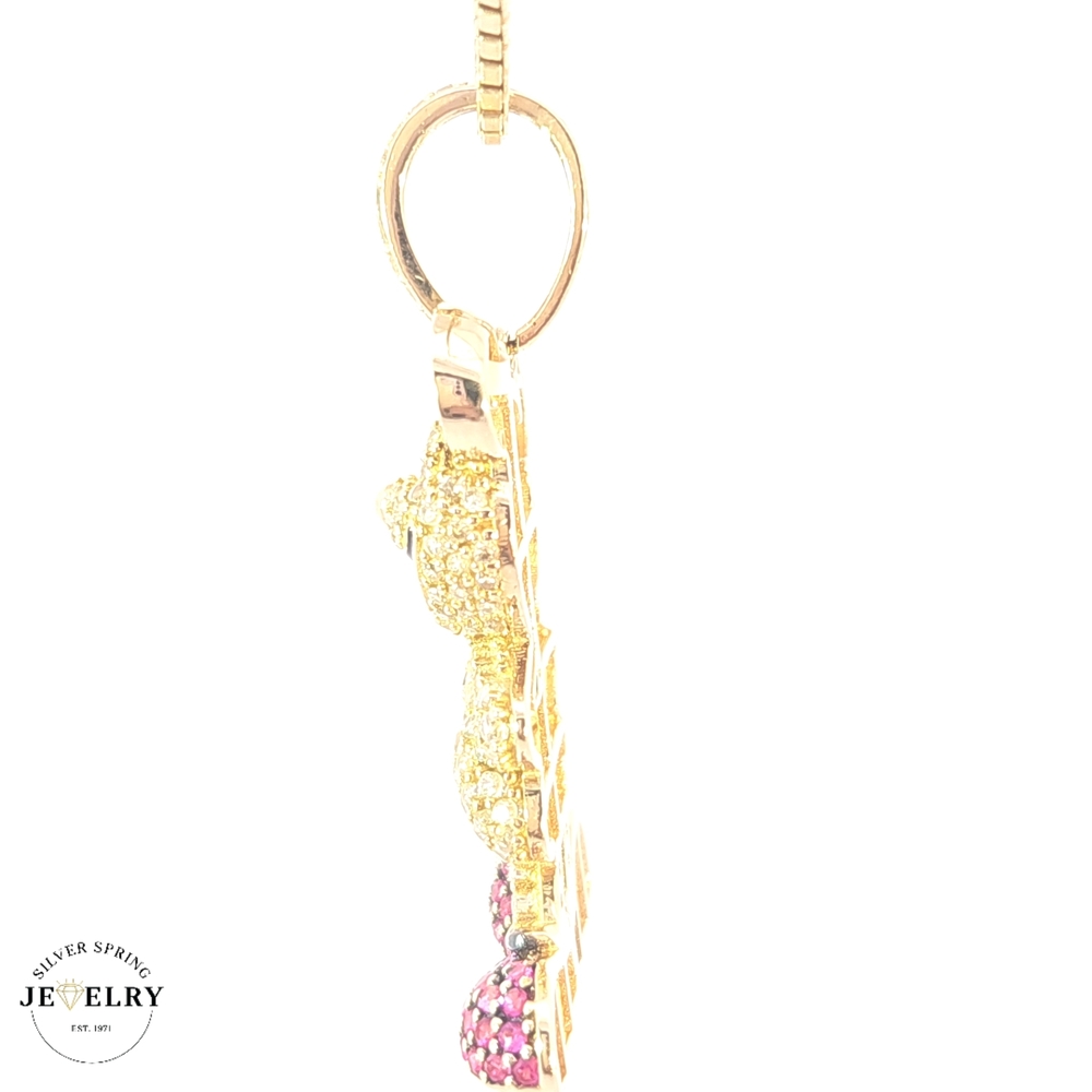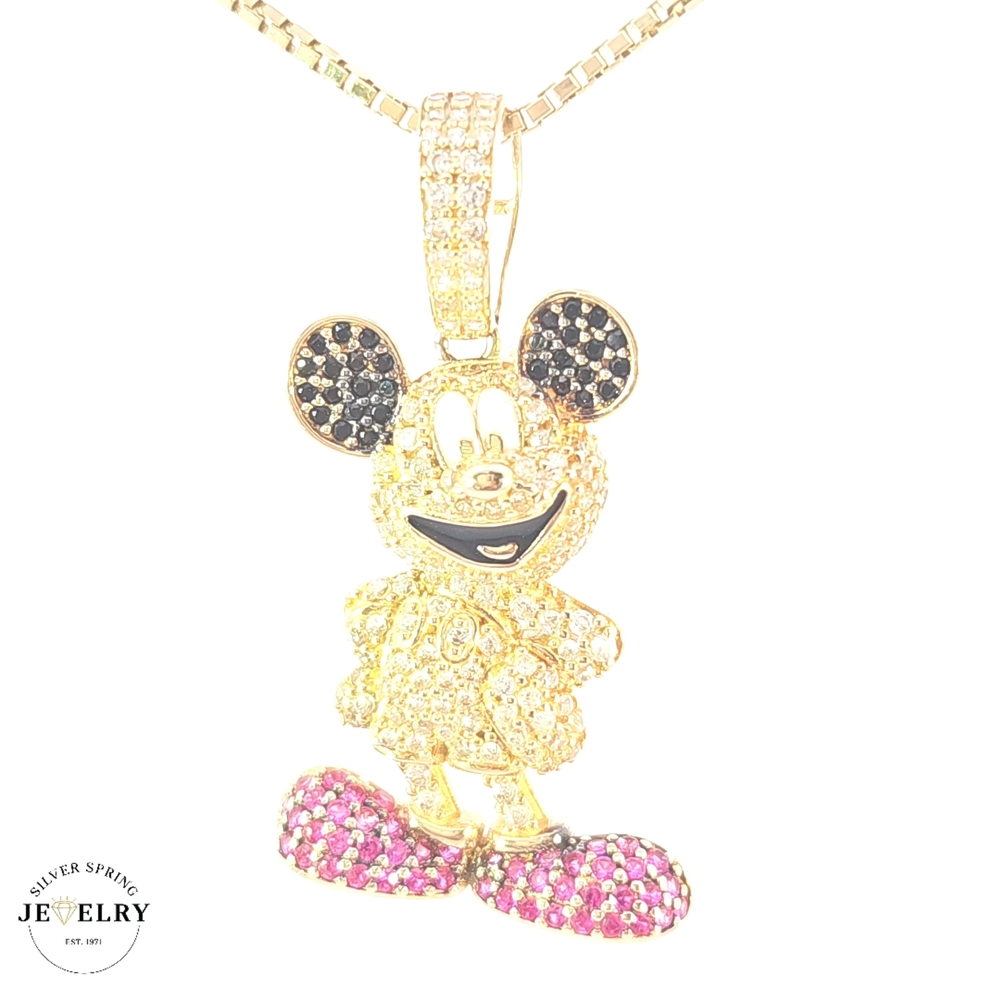 This Mickey Mouse pendant, meticulously crafted from 14-karat gold, weighs 5.7 grams. With a width of 20mm and a length of 1.25 inches, it's the ideal size for an understated statement. Embellished with multicolored zirconia, this piece adds a playful yet sophisticated touch to any outfit. It encapsulates the spirit of everyone's favorite cartoon mouse while giving it a luxurious twist. This radiant pendant is a treasured keepsake for any Disney lover.