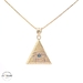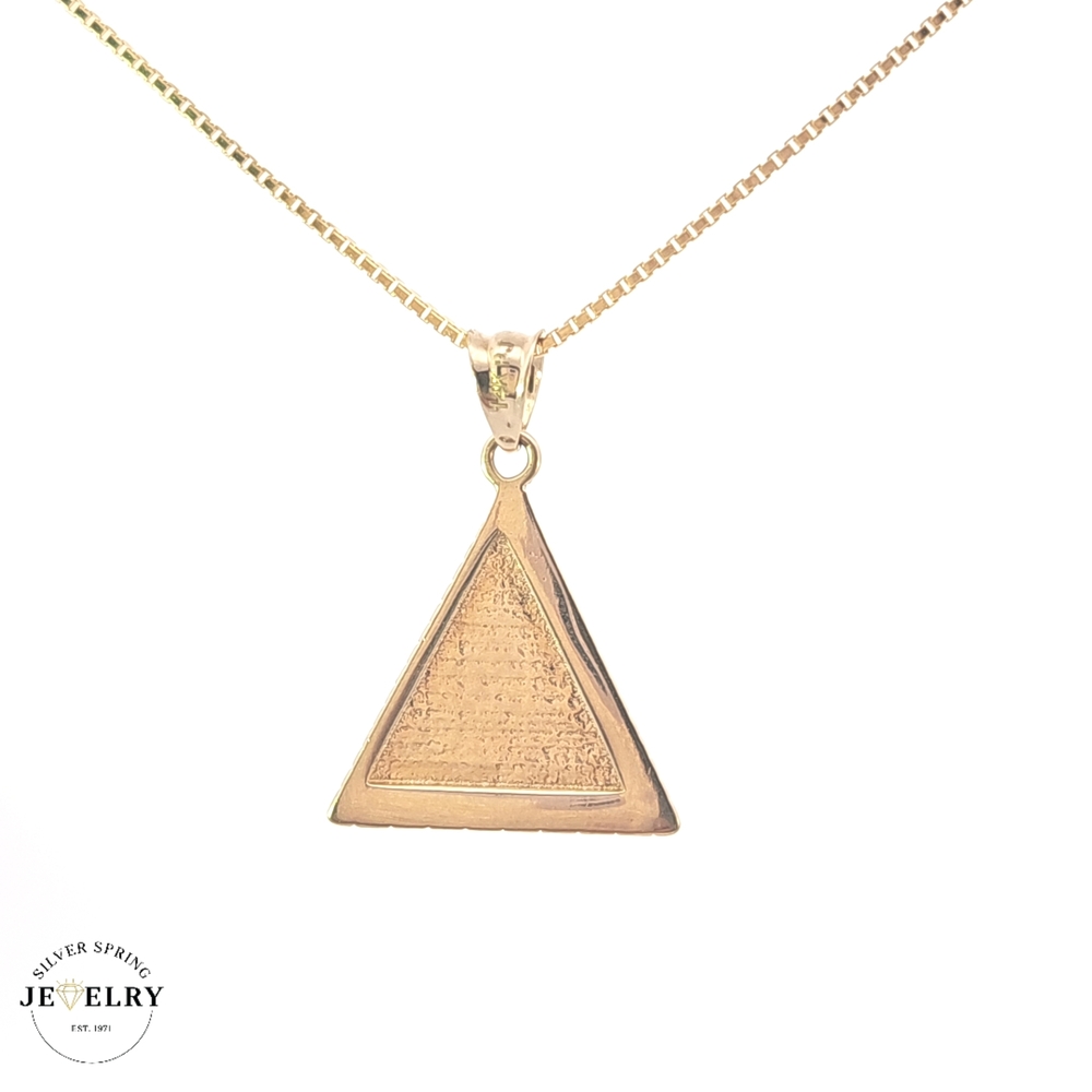 This 14kt Pyramid Eye of Horus pendant weighs 1.50 grams, bringing together ancient Egyptian mythology with modern style. With its 16mm width and a length of 0.75 inches, it adds a subtle yet distinct touch to any outfit. Named after the Egyptian god of sky, sun, and moon, the Eye of Horus symbolizes protection and good health. This finely crafted piece merges symbolism and artistry, making it a meaningful addition to your jewelry collection.