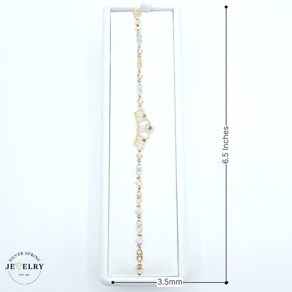 Celebrate your Quinceañera in style with this beautifully crafted Heart Link Bracelet, crafted from quality 14kt gold and weighing 4.1 grams. With a 3.5mm width and 6.5 inches in length, this elegant accessory is perfect for any wrist. The stunning center features a regal crown accent, making this piece truly extraordinary. To add even more charm, the bracelet is adorned with zirconia gemstones in subtle green and clear hues, adding sparkle and sophistication. This bracelet is not just an accessory, but a timeless keepsake.