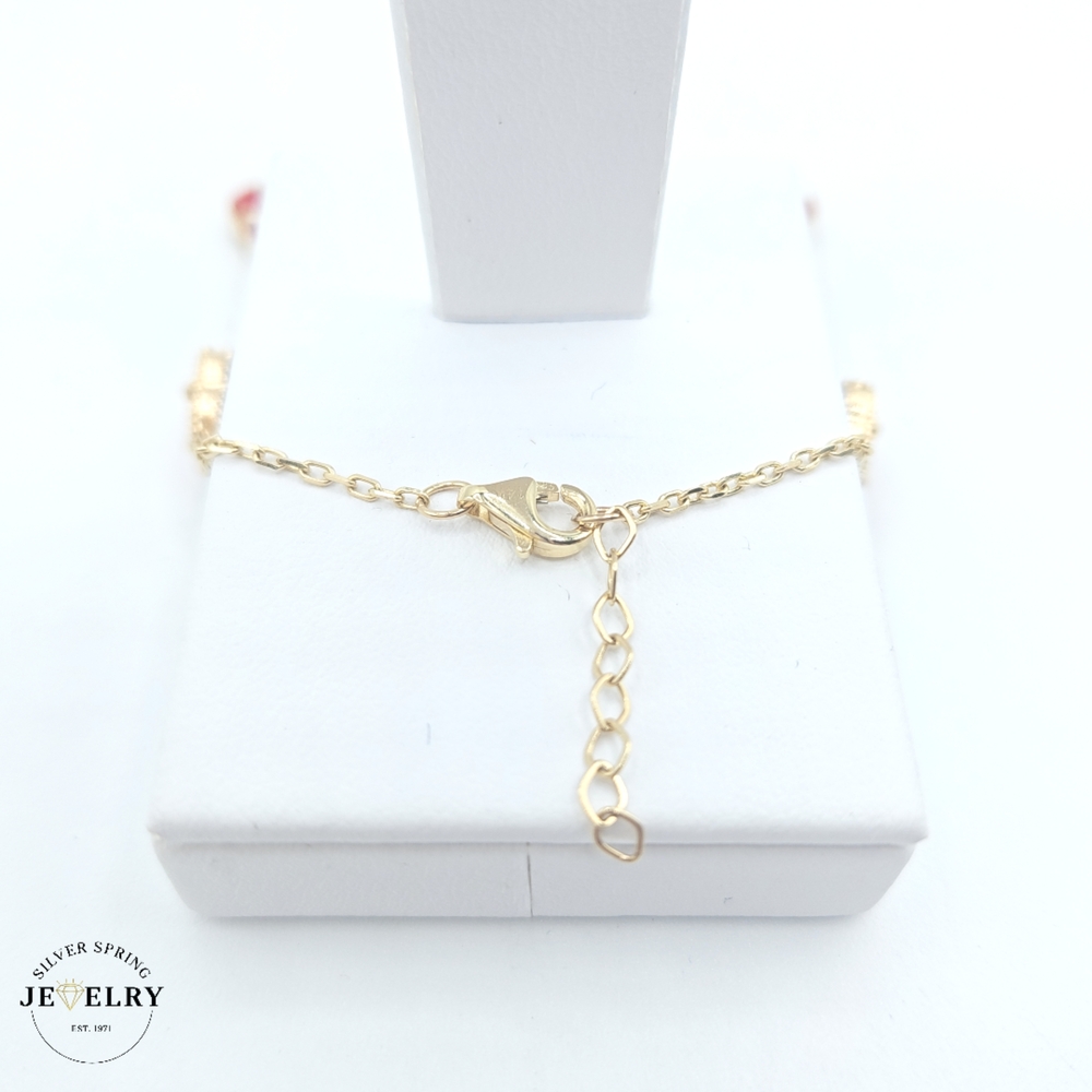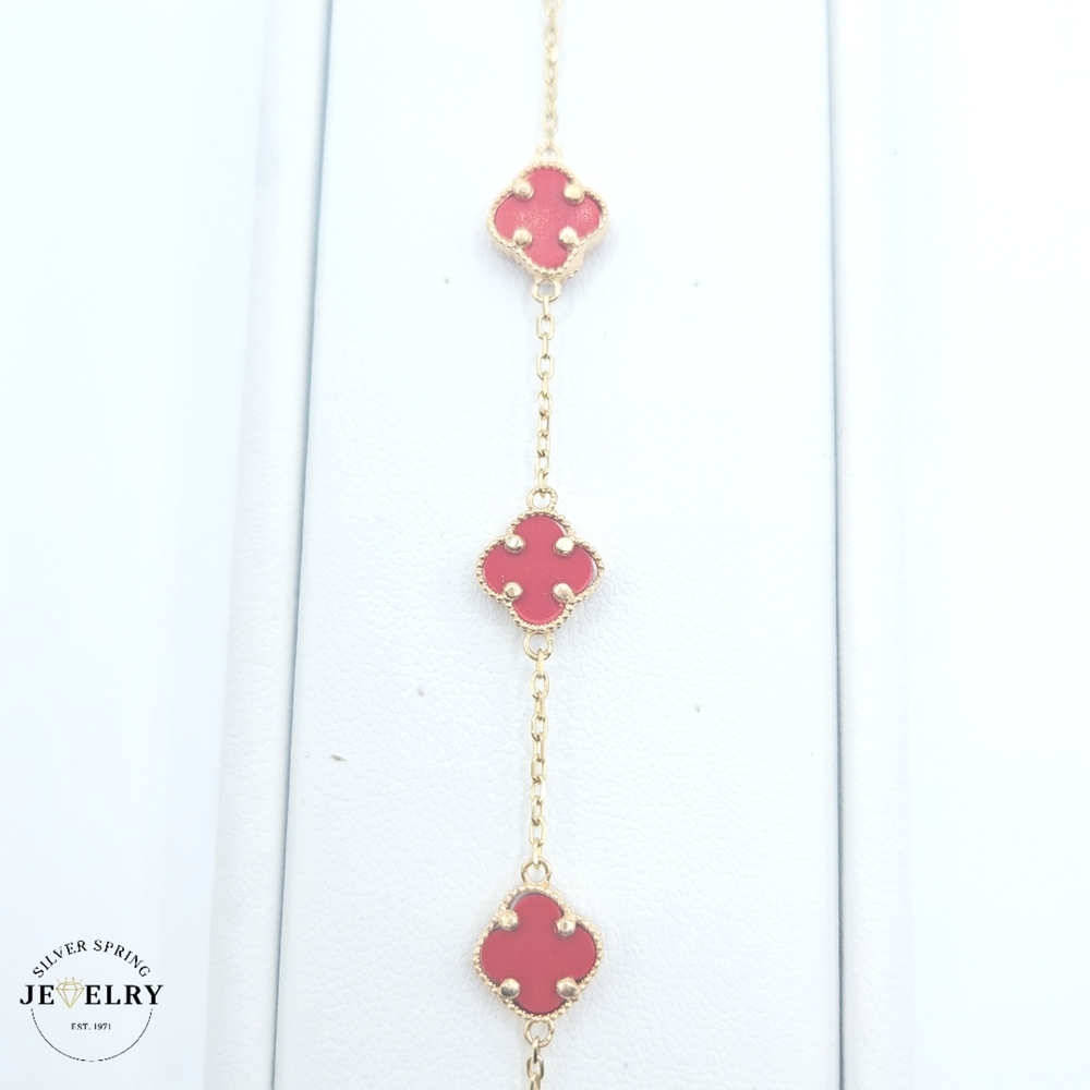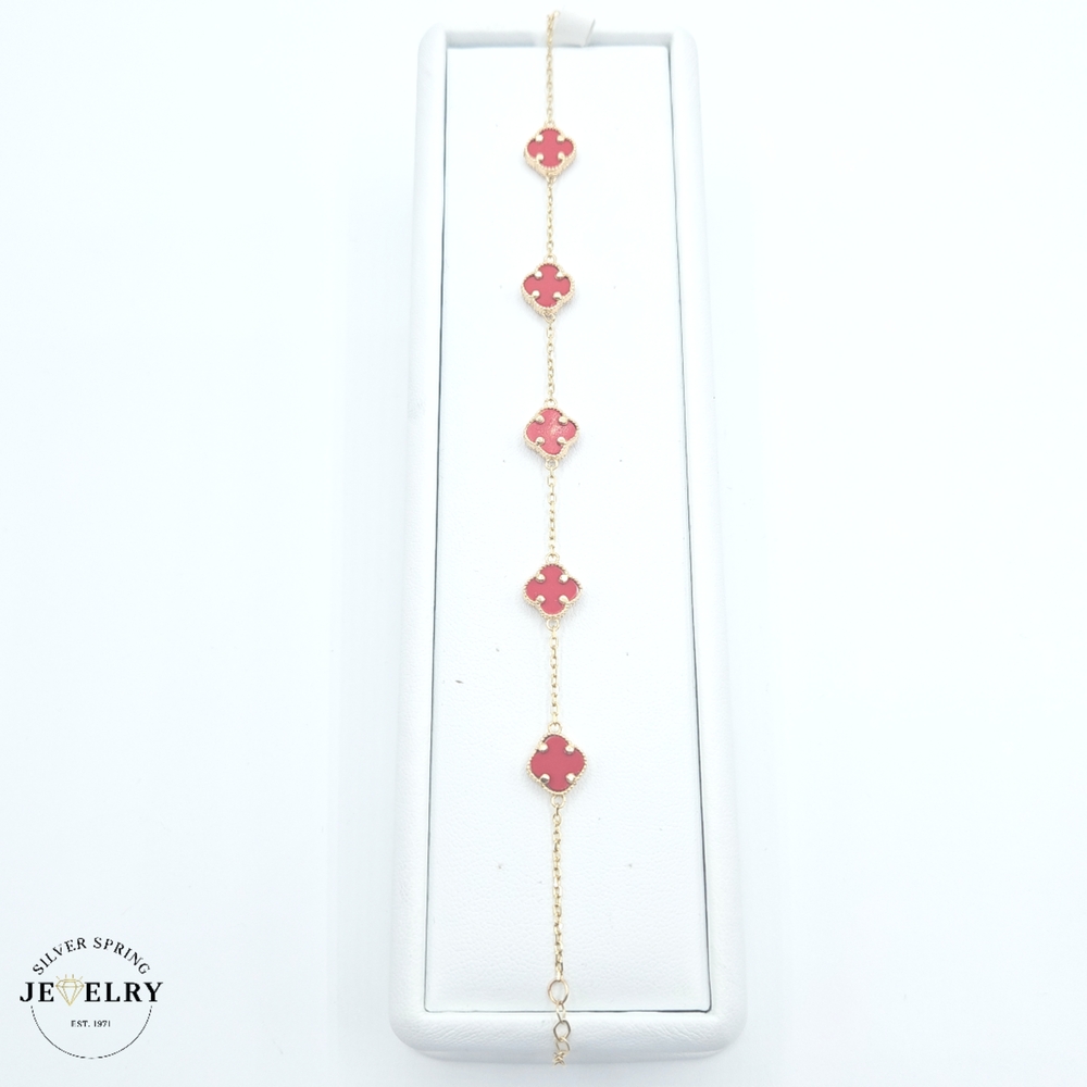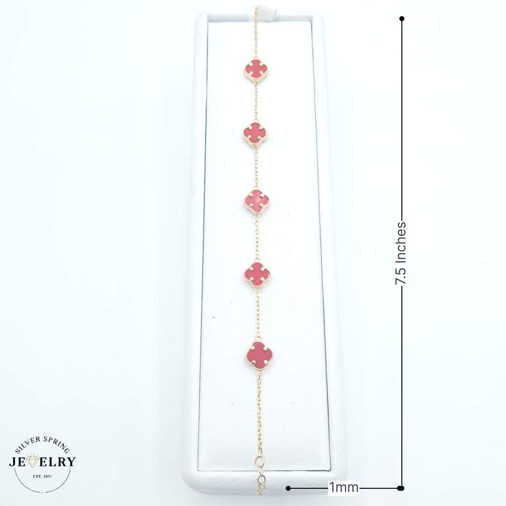This exquisite Red Clover Cable Link Bracelet, crafted from high-quality 14kt gold, weighs 4.00 grams - a testament to its solid craftsmanship. It features a slender width of 1mm, giving it a delicate, feminine appearance. The bracelet measures 7.5 inches, making it a comfortable fit for most wrist sizes. This elegant piece of jewelry is finely designed with a red clover accent that adds a touch of charm to your everyday style. It makes a perfect gift for special occasions or a luxurious treat for yourself.