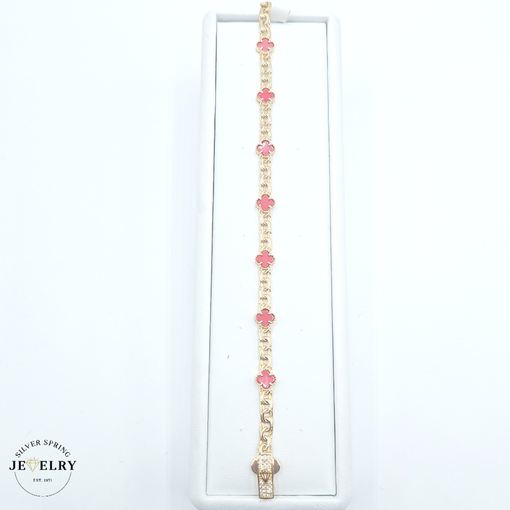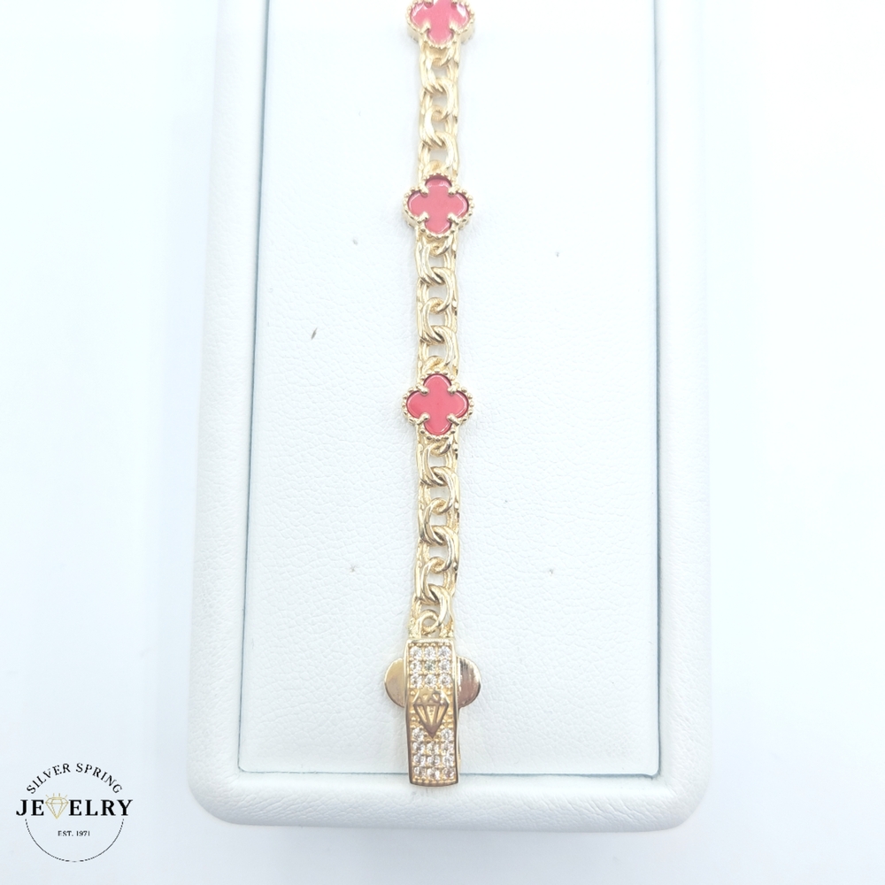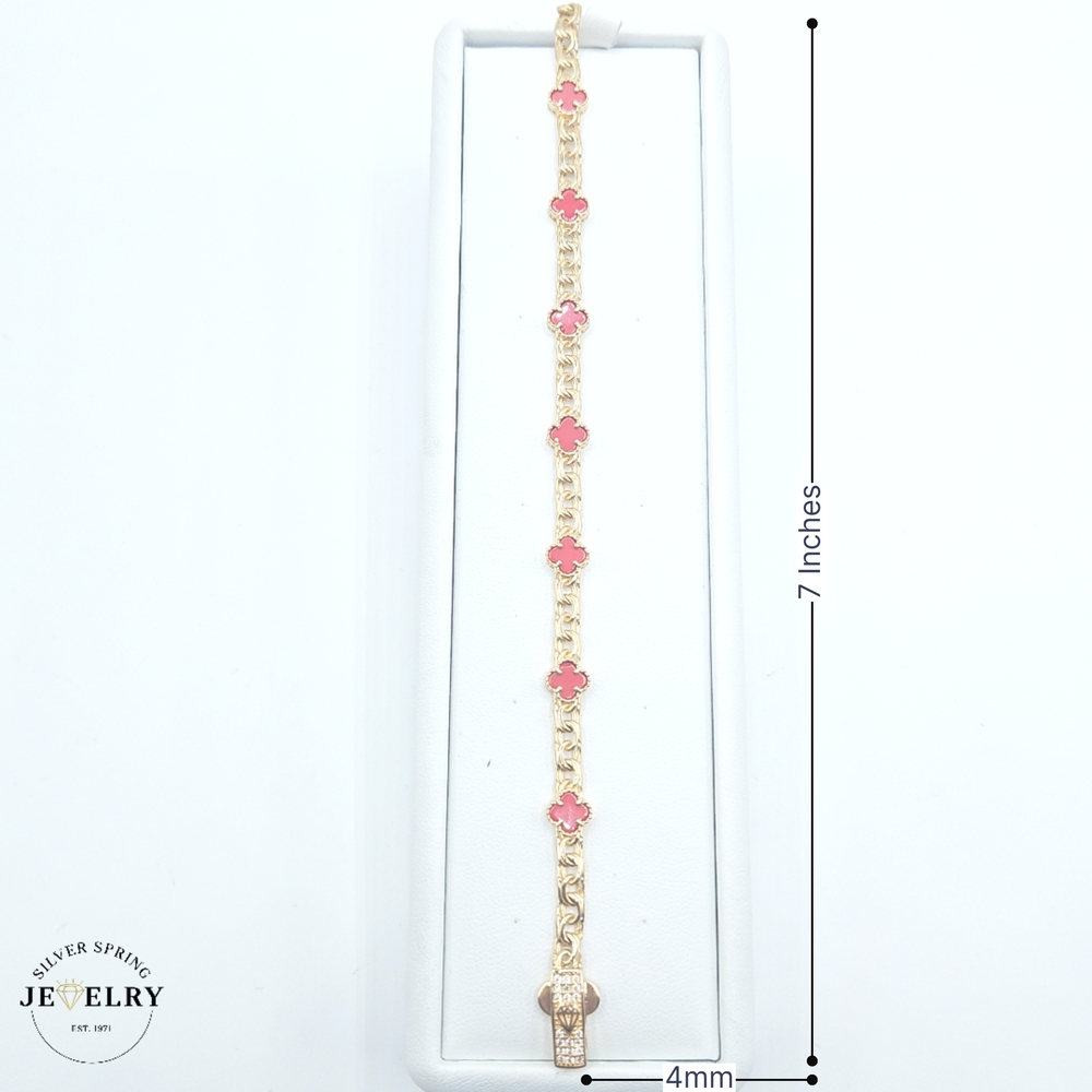Display your love for sophisticated style with this Chino Link Bracelet, beautifully crafted from 14kt gold weighing 8.60 grams. Boasting a bold Red Clover design, this piece adds a vibrant touch to any outfit. With a width of 4mm and a length of 7, this bracelet provides a comfortable fit. The Monaco clasp not only ensures secure wear but also features dazzling zirconia for added sparkle. This elegant bracelet is an ideal accessory for both casual and formal occasions.