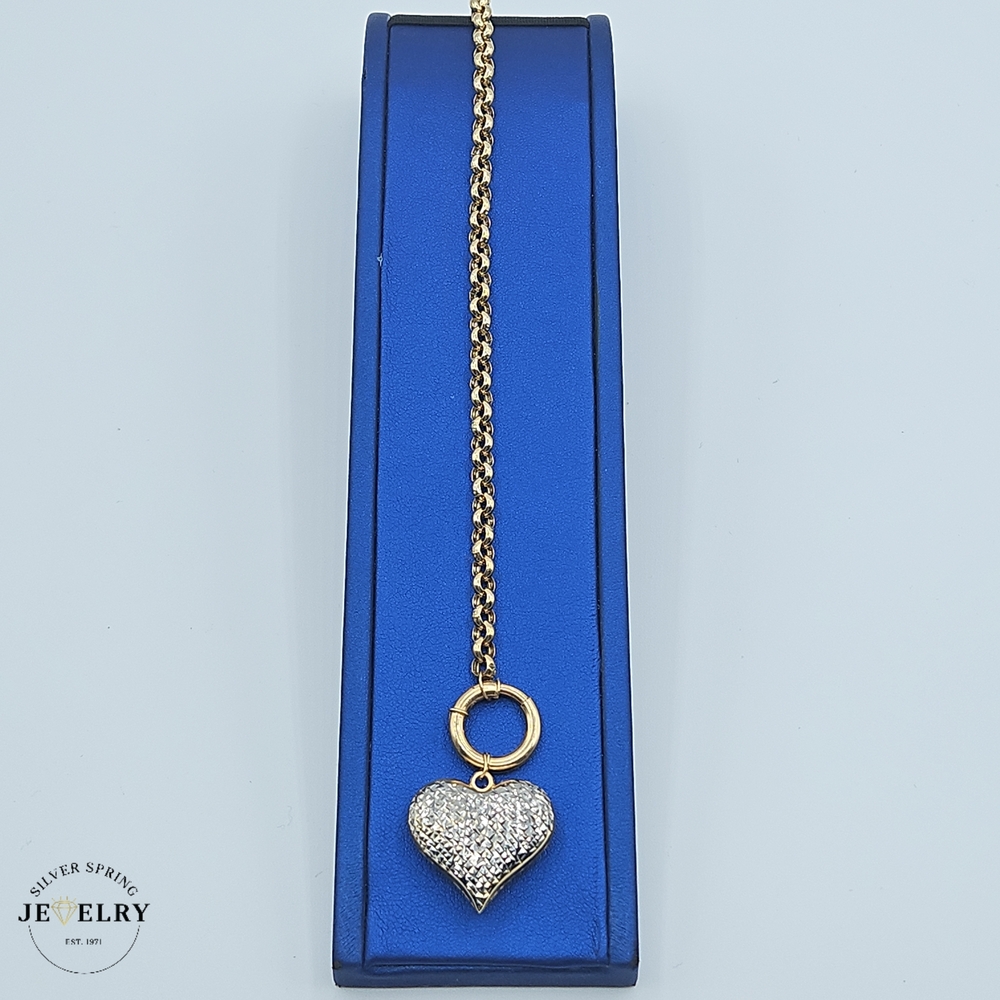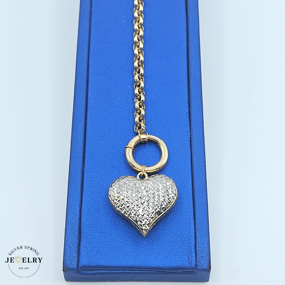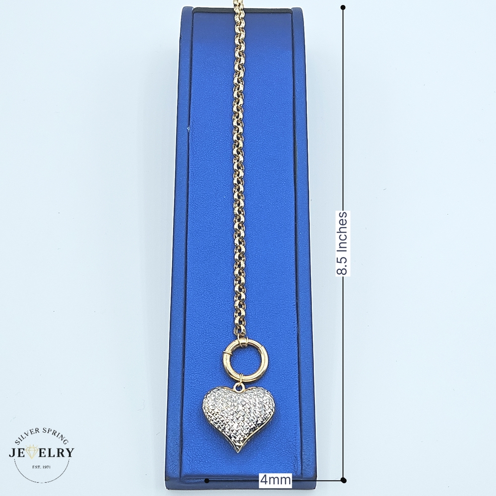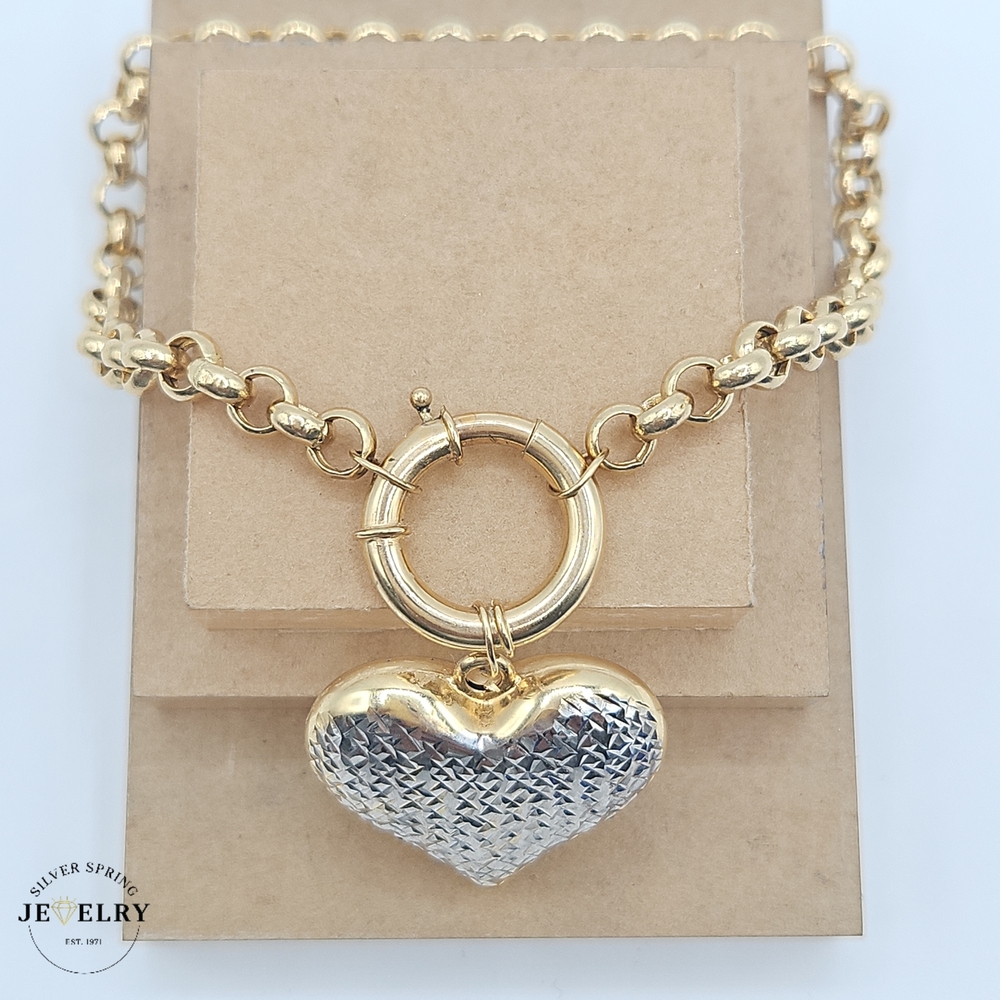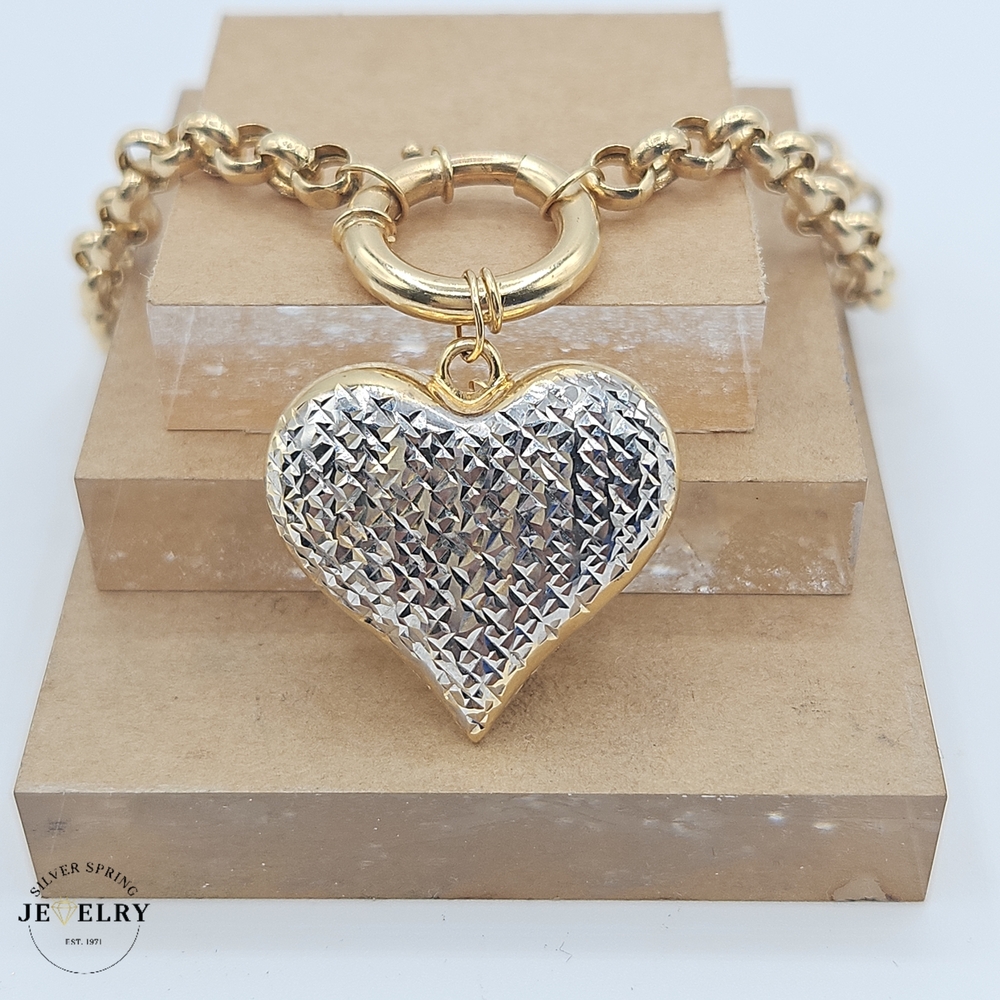 This exquisite Rolo Link Bracelet is crafted from 14kt gold, weighing 8.4 grams, promising durability and long-lasting radiance. With a width of 4mm and a length of 8.5 inches, it offers a comfortable fit for most wrists. The bracelet's standout feature, a diamond-cut big heart, adds a touch of sophistication. This piece of jewelry is a blend of style & luxury, perfect for any occasion.