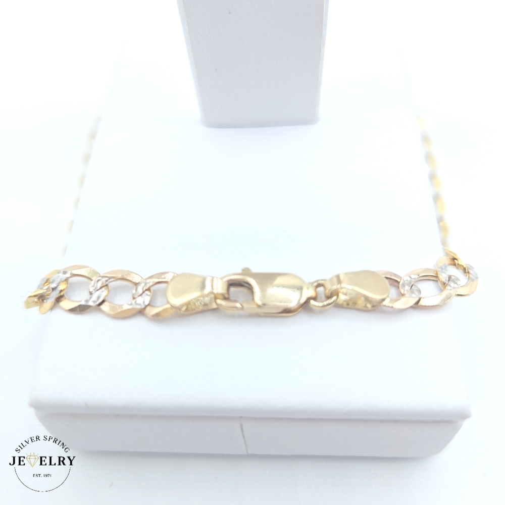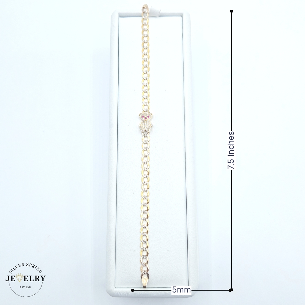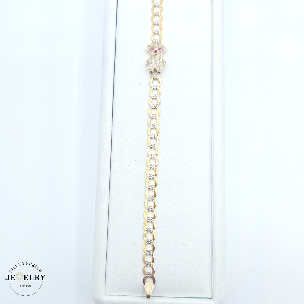 This beautiful Teddy Bear Curb Link Bracelet, crafted from premium 14kt two-tone gold and weighing 5.50 grams, embodies both charm and elegance. With a width of 5mm and a length of 7.5 inches, this bracelet is a nuanced blend of whimsical design and quality craftsmanship. Adorned with sparkling zirconia, this delightful teddy bear-themed jewelry will add a touch of playfulness to any look. A thoughtful gift or a special treat for yourself, the Teddy Bear Curb Link Bracelet promises to dazzle and delight.