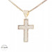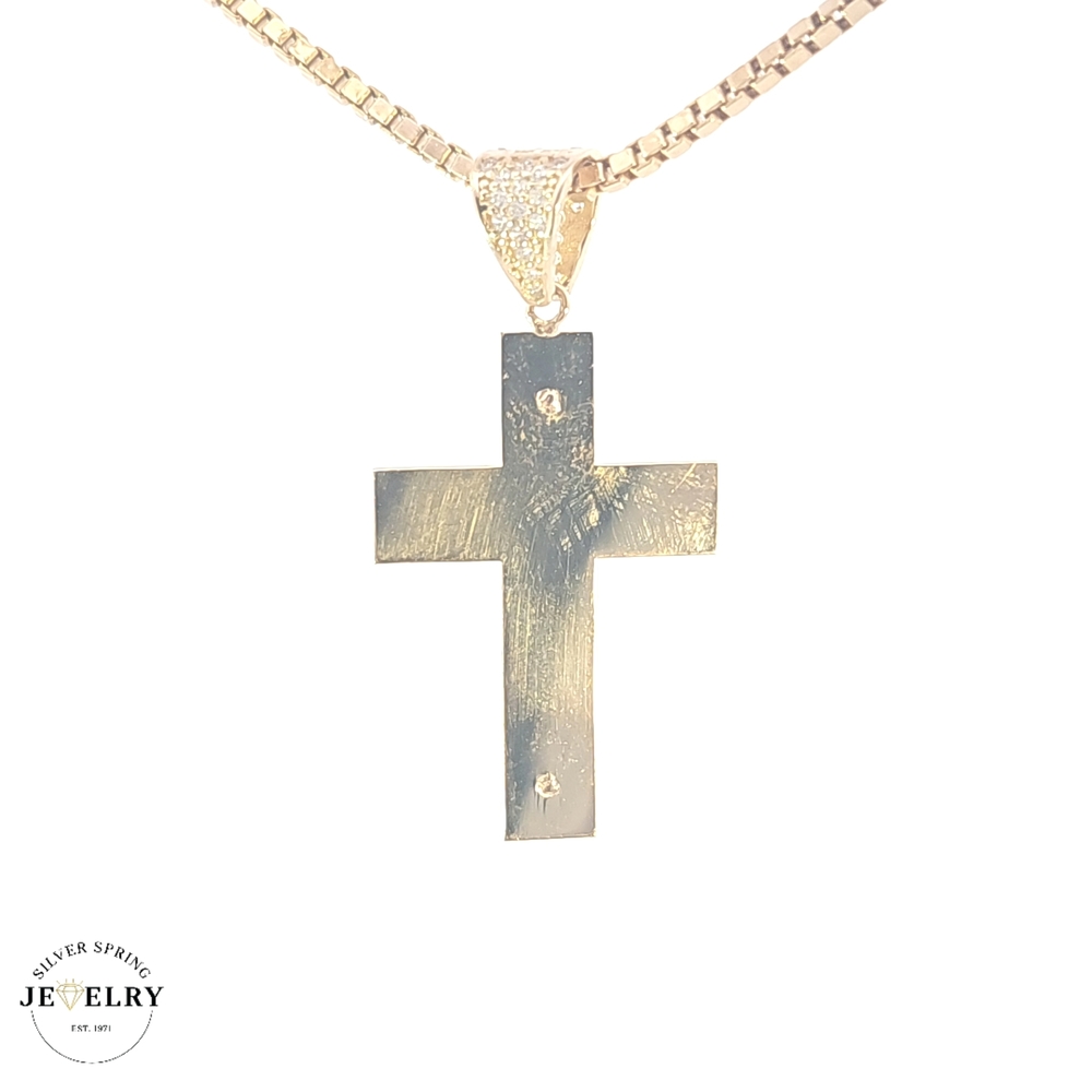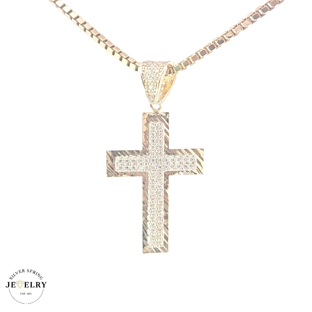 This splendid 14kt gold cross has a remarkable textured finish. Weighing 3.00 grams, and with a width of 3mm and a length of 1.25, this meticulously crafted piece displays a magnificent diamond cut. Embellished with stunning zirconia, it adds a touch of elegance and timeless beauty that is quintessential for any jewelry collection—crafted to perfection.