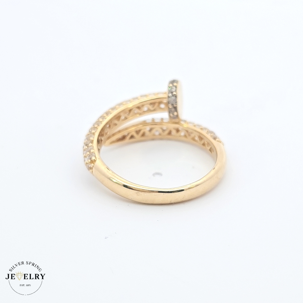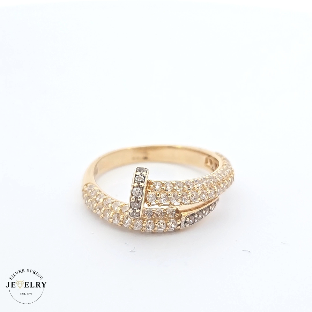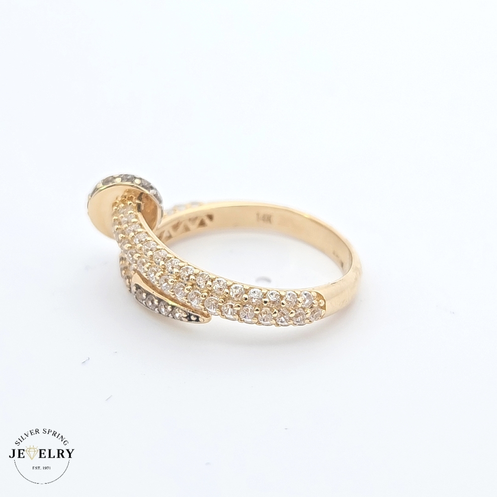 This ring is an artistic blend of craftsmanship and style, featuring a twisted nail design made from 14kt gold, weighing 4.00 grams. Sized at 8, this chic statement piece blends everyday style with a hint of unexpected elegance. It's beautifully embellished with sparkling zirconia, adding a touch of glamor and making it suitable for both casual and special events.