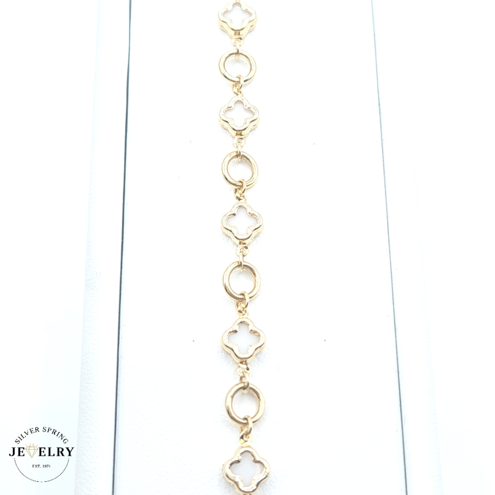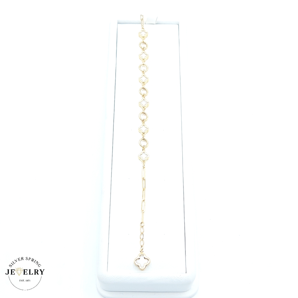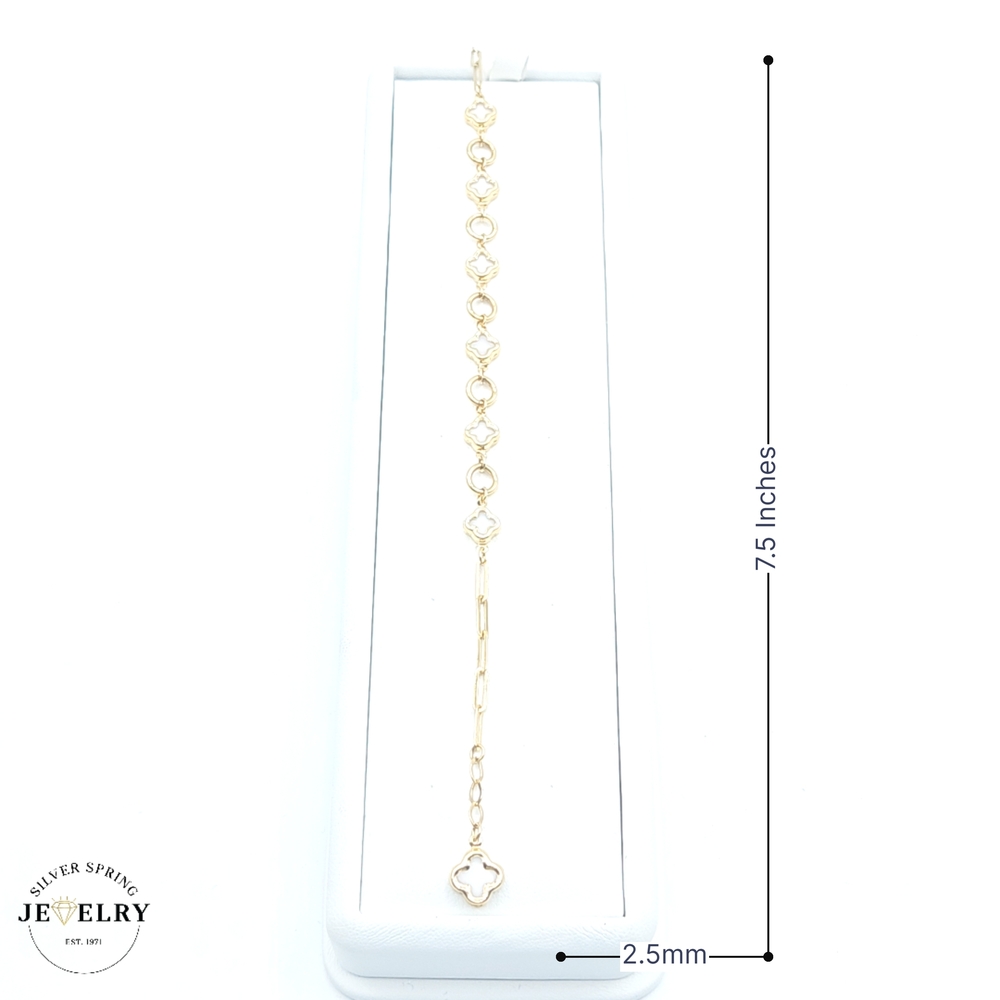 This elegant White Clover Paper Clip Bracelet, made from 14kt gold, weighs a comfortable 5.1 grams. The design features a striking paper clip style in a width of 2.5mm, giving it a sleek and modern appeal. It measures a versatile 7.5 inches in length, making it suitable for most wrist sizes. This piece is a blend of simplicity and sophistication, perfect for adding a touch of luxury to any outfit. The white clover element adds a unique charm to the piece.