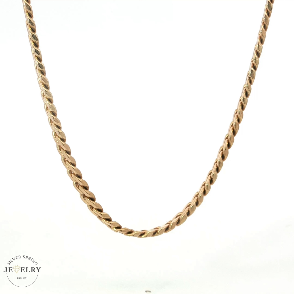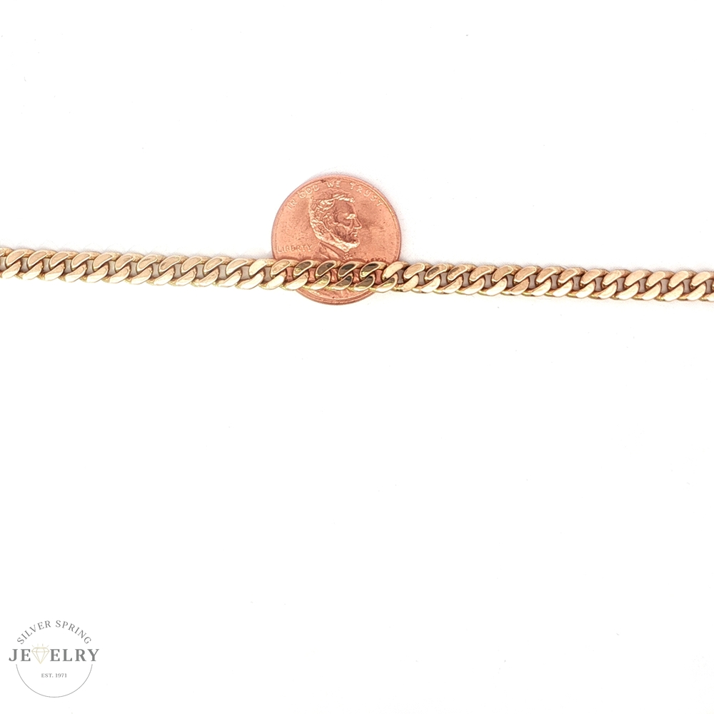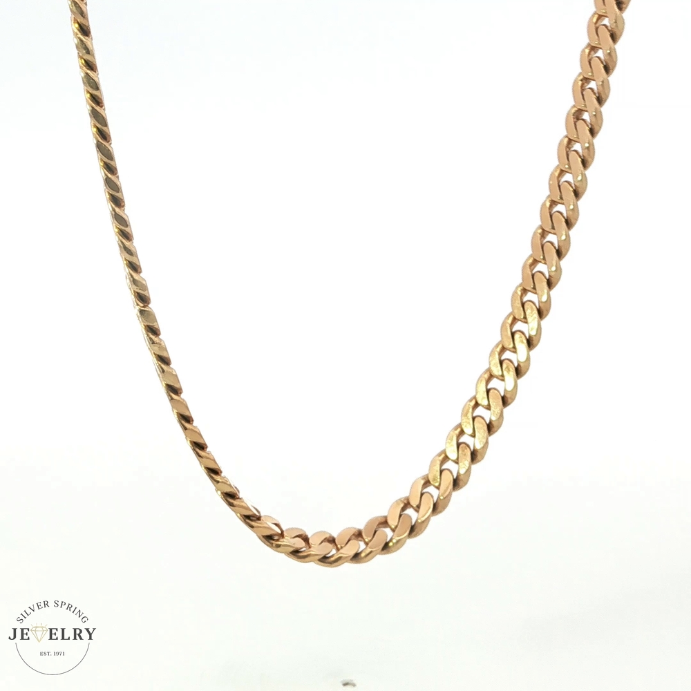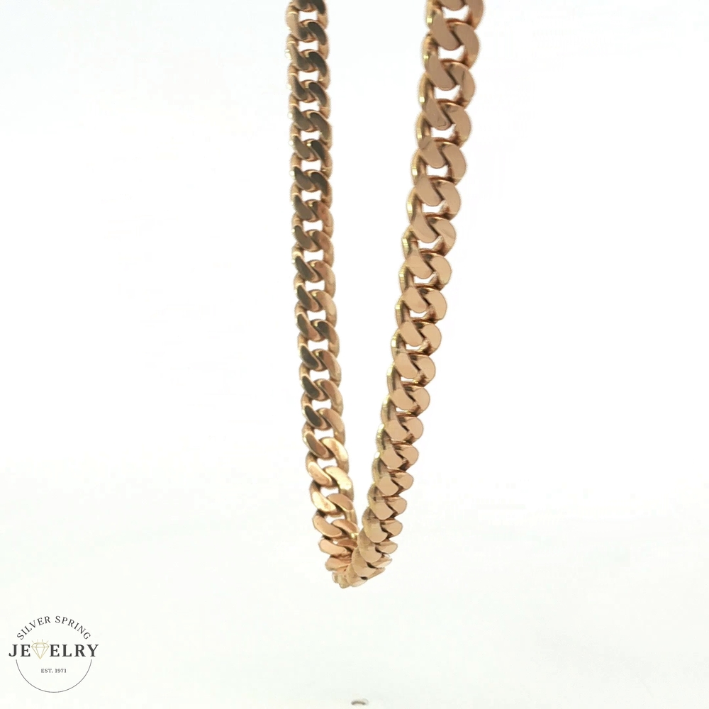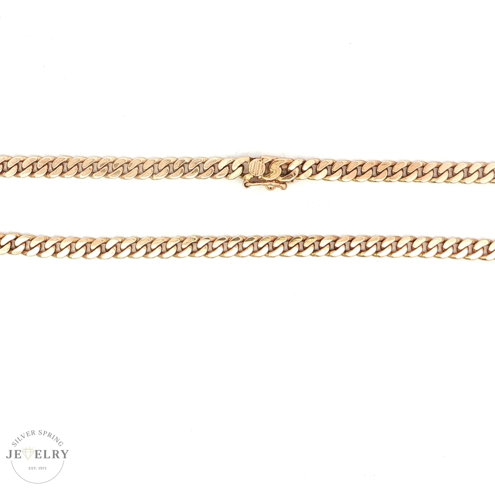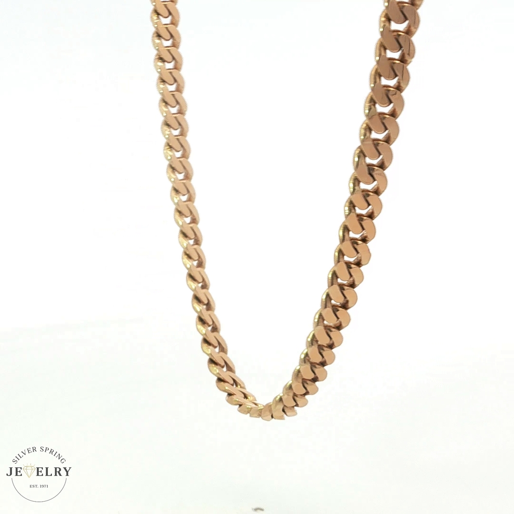 This stylish 18K yellow gold solid Cuban link chain weighs 41.10 grams, highlighting its quality. With a width of 4.5mm, it stands out without being overly bold. At 22 inches in length, it hangs comfortably and noticeably on most individuals. Despite being solid gold, the chain's thickness and craftsmanship ensure its durability. The Cuban link design adds an element of sophistication, making it suitable for both casual and formal occasions. The captivating luster of this high-quality 18K yellow gold piece makes it a worthwhile investment.