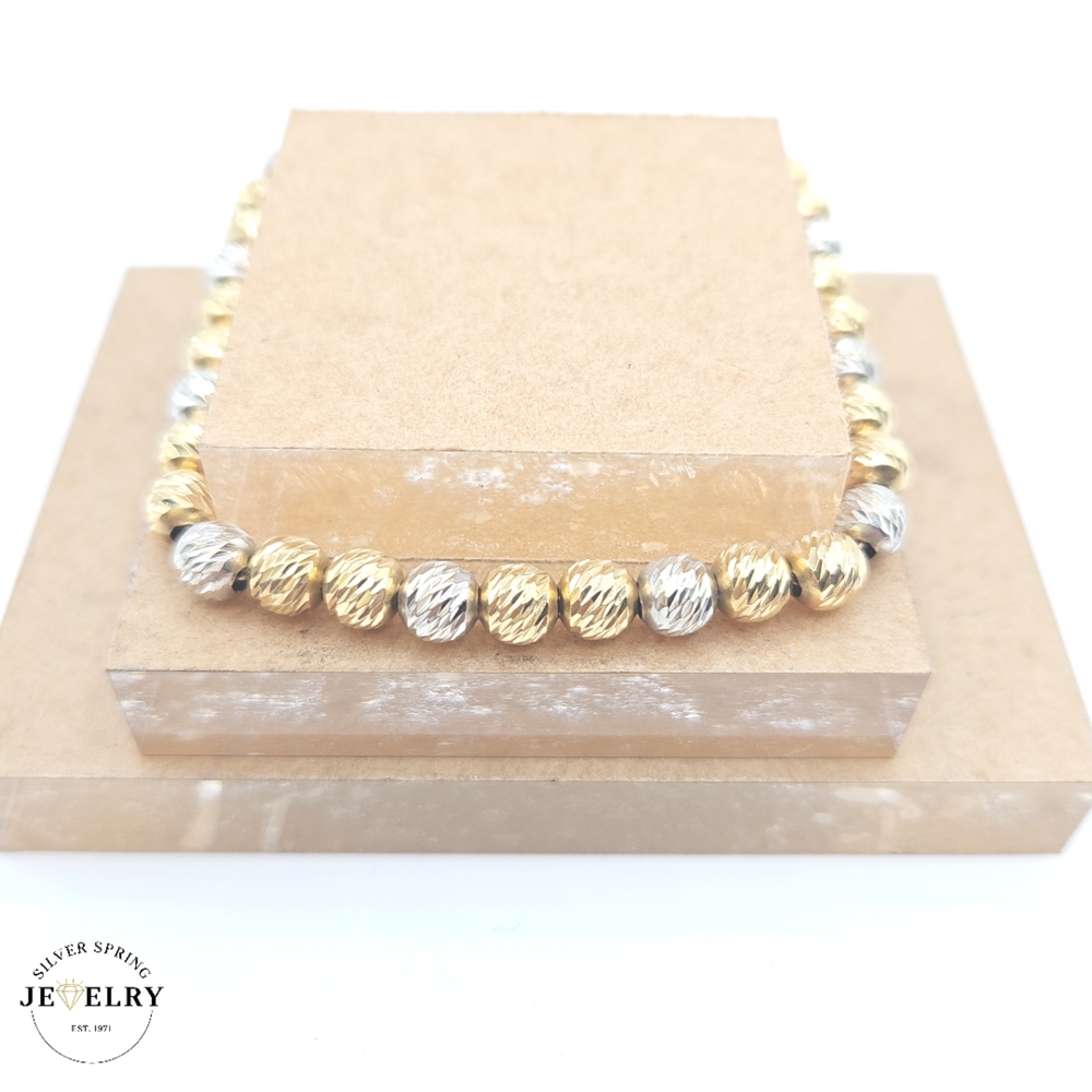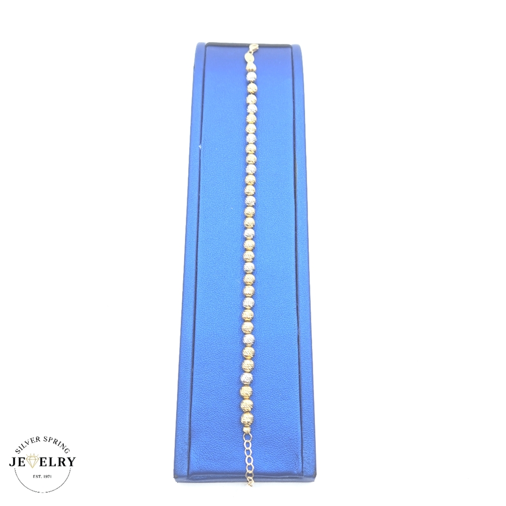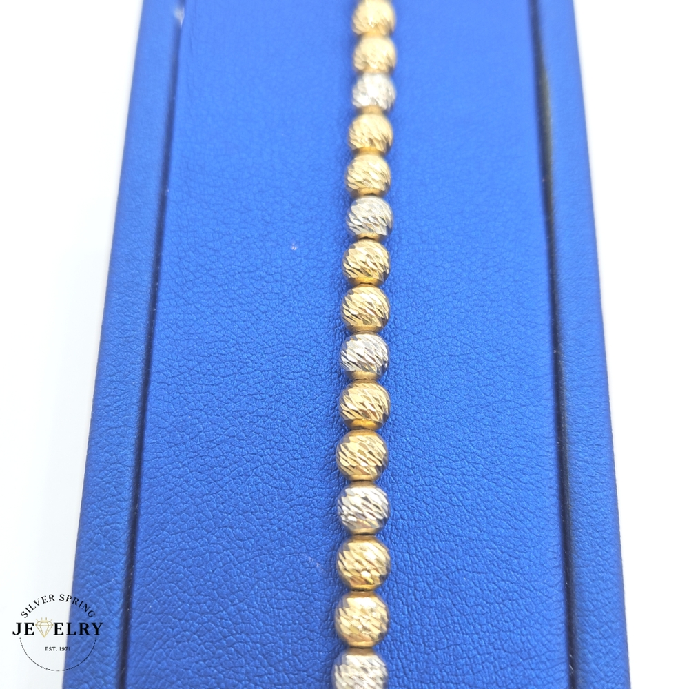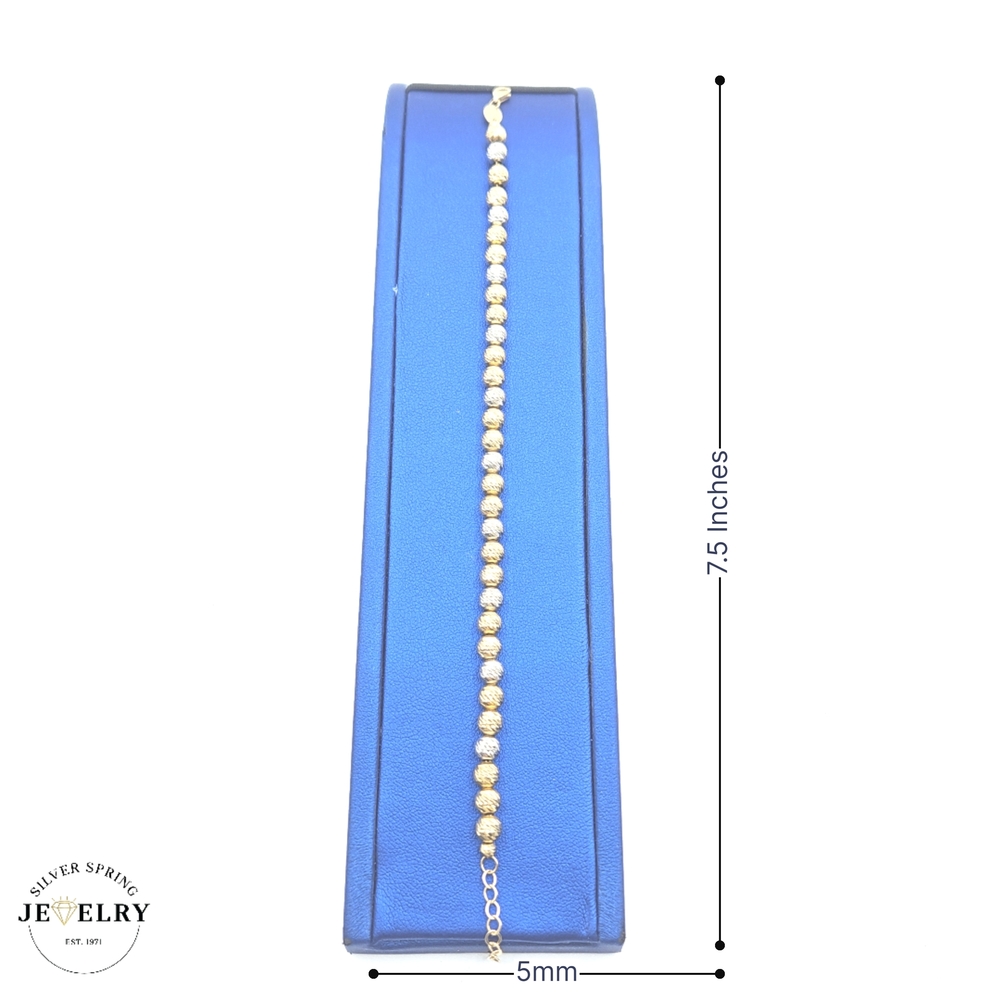 This Beaded Link Bracelet, crafted from exquisite 18kt gold, weighs 7.5 grams, promising durability and a substantial feel on your wrist. With its 5mm width and 7.5-inch length, which comfortably fit most wrist sizes, it is designed for ideal proportions and comfortable wearability. The bracelet is tastefully designed with a diamond-cut pattern in an eye-catching two-tone color scheme. Its unique and stylish design makes it the perfect addition to any jewelry collection.