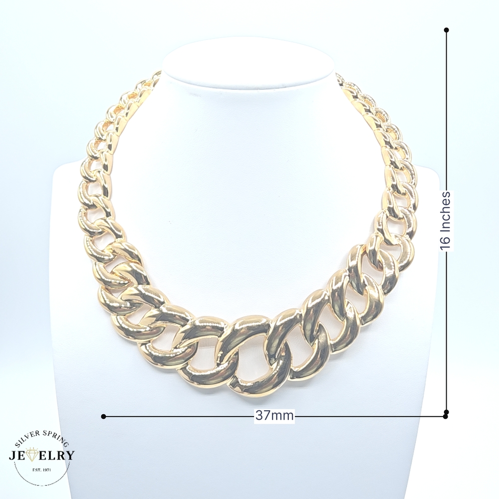 Experience luxury with this Hollow Cuban Necklace made from 18kt gold. It weighs 25.7 grams, ensuring a comfortable yet substantial feel. This distinctive piece features a width of 37mm, making a bold statement without being overpowering. At 16 inches, it sits perfectly around the neck, adding an elegant touch to any outfit. This necklace's unique quality, reminiscent of Cuban style, showcases not only your style but also your individuality.