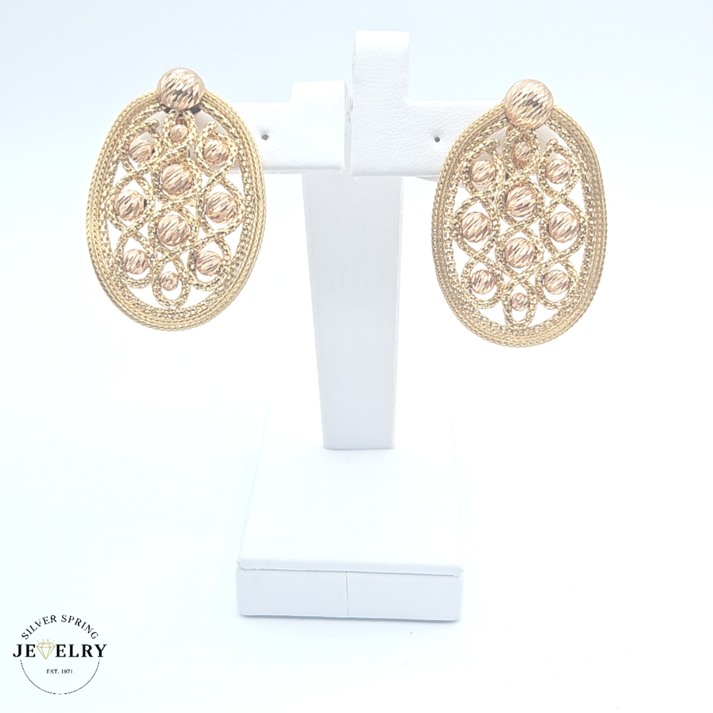 Stunning Omega Back Filigree Earrings, crafted with utmost precision from high-quality 18kt Two-Tone gold. These elegant earrings weigh approximately 14.2 grams, ensuring a robust yet comfortable feel. With an impressive width of 27.5mm and a length of 1.5 inches, these earrings provide a striking display of exquisite craftsmanship. The exquisite filigree work adds a vintage touch, while the Omega back design ensures secure, easy wear. A perfect blend of style and sophistication for any jewellery collection.