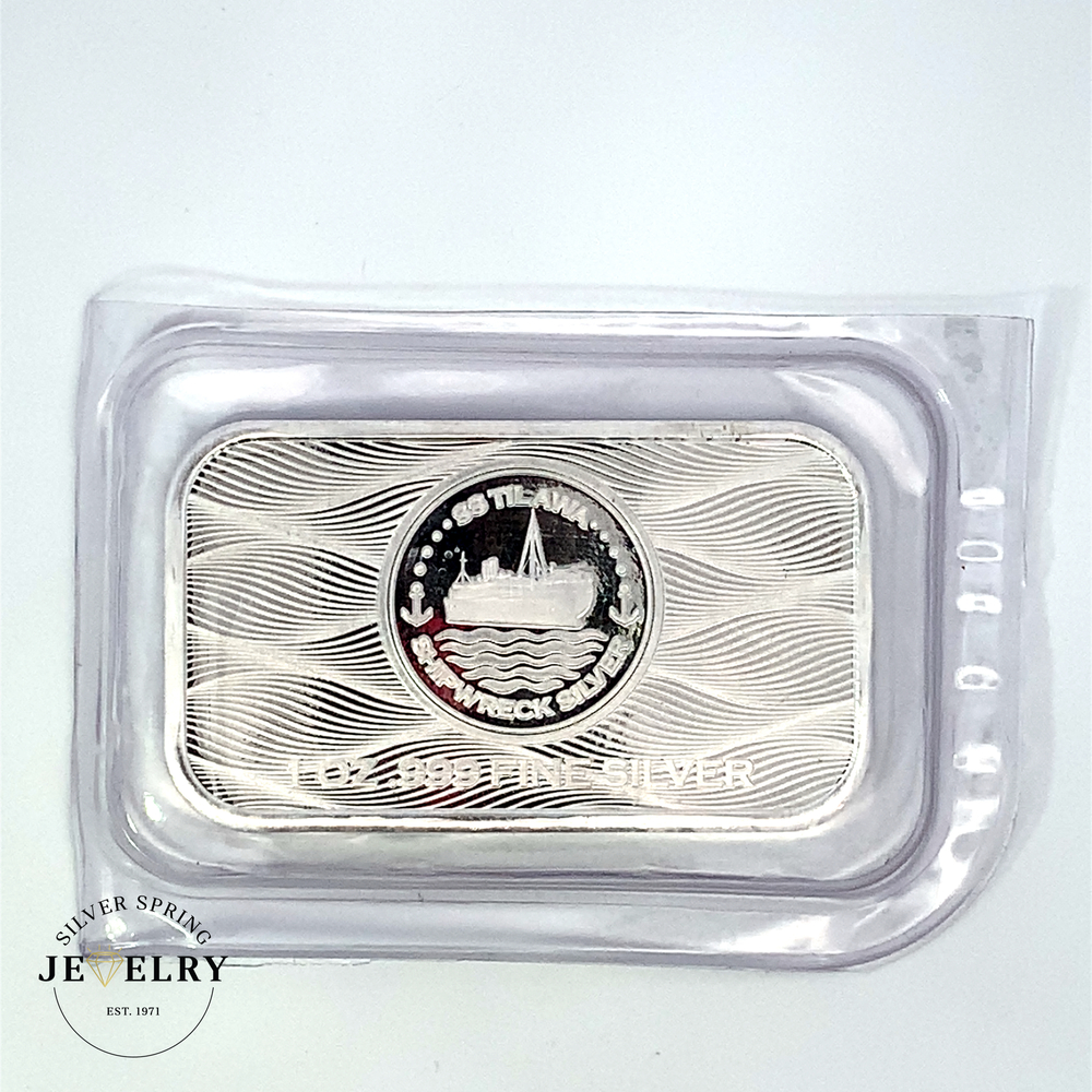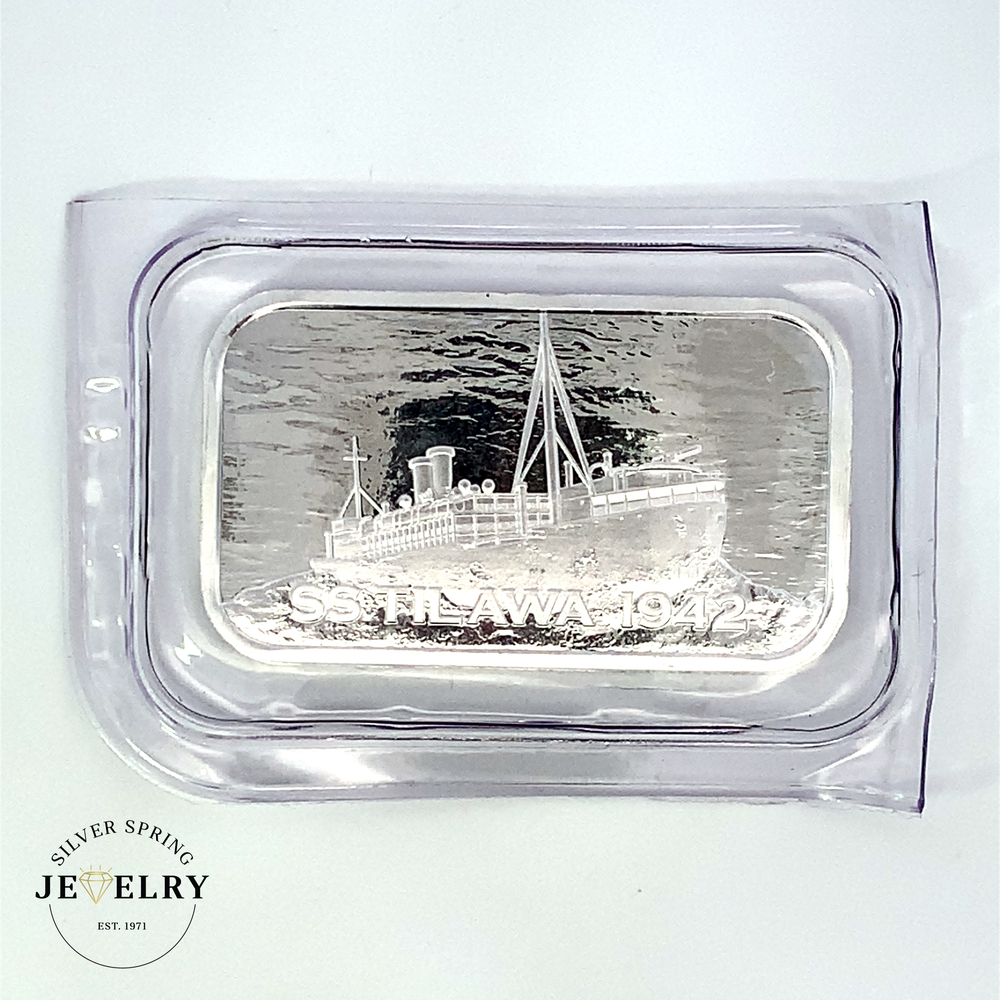 This 1oz silver bar is .999 fine silver from the SS Tilawa 1942 shipwreck. A historic treasure, it's been recovered from the World War II British armed merchant ship, offering a unique item for collectors or silver enthusiasts. Meticulously refined and cast for optimal purity, these limited-edition bars give owners a tangible piece of maritime history. This captivating piece is not only an investment in precious metal but also a memento of a significant wartime event.