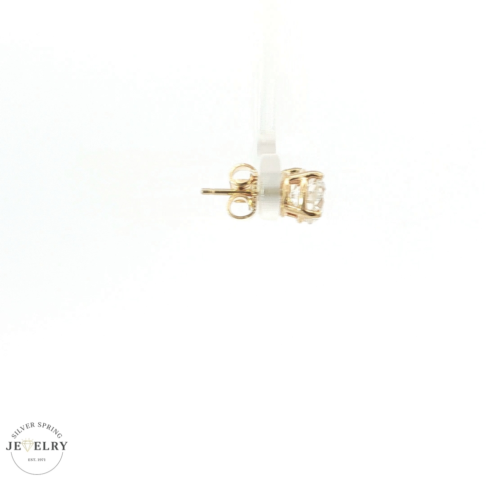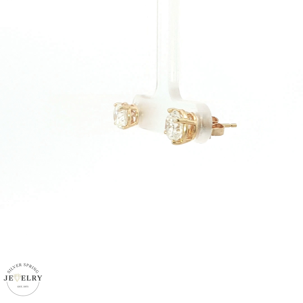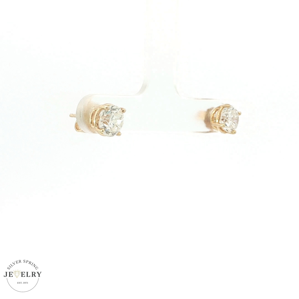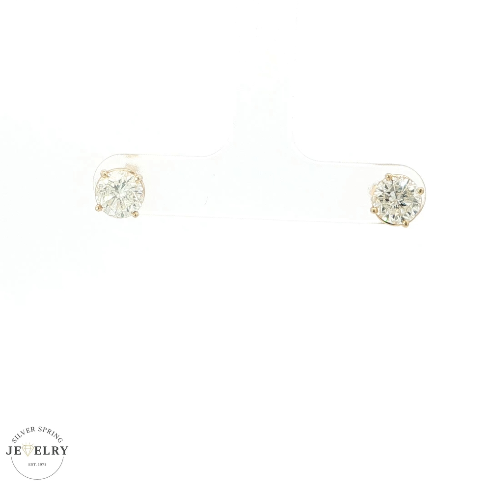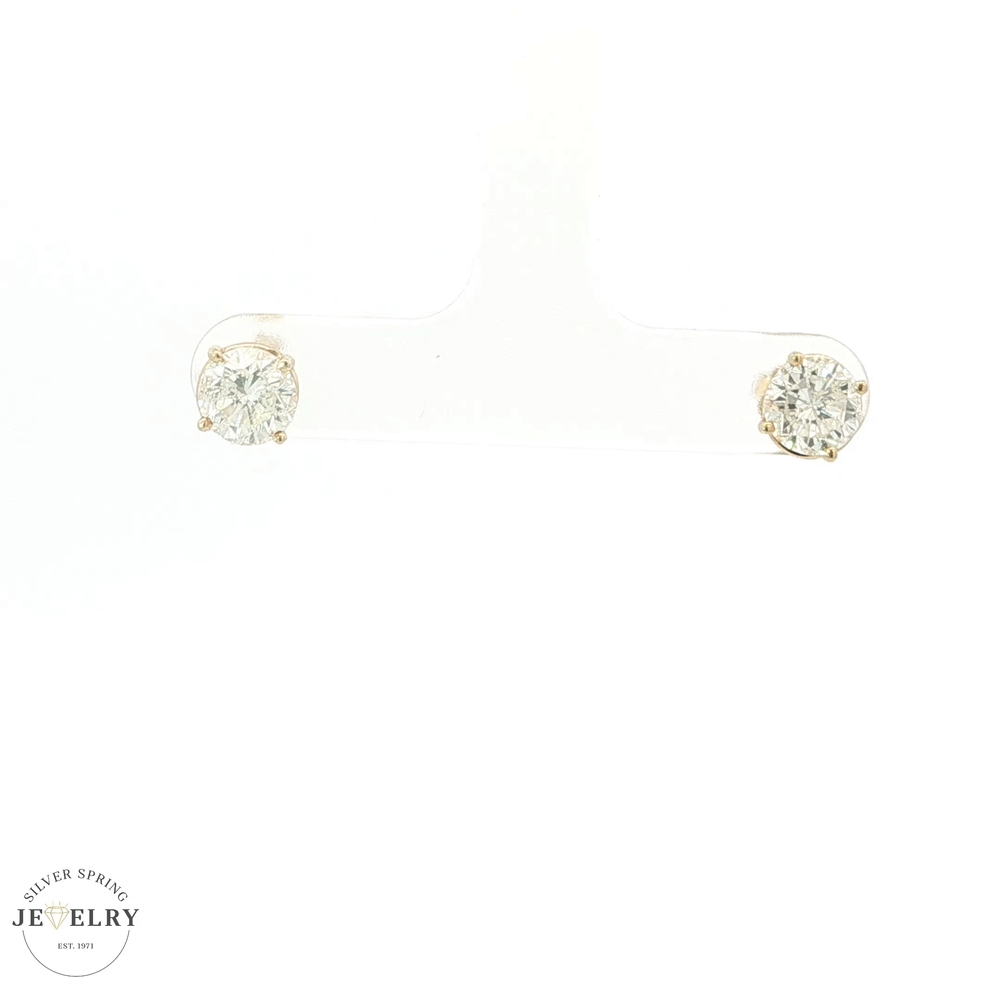 Elevate your style with these stunning 14k yellow gold stud earrings, featuring two 1-carat round diamonds for a total weight of 2 carats. Each earring showcases a diamond with I1 clarity and a J color grade, adding a brilliant sparkle. The earrings are beautifully crafted in an excellent basket setting and are secured with friction backs for a comfortable fit. These earrings are a must-have addition to your jewelry collection.