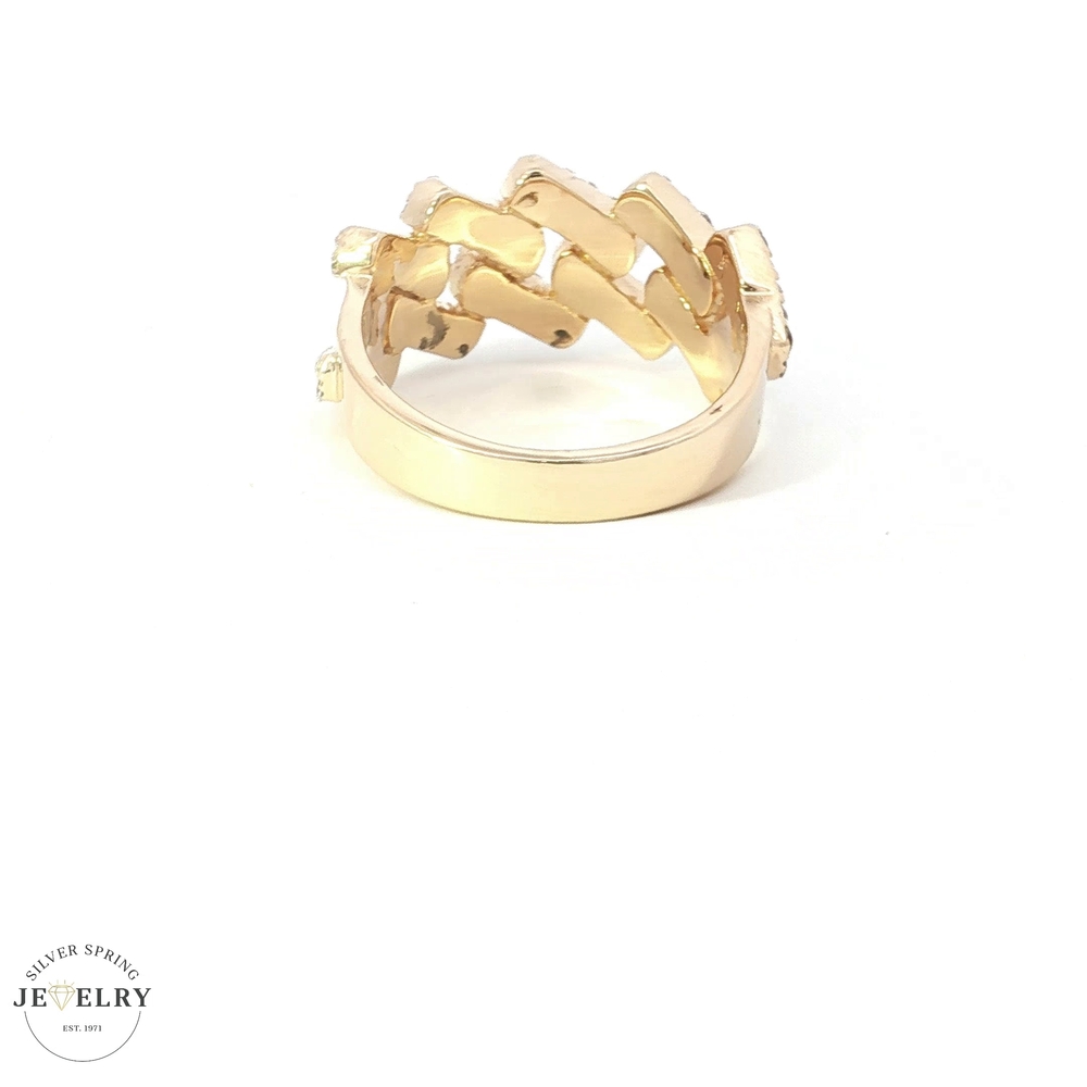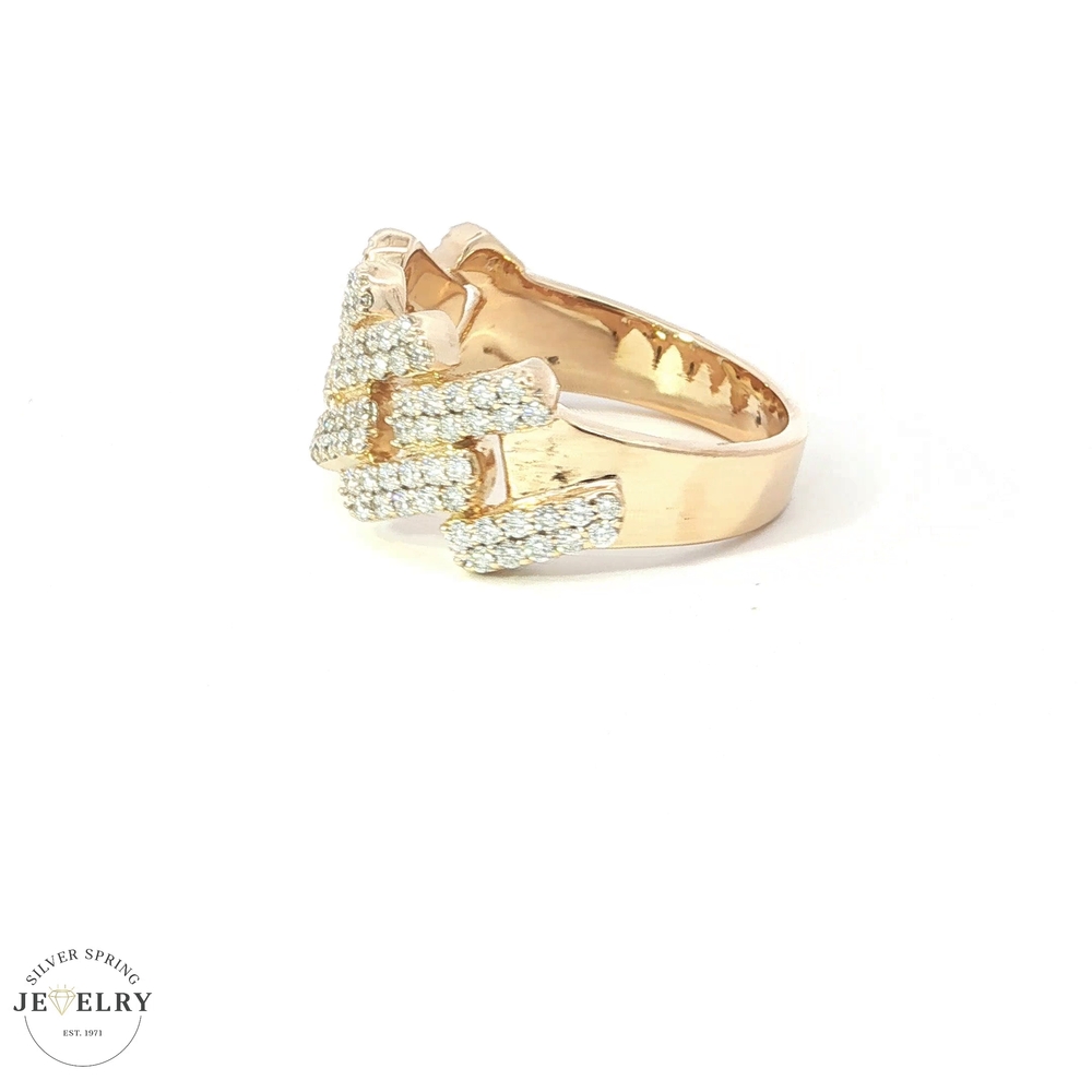This 10K gold ring features a distinctive Miami Cuban design, showcasing square links adorned with 110 delicately set round diamonds. Each diamond weighs 0.01 carats and boasts F-grade color and VS clarity, ensuring a stunning and flawless sparkle. The ring weighs 8.60 grams, demonstrating its substantial quality and durability. Its size is 10.5, making it comfortable for most men. This sophisticated ring seamlessly combines classic diamonds with a modern design, making it an exquisite addition to any jewelry collection.