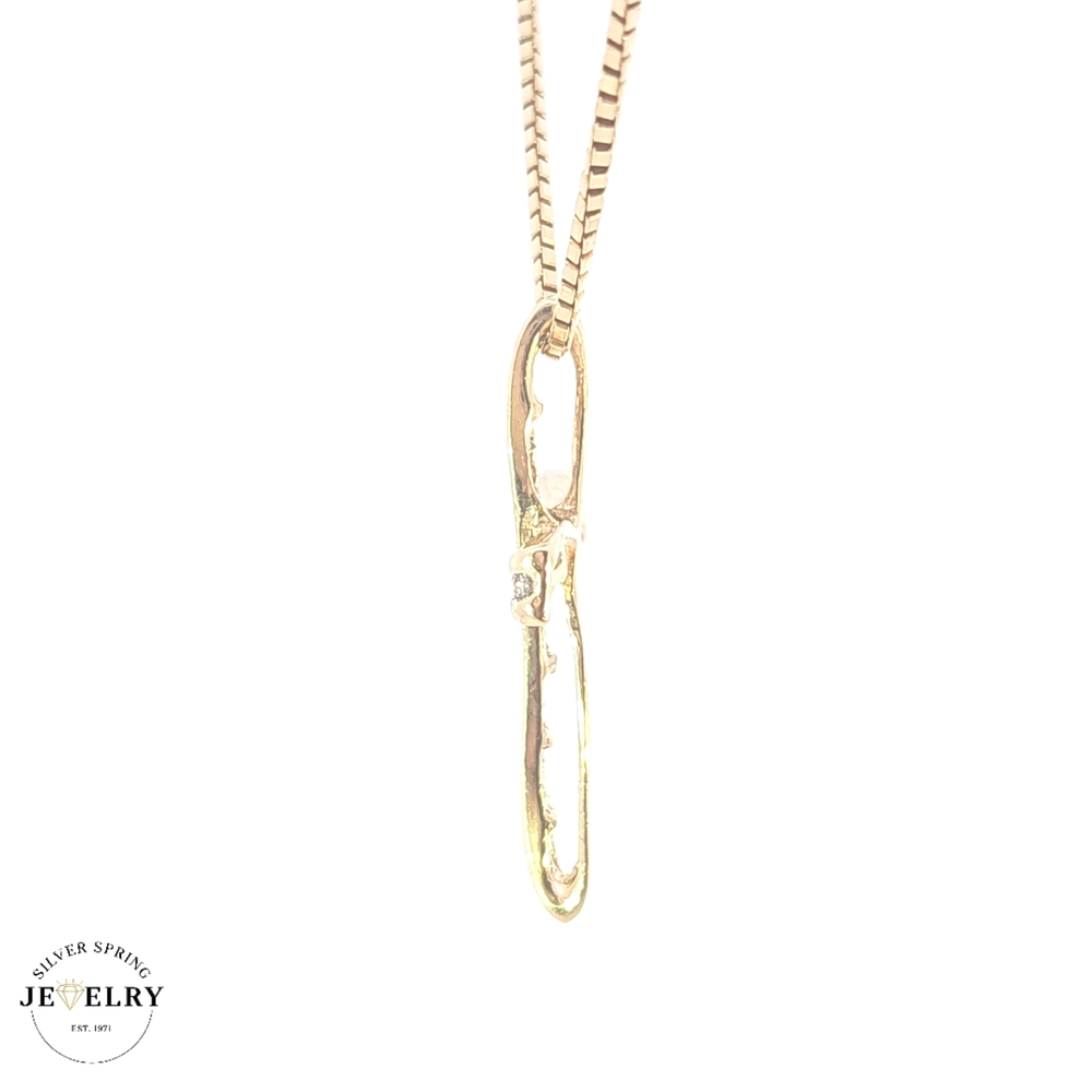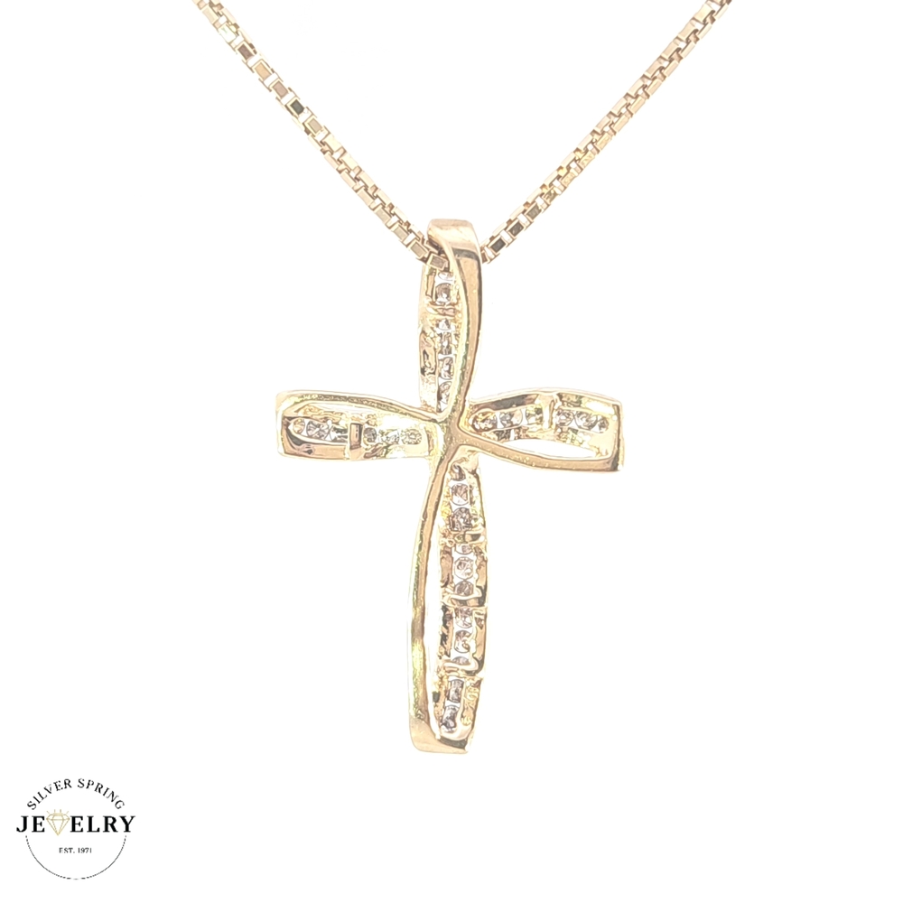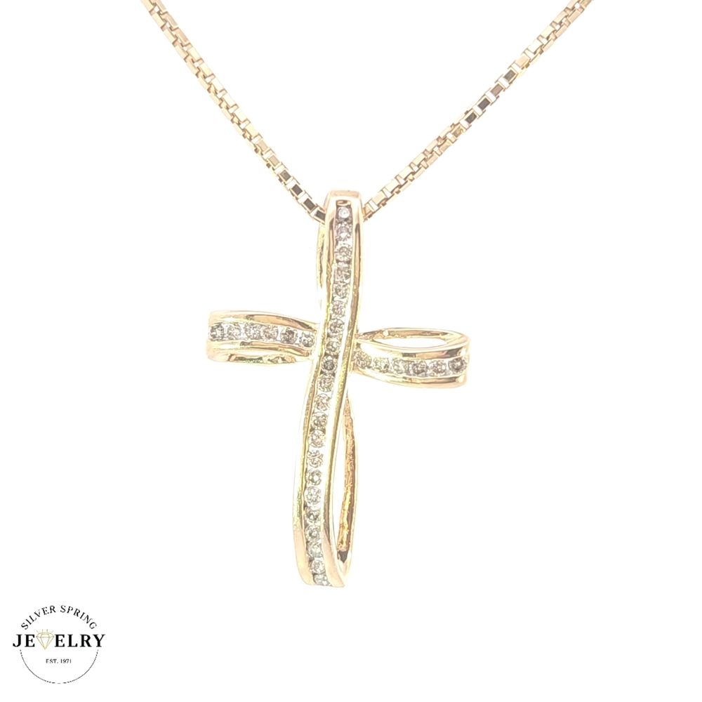 Introducing our timeless Cross Pendant, crafted in pure 10kt gold weighing 2.50 grams. Its unique crossover design stretches 1.25 inches in length and 5mm in width, making a bold yet elegant statement. At its heart sits a dazzling diamond, approximately 1ct, adding a radiant touch. This pendant perfectly blends tradition with luxurious charm, making it an ideal gift or personal keepsake. With its superior quality and design, it promises to add a sparkle to any look.