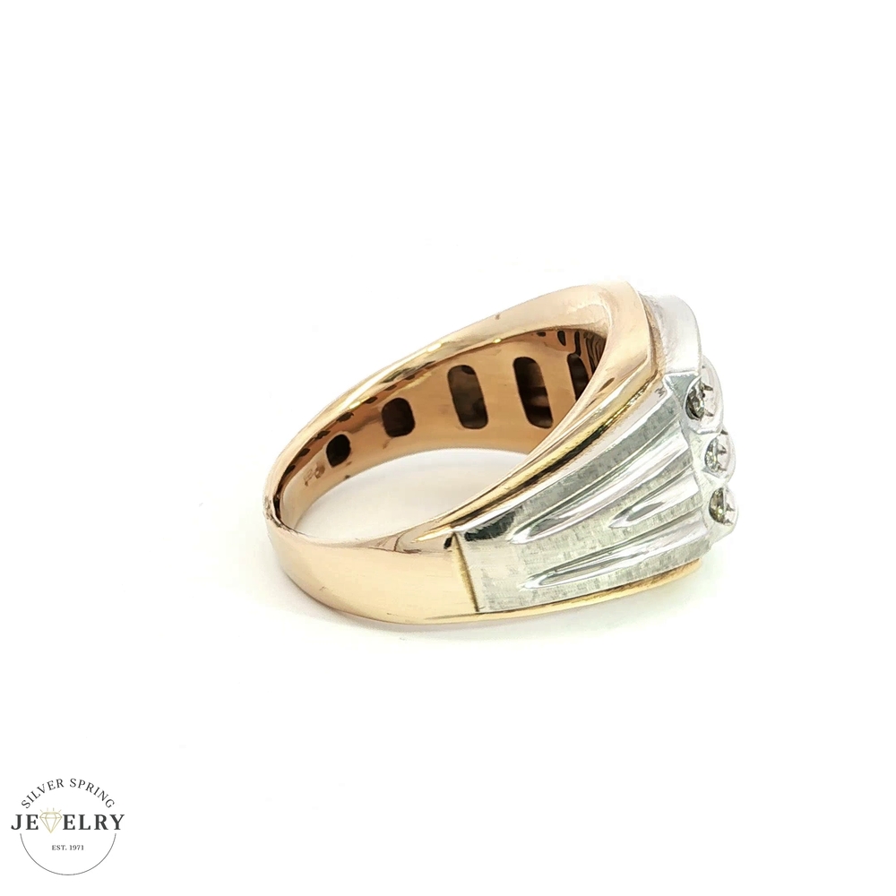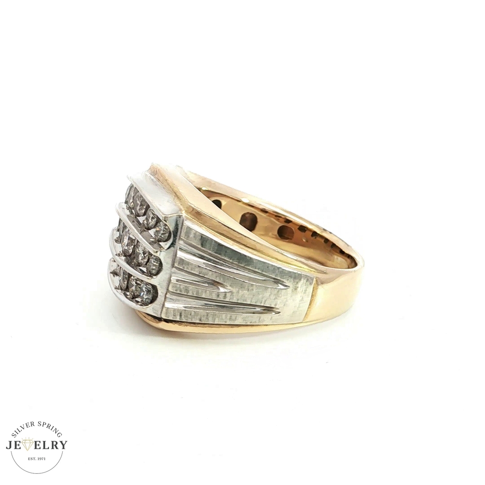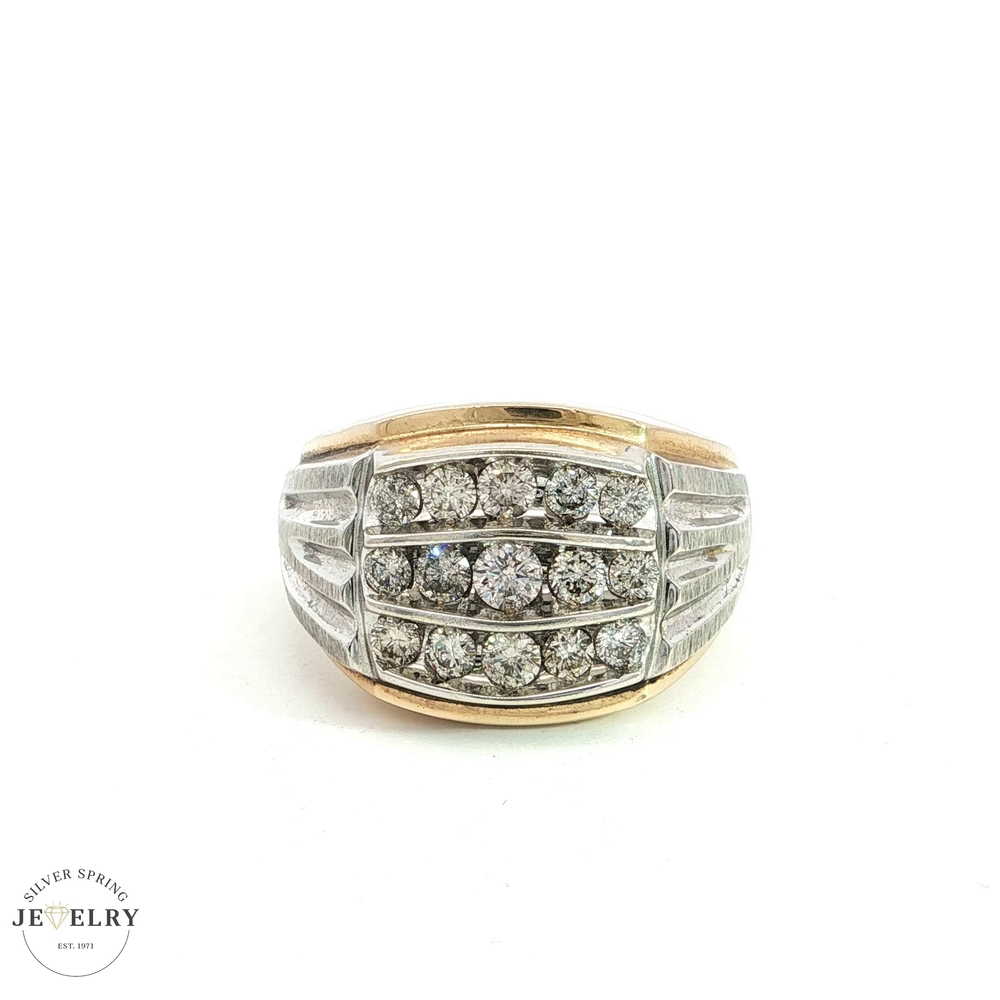 This exquisite 14k diamond signet ring is a statement of sophistication and elegance. Weighing 9.00 grams, the ring showcases a delightful assortment of diamonds, including a central .15 ct stone, supplemented by eight .10 ct diamonds and six .06 ct diamonds. All the diamonds are of J color and SI2 clarity, with a total diamond weight of 1.31 ct. A remarkable testament to craftsmanship, this ring exudes a luxurious charm that is truly timeless. It is a splendid addition to any jewelry collection and symbolizes both style and luxury. This piece is not only a beautiful accessory but also an investment that will be cherished for generations.