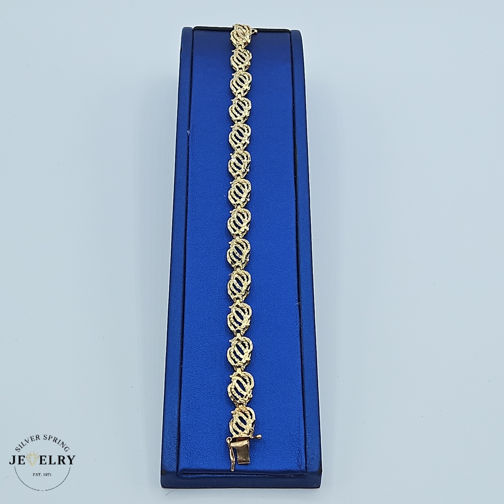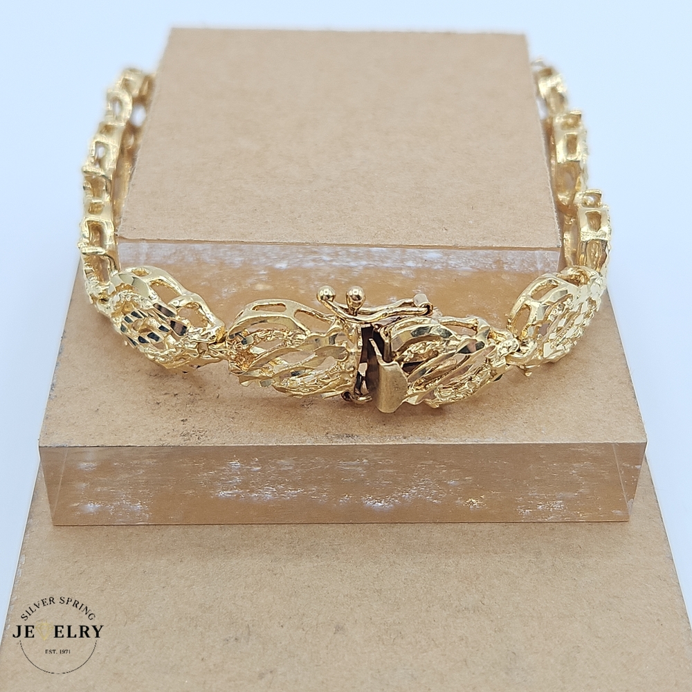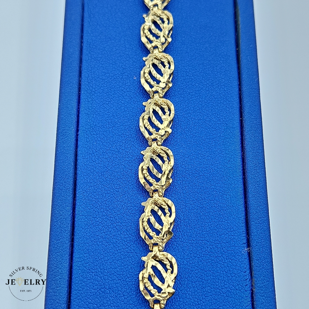 Experience the luxurious elegance of this 14kt gold bracelet. This exquisite piece weighs 13.5 grams and displays a distinctive diamond-cut design. With an 8.5mm diameter, it presents a substantial yet sophisticated profile. The bracelet measures 7 inches, making it a versatile accessory for a wide range of wrist sizes. A timeless addition to any jewelry collection, it combines quality, style, and durability. This diamond-cut bracelet effortlessly blends opulence and charm, making it an ideal addition to any outfit.