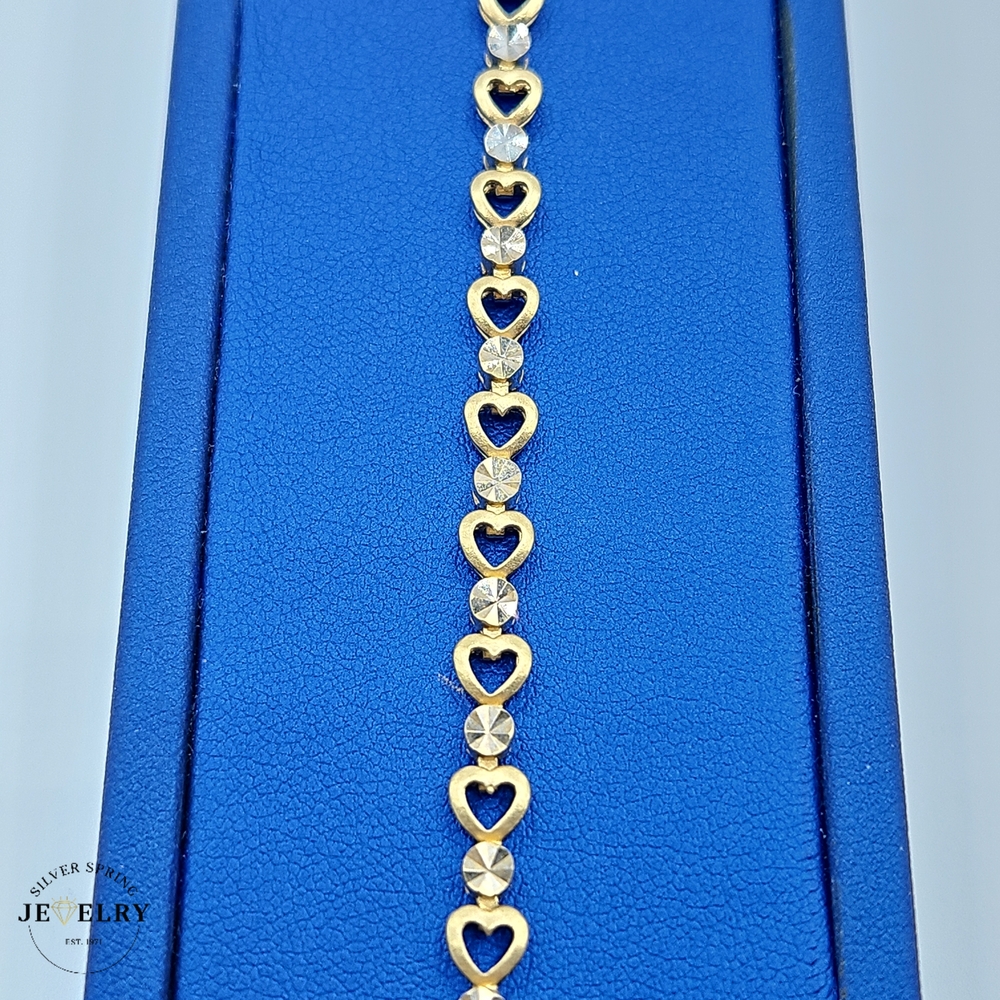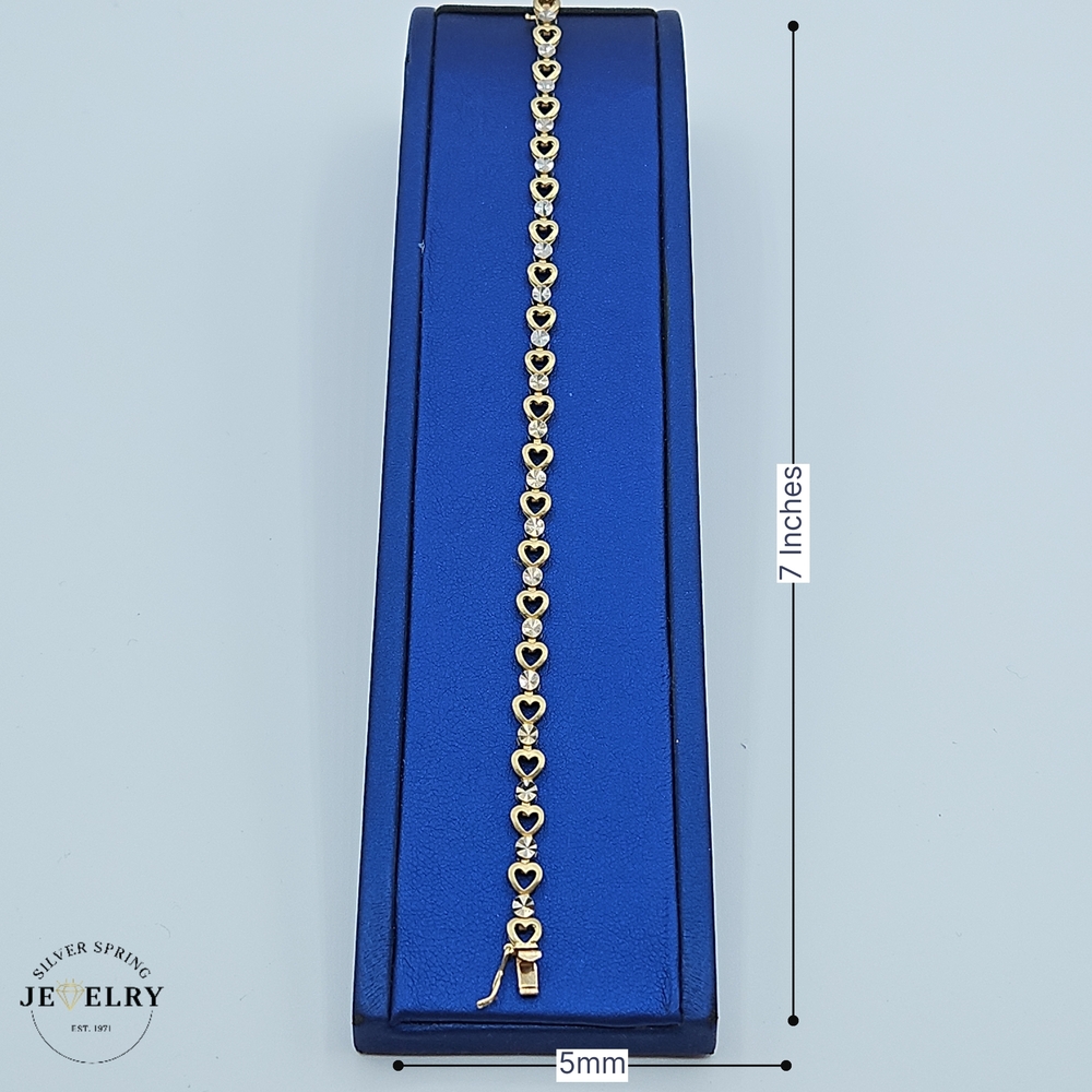 Introducing our charming Heart & Dia Cut bracelet, skillfully crafted from exquisite 14kt gold. Weighing a substantial 6.80 grams, this piece offers durability alongside undeniable elegance. It features a width of 5mm for a delicate and versatile profile. The bracelet measures 7 inches in length, fitting comfortably around your wrist. This stunning piece pairs beautifully with any outfit, adding a sleek touch of luxury to your everyday or special occasion wardrobe.