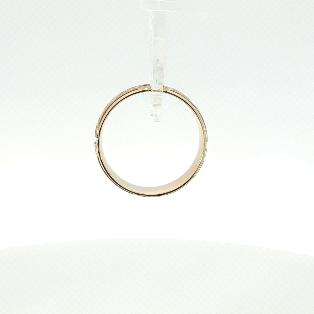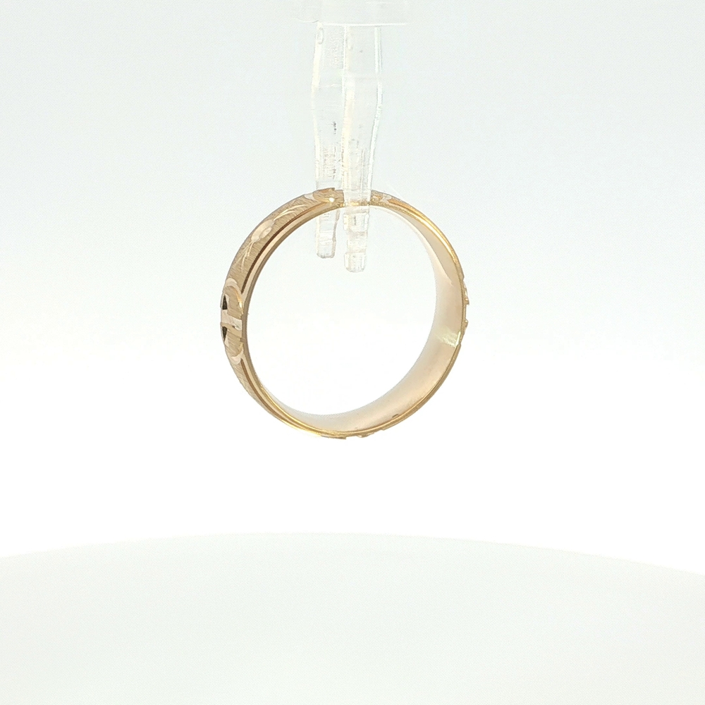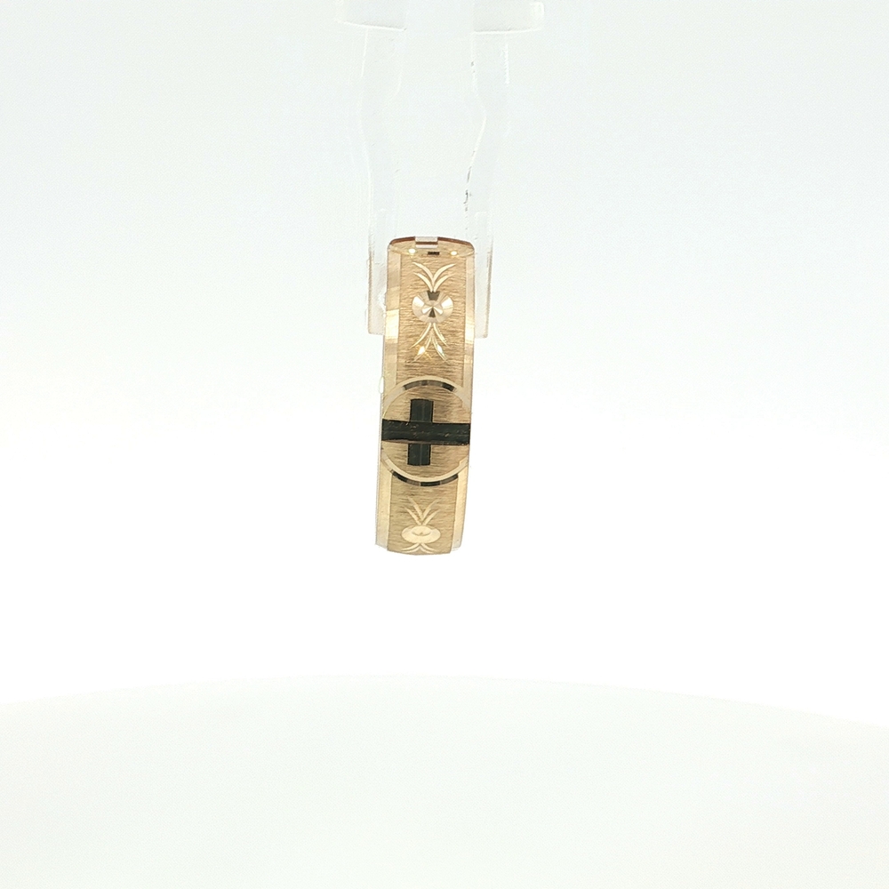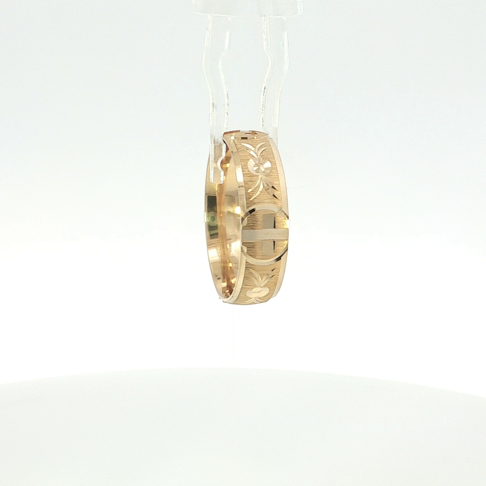 This beautifully crafted wedding band is made from 14k yellow gold and measures 6mm in width, available in size 10. It features a unique design of an olive branch and a cross, which are powerful symbols of peace and faith. This band is not just a piece of jewelry; it represents your eternal commitment. Weighing 5.8 grams, it combines sturdiness with intricate artistry seamlessly. This wedding band can make your special day even more memorable with its radiant glow and deep sentimental value. It serves as a testament to your love and is a wonderful addition to any jewelry collection.
