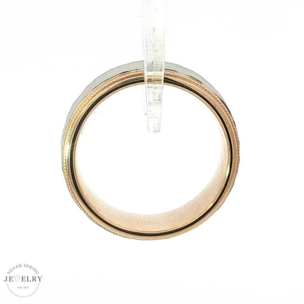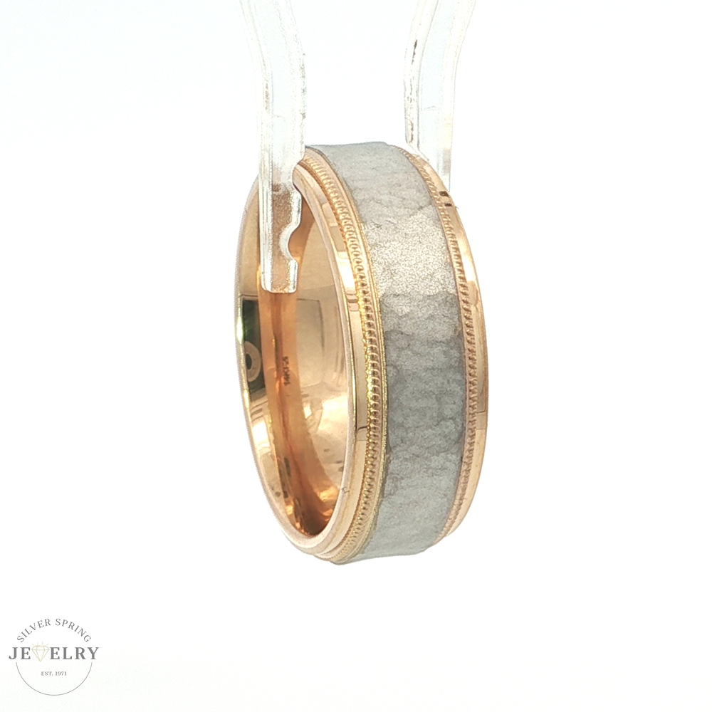 This stunning 14 Karat Gold Two-tone 8mm Carved Design Band beautifully combines elegance with uniqueness. The ring features a hammered-finished 14 Karat White Gold center that catches the light, creating a shimmering effect. Additionally, it is embellished with a 14 Karat Yellow Gold and Milgrain design along the high-polished edge, making it an ideal choice for anyone who appreciates classic yet stylish jewelry. It is available in size 7 and weighs approximately 8.3 grams, ensuring a sturdy and substantial feel on the finger. Treat yourself or gift this mesmerizing ring to a loved one and enjoy its exquisite charm, which will stand the test of time.