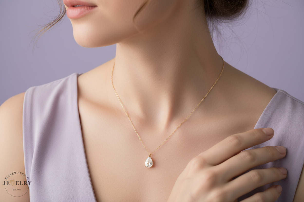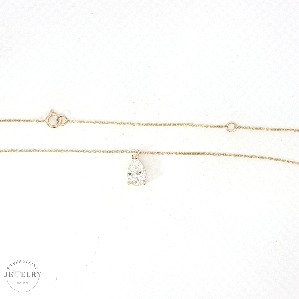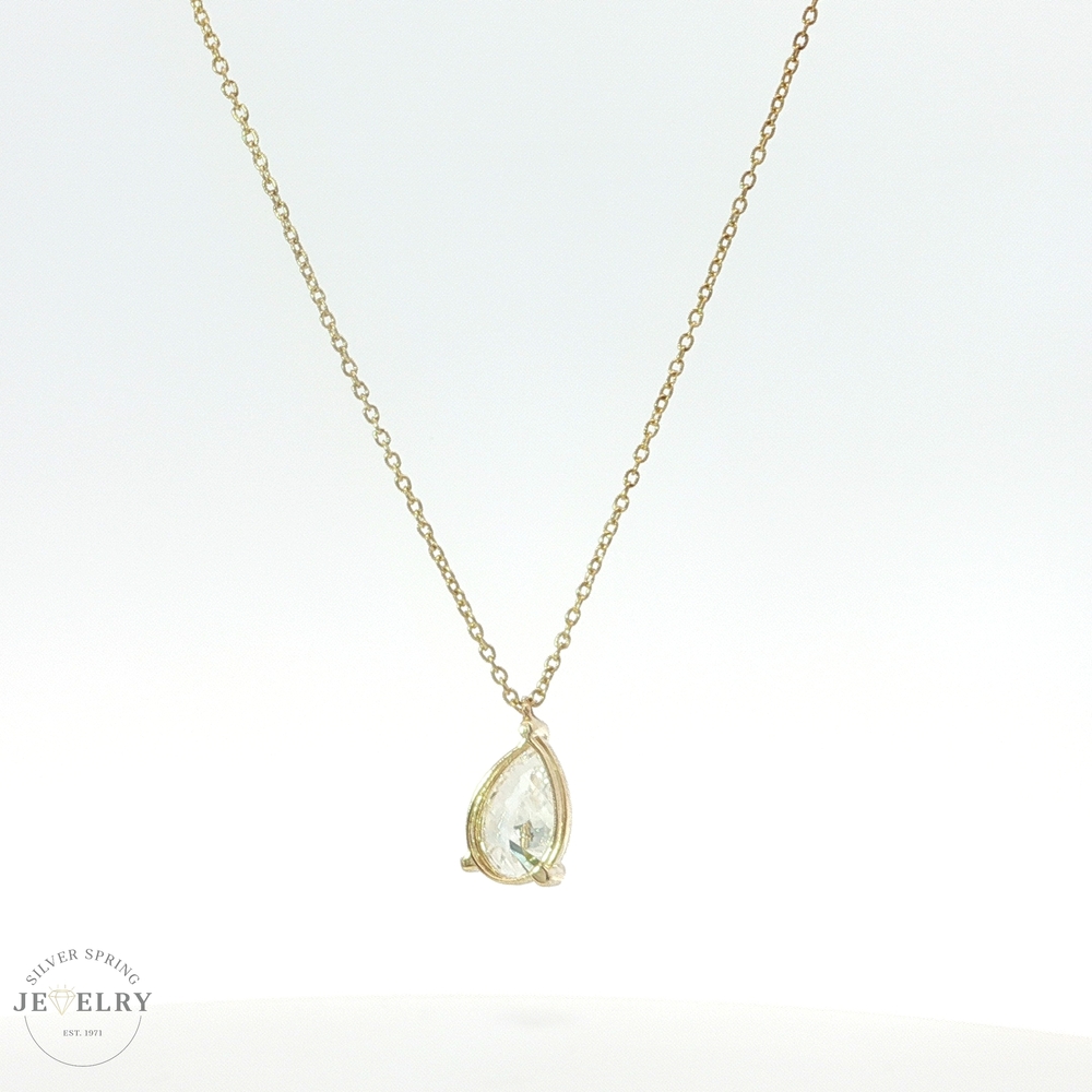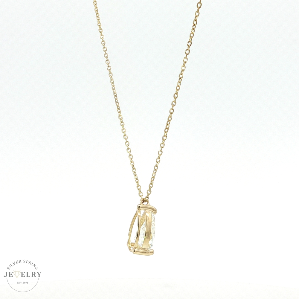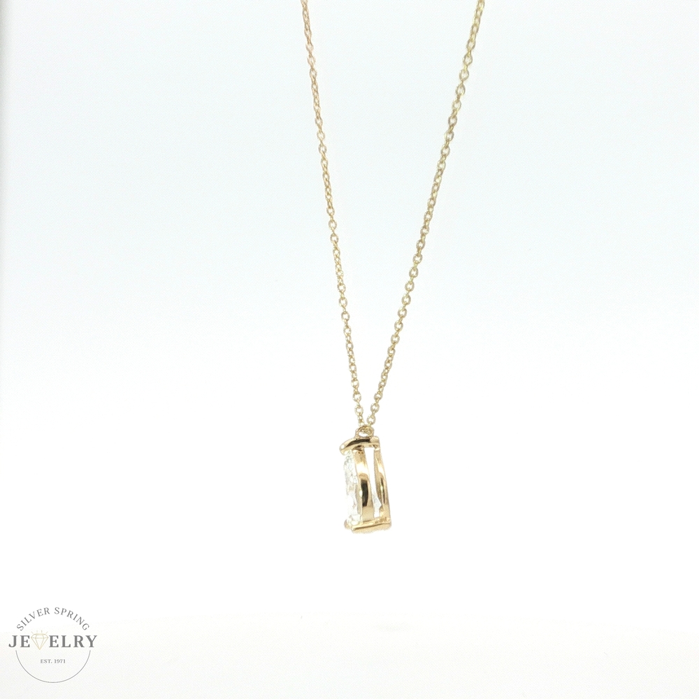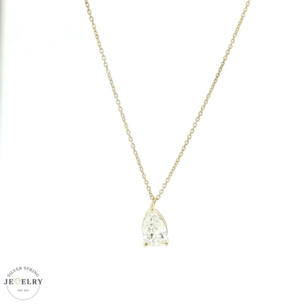This luxurious 14K yellow gold necklace presents a strikingly beautiful 1ct E VS1 pear-cut lab-grown diamond pendant. The diamond, known for its exquisite color and clarity, elegantly suspends from an 18 Cable Link chain. The weight of the gold is approximately 1.4g. This sophisticated piece is known to add upscale style to any outfit with its timeless design. The pendant's captivating sparkle, combined with the richness of the gold chain, ensures this necklace is not only profoundly attractive but also a symbol of elegance and class.