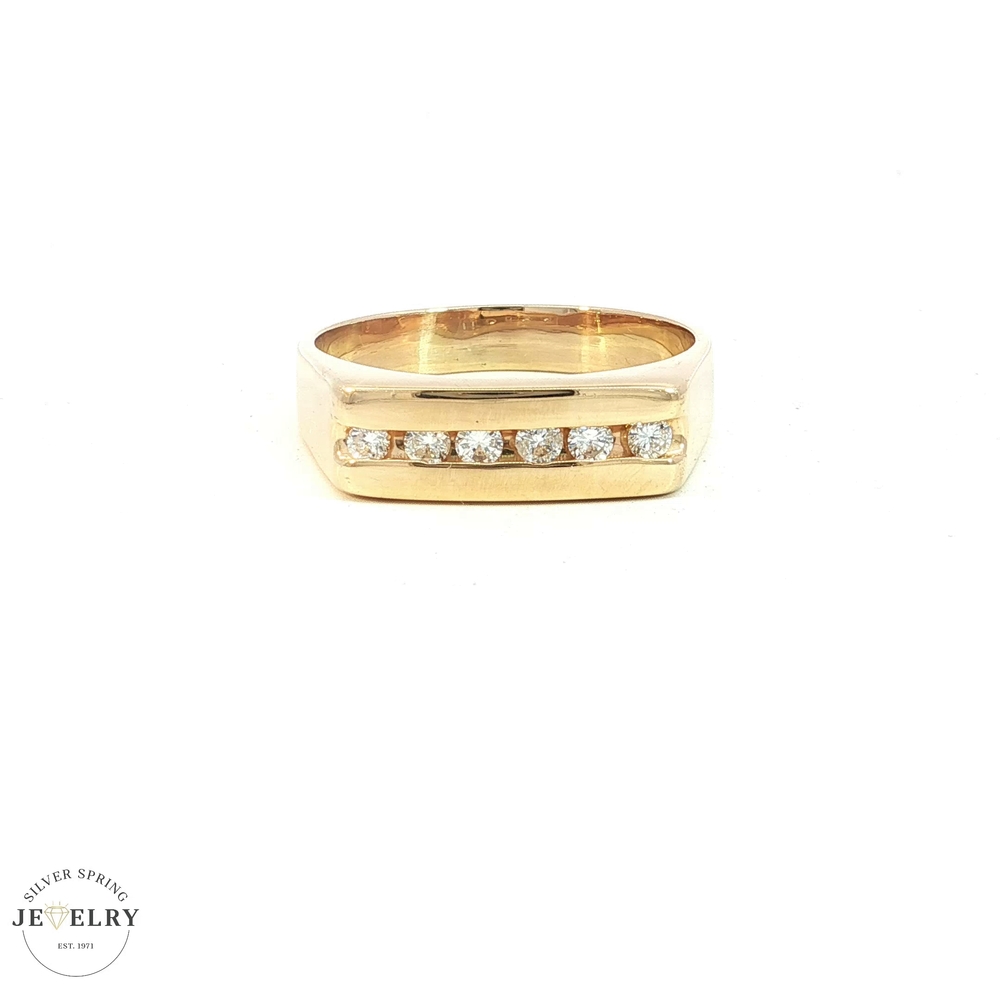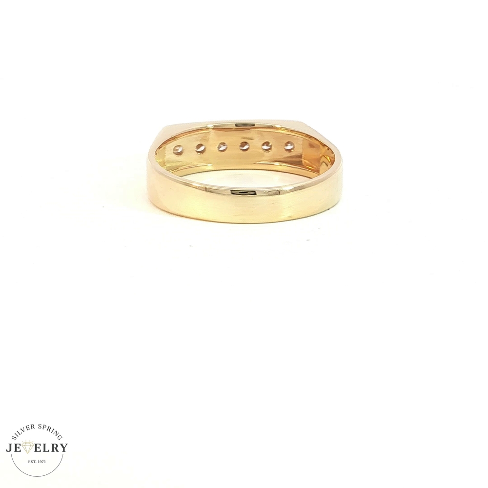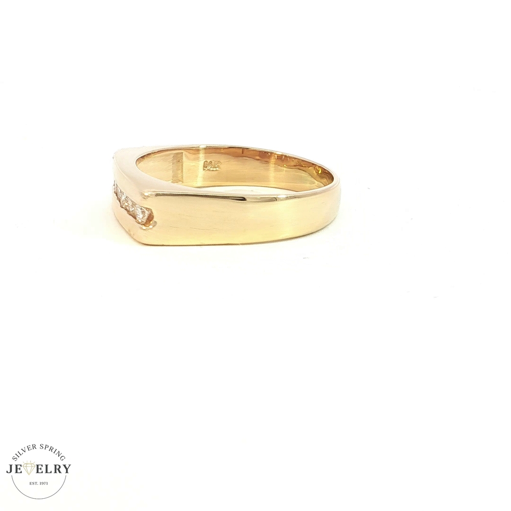 This elegant 14kt yellow gold band weighs 6.80 grams and features a channel set design. It's adorned with five high-quality round diamonds, each weighing 0.05 ct, totaling 0.30 ct. The diamonds are G color and SI1 clarity, offering a perfect blend of sparkle and class. The band comes in a generous size 11, making it an ideal choice for someone seeking a mix of luxury and comfort. Suitable as a wedding band, a gift, or a personal treat, this diamond band exudes timeless appeal.