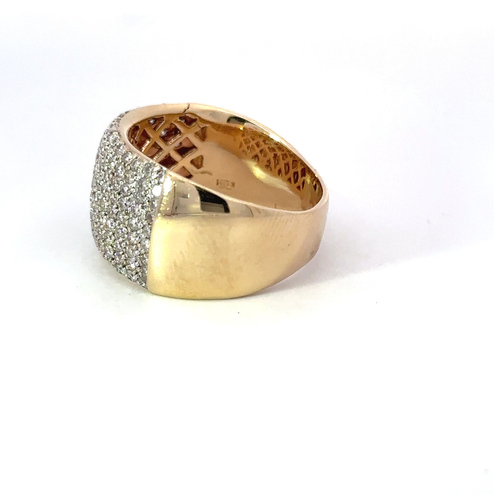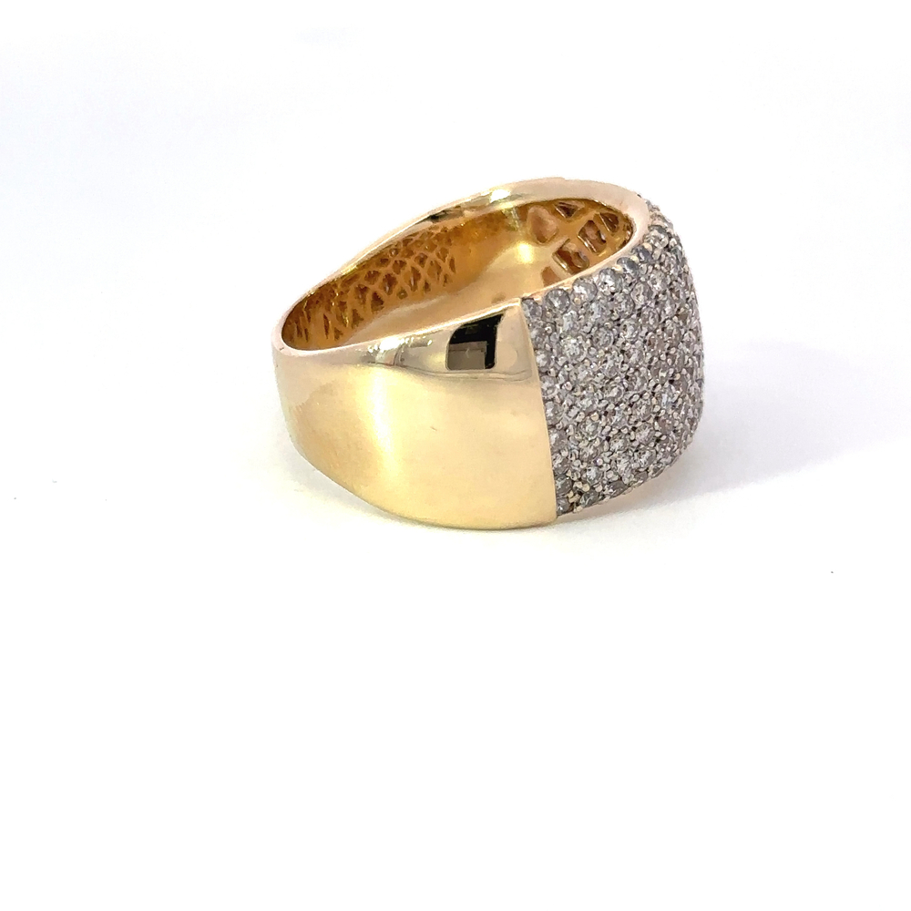 Make a style statement with this exquisite 14k yellow gold diamond ring, accentuated by 1.40 carat round brilliant natural diamonds. The diamond color grades range from H to J, providing a beautiful warm sparkle balanced with an impressive SI1-SI2 clarity. Encrusted in a pave setting, these diamonds glitter from every angle. With a face height of 14.3mm and a rise above the finger of 3.5mm, this cocktail ring has a delightful presence. The band measures 6.3mm wide, offering a comfortable fit. Marked with 14k stamp, this ring weighs approximately 13.65 grams. A perfect blend of luxury and sophistication, it's a must-have!