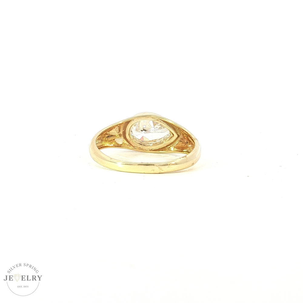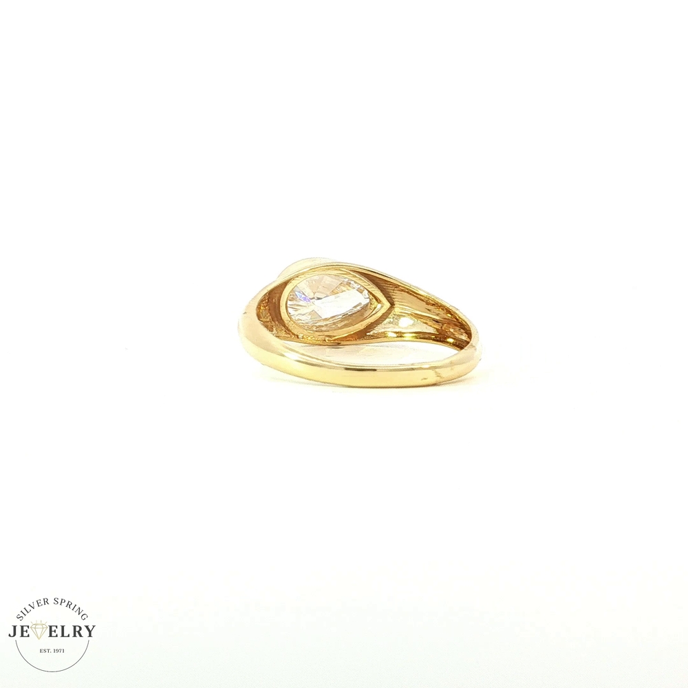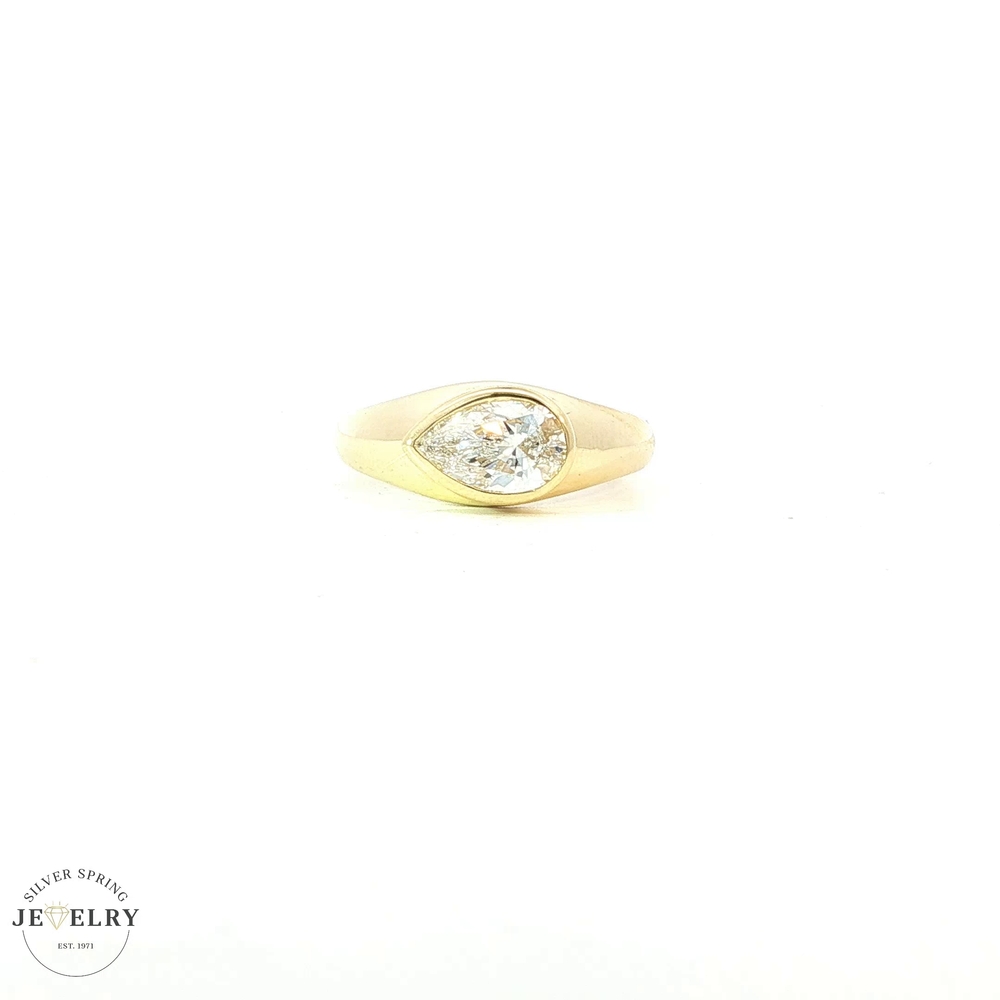 Experience luxurious elegance with this 14K yellow gold engagement ring, adorned with a 1ct D VS2 Pear-cut lab-grown diamond. Expertly crafted in size 7, the diamond exudes exceptional brilliance and sparkle, set in the trendy east-west orientation and secured by a bezel setting. Weighing 1.8g, this exquisite piece offers an affordable alternative to natural diamonds, without compromising on quality and beauty. Ideal for the modern bride seeking a unique, sustainable choice, this ring offers ethereal delight and infinite allure.