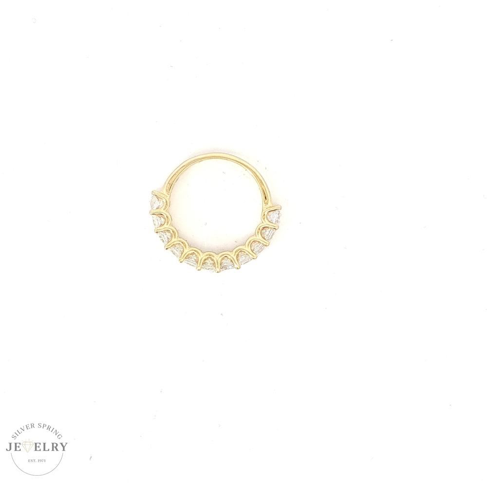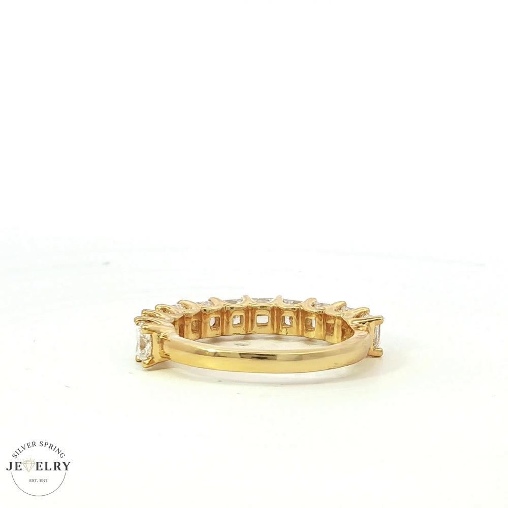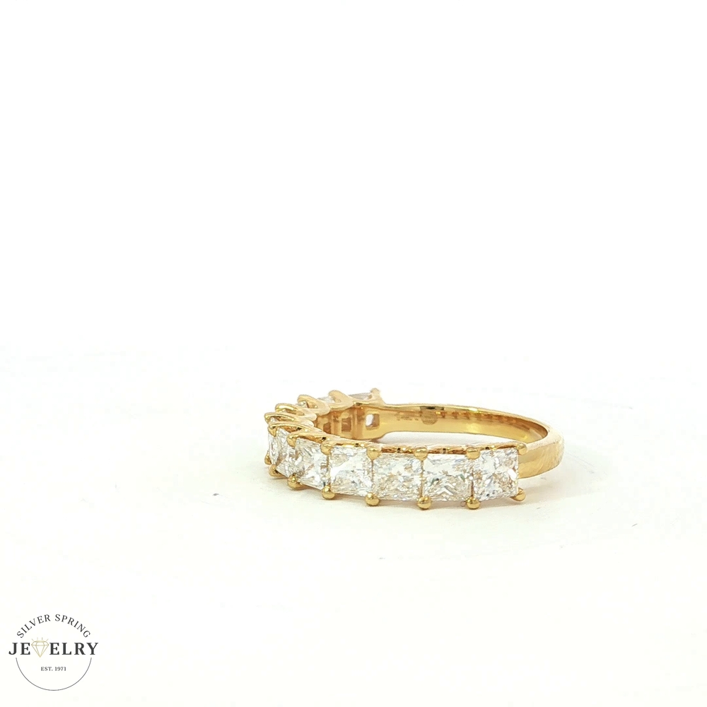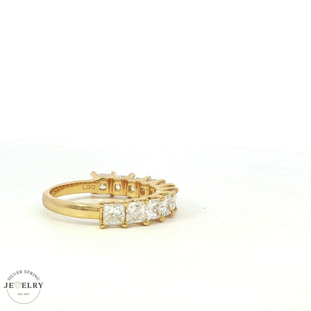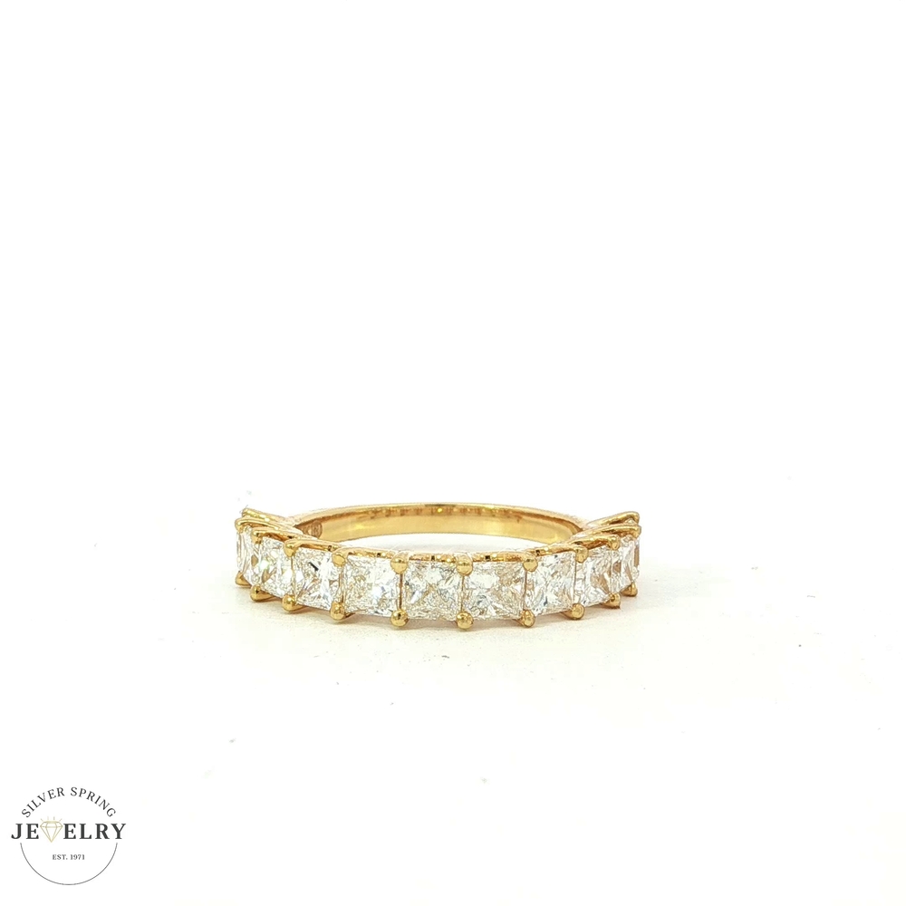 This 14K gold wedding band, weighing 3.8g and fitting a size 7, boasts 11 stunning Princess-Cut lab-grown diamonds, totaling 2.5 carats. The stones have been thoughtfully arranged in a half eternity style, representing eternal love. Lab-grown diamonds, identical to their natural counterparts in brilliance and beauty, uphold ethical sourcing standards. This handcrafted band is not only a testament to exquisite craftsmanship but also a symbol of sustainable luxury.
