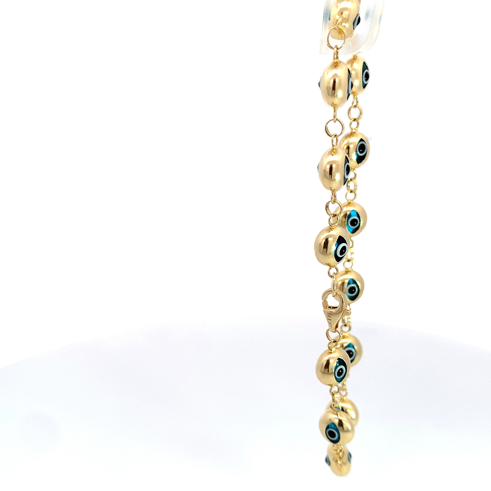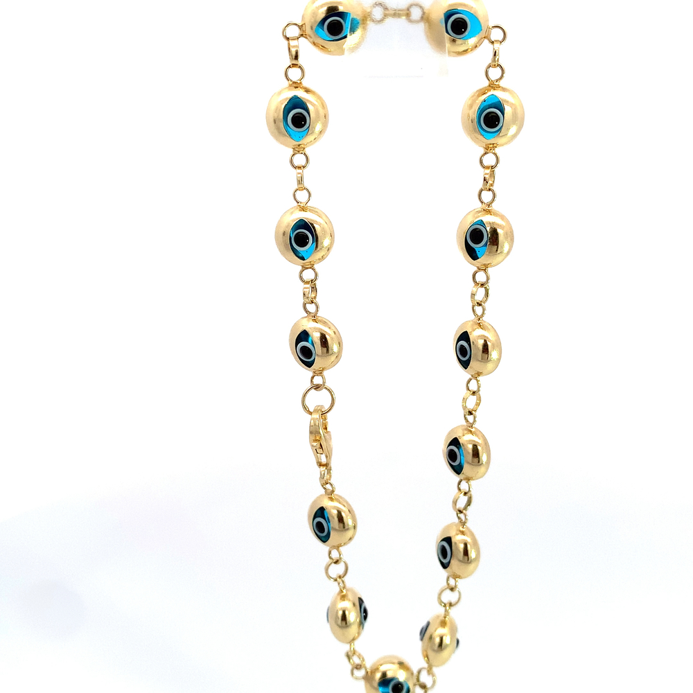 This stunning 14kt yellow gold bracelet has a weight of 7.40 grams and measures 7.5 inches in length. One of its main features is the striking Evil Eye design, believed to offer protection and ward off negative energy. Handcrafted with precision, it exhibits superb craftsmanship. This piece is an amalgamation of luxury and spirituality, a symbol of luck and good fortune. Its lustrous finish makes it an elegant accessory suitable for both everyday wear and special occasions. Known for its allure and resilience, this yellow gold bracelet is not only an excellent fashion statement but a lasting investment.
