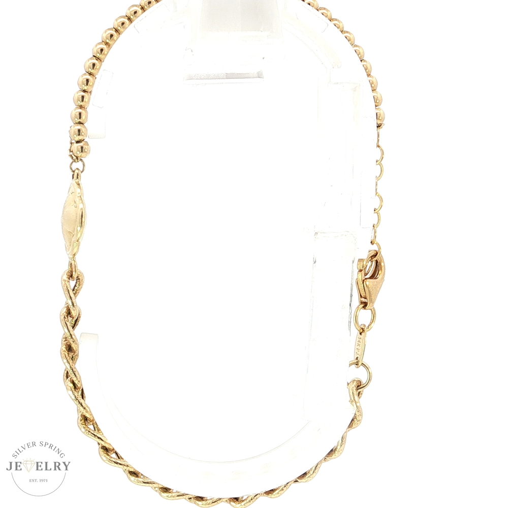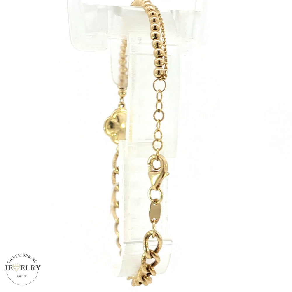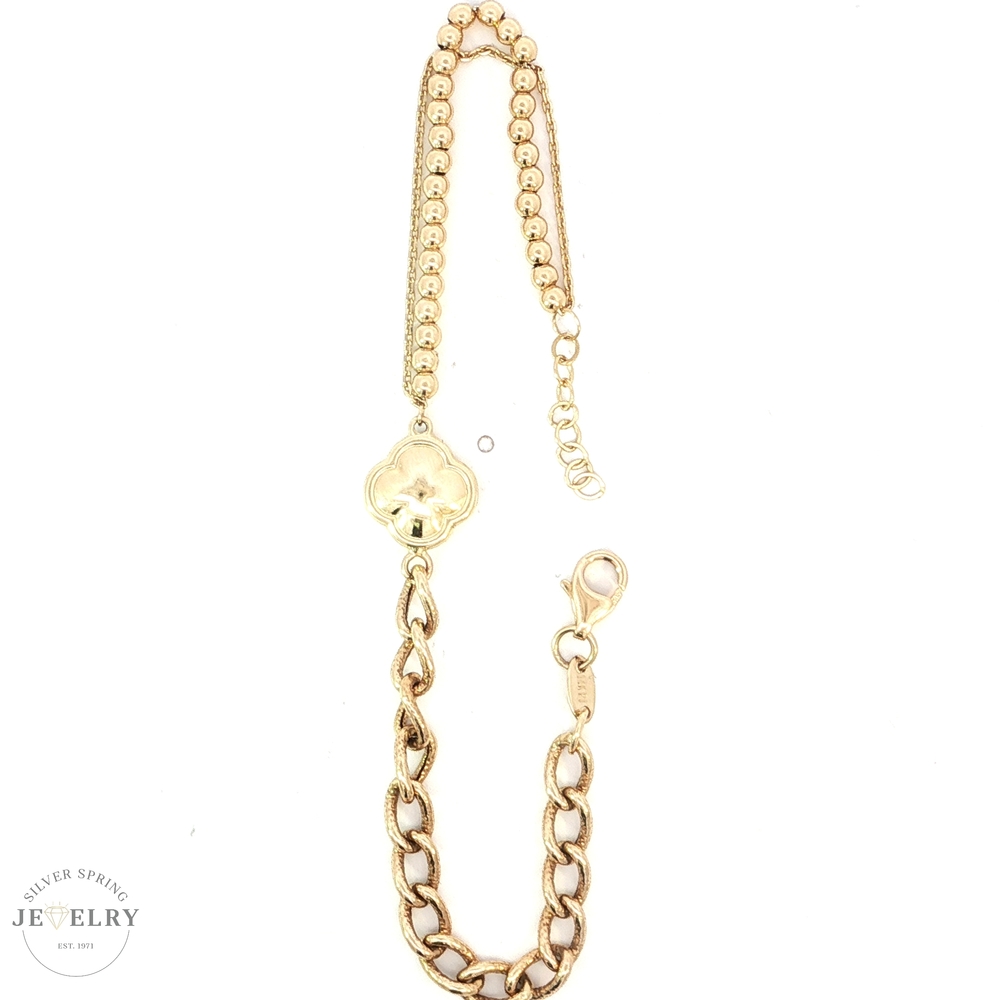 This exquisite 14K yellow gold 7.5-inch bracelet is a stunning blend of elegance and style. Weighing 3.5g, it features an innovative design that beautifully combines half-beaded and half-curb links. The bracelet shines brightly with a delicately designed clover charm at its center, adding a touch of luck and sophistication. The charm is finely crafted, adding an enchanting allure to the piece. This carefully crafted bracelet combines durability with luxury. Perfect for everyday wear or special occasions, this versatile piece adds a hint of glamour to any outfit. The exquisite detailing makes it a must-have piece for those who appreciate high-quality jewelry.
