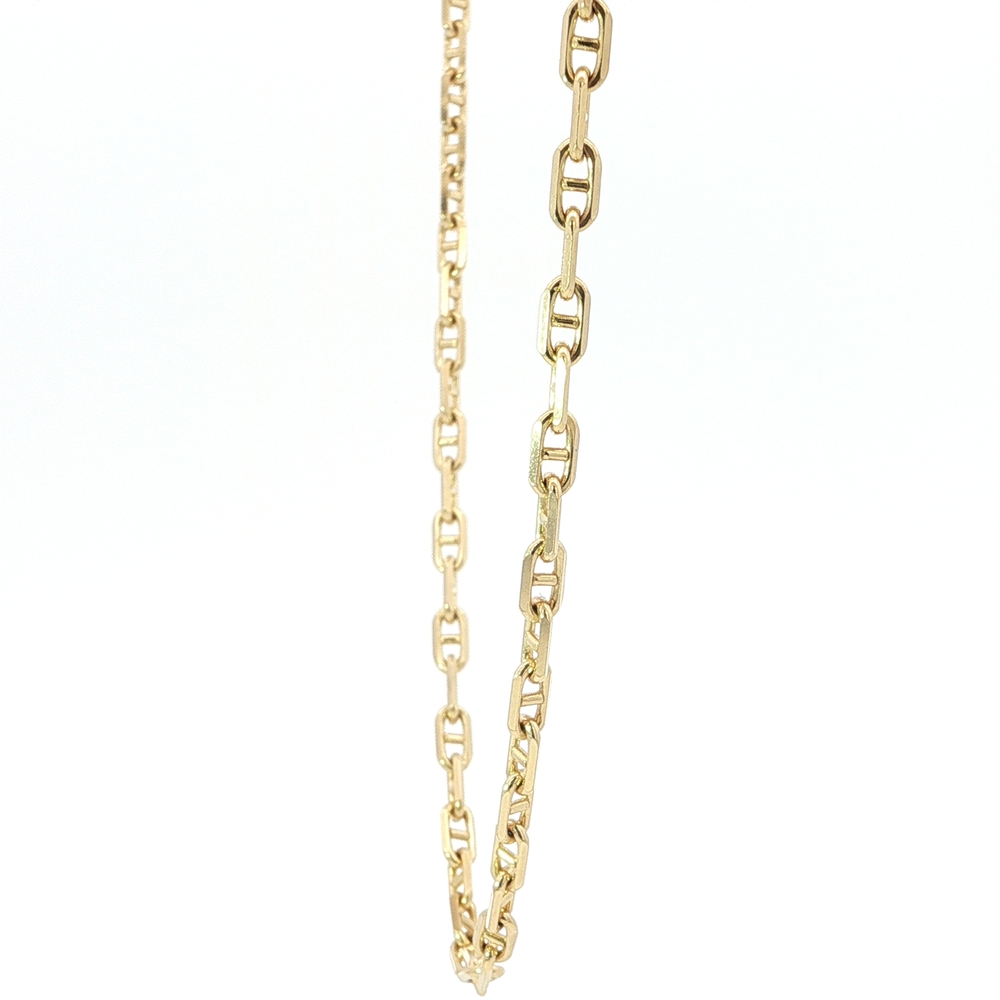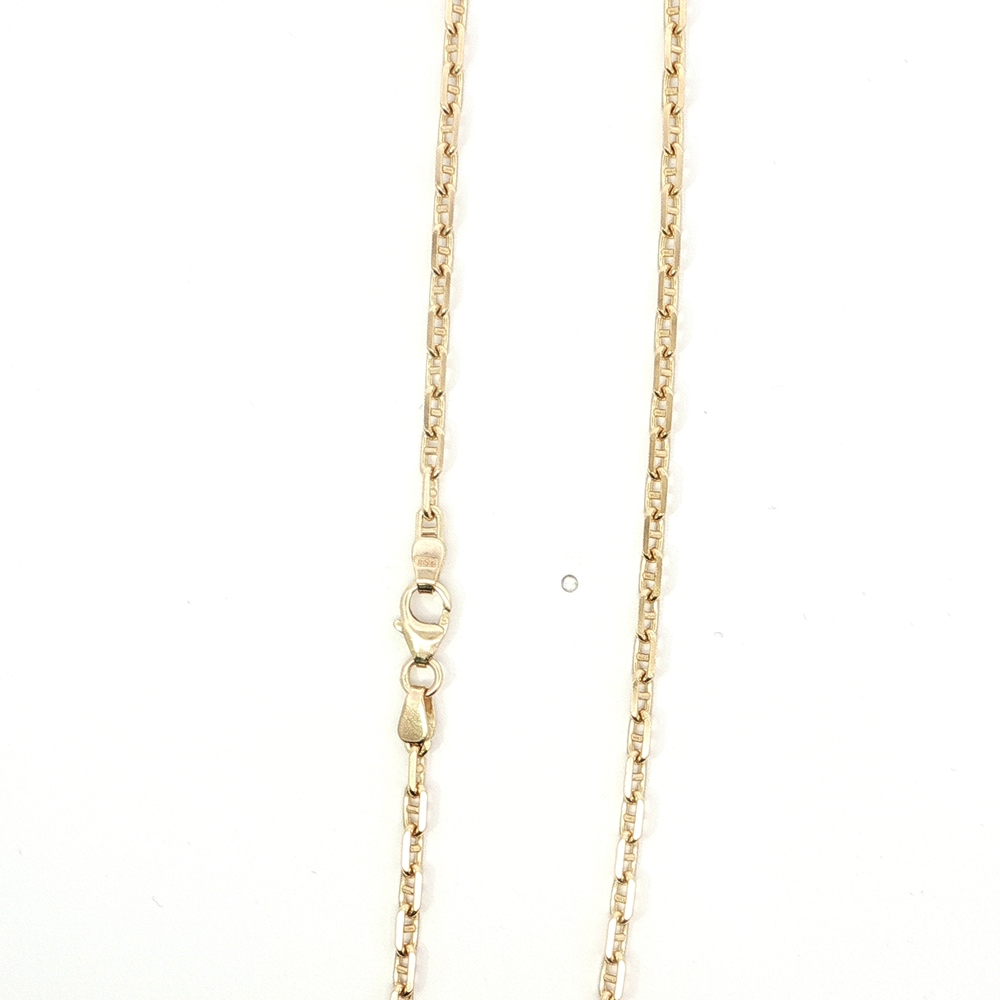 This 14K Yellow Gold Anchor Link Chain is timeless and versatile. Measuring 16 inches long and weighing a solid 7.6 grams, it is a superb addition to your accessory collection. Equipped with a secure lobster clasp, this chain ensures safety and convenience. Its classic anchor link design suits any attire, making it ideal for everyday wear or special occasions. Unisex and highly durable, it is also an excellent gift choice. Immerse in the charm and elegance of this brilliant 14K anchor link chain.